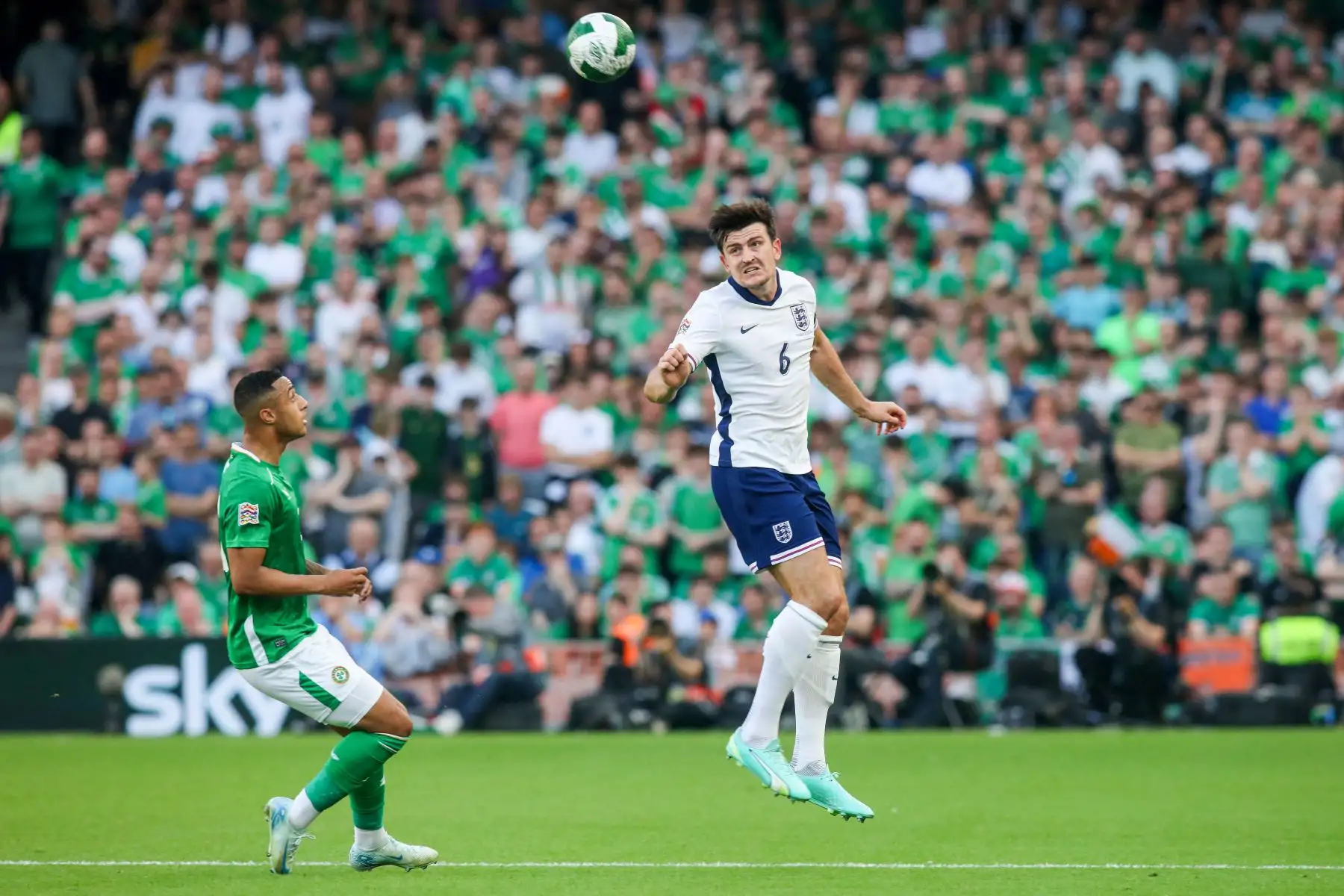 07/09/2024 El defensa de Inglaterra, Harry Maguire, salta para cabecear el balón durante el partido de fútbol de la Liga de Naciones de la UEFA, Liga B, grupo 2, entre Irlanda e Inglaterra. Foto. ANDINA/AFP
