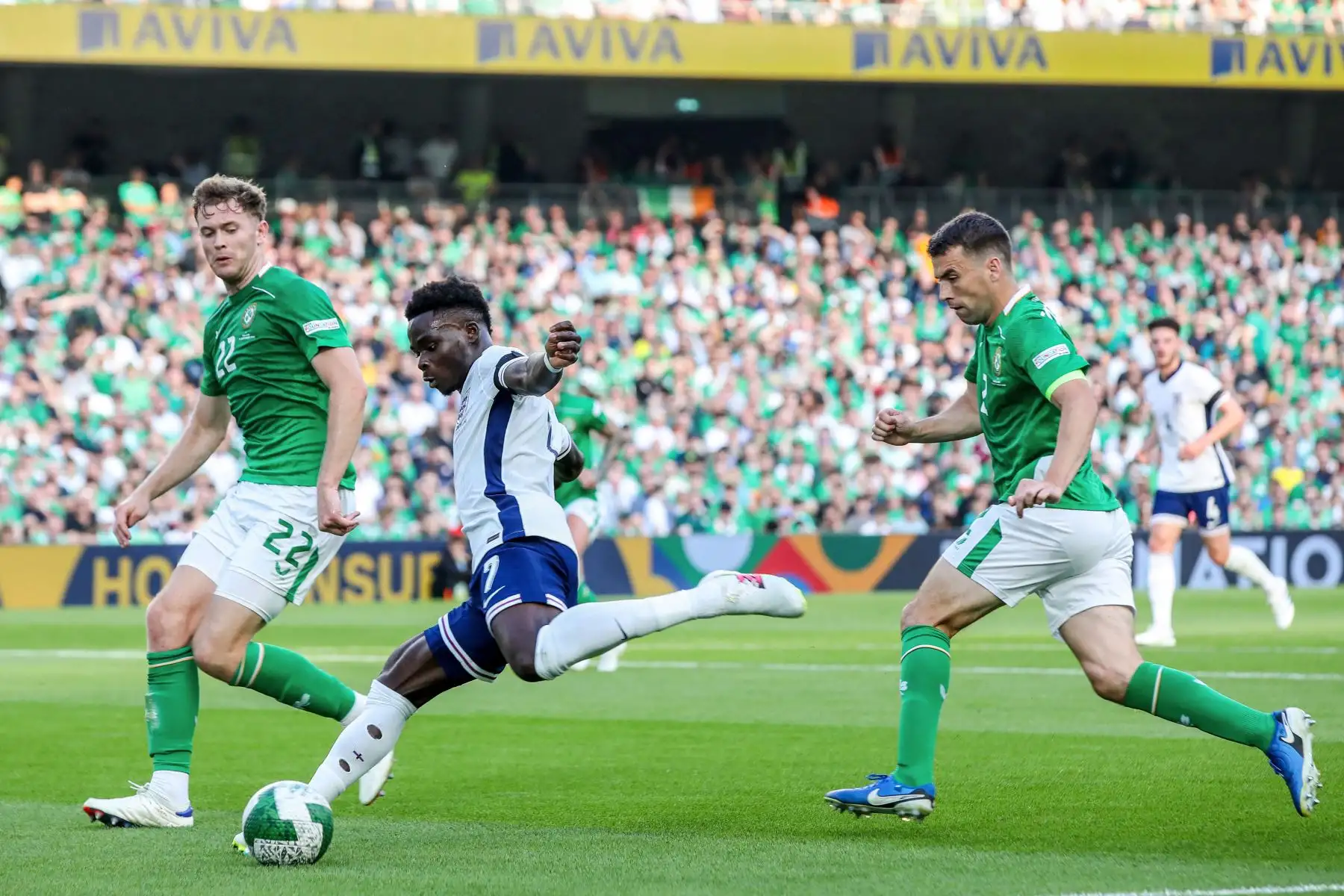 07/09/2024 El centrocampista inglés Bukayo Saka, número 07, cruza el balón durante el partido de fútbol de la Liga de Naciones de la UEFA, Liga B, grupo 2, entre Irlanda e Inglaterra. Foto. ANDINA/AFP