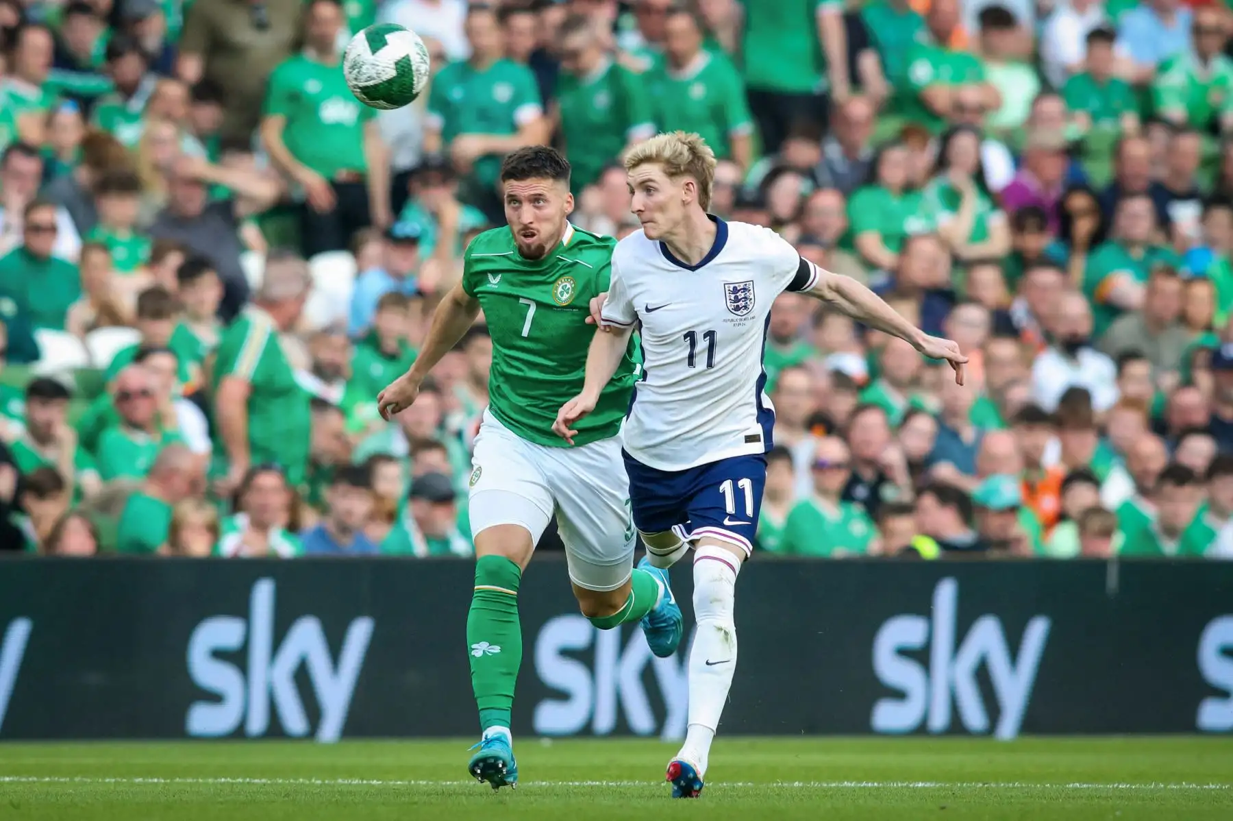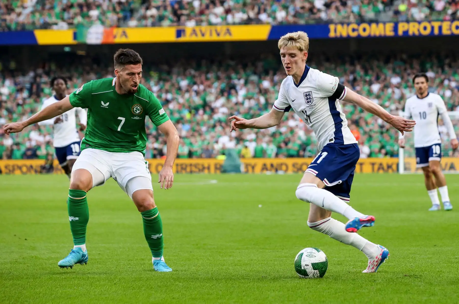 07/09/2024 El centrocampista inglés número, Anthony Gordon, compite por el balón con el defensor irlandés número 07, Matt Doherty, durante el partido de fútbol de la Liga de Naciones de la UEFA, Liga B, grupo 2, entre Irlanda e Inglaterra. Foto: ANDINA/AFP