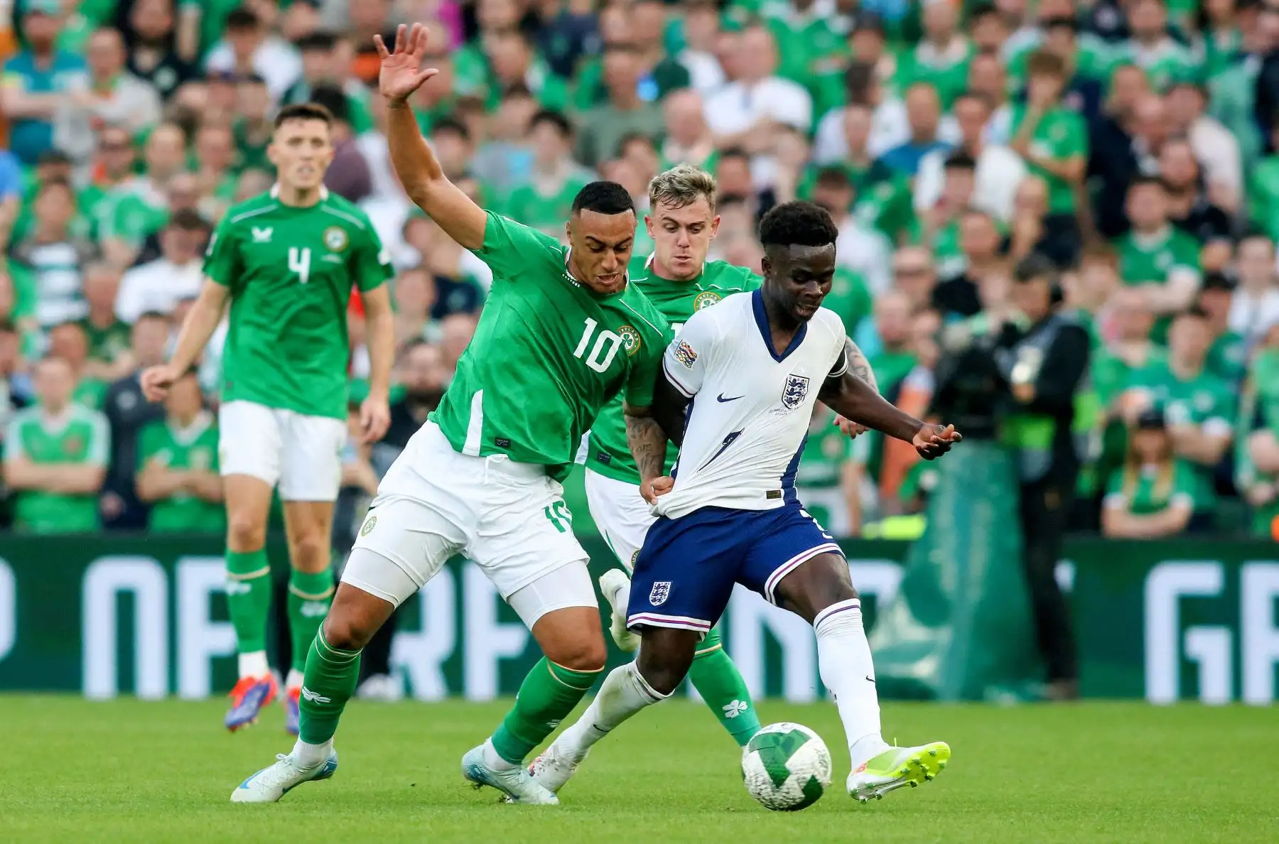 07/09/2024 El delantero de Irlanda, Adam Idah, compite por el balón con el centrocampista de Inglaterra, Bukayo Saka, durante el partido de fútbol de la Liga de Naciones de la UEFA, Liga B, grupo 2, entre Irlanda e Inglaterra. Foto: ANDINA/AFP