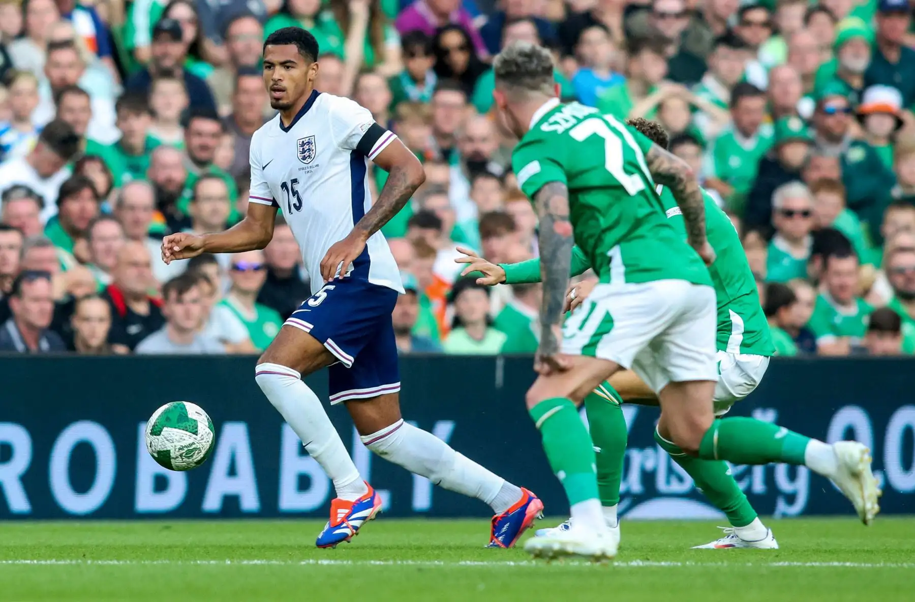 07/09/2024 El defensa número de Inglaterra, Levi Samuels Colwill, corre con el balón durante el partido de fútbol de la Liga de Naciones de la UEFA, Liga B, grupo 2, entre Irlanda e Inglaterra. Foto: ANDINA/AFP