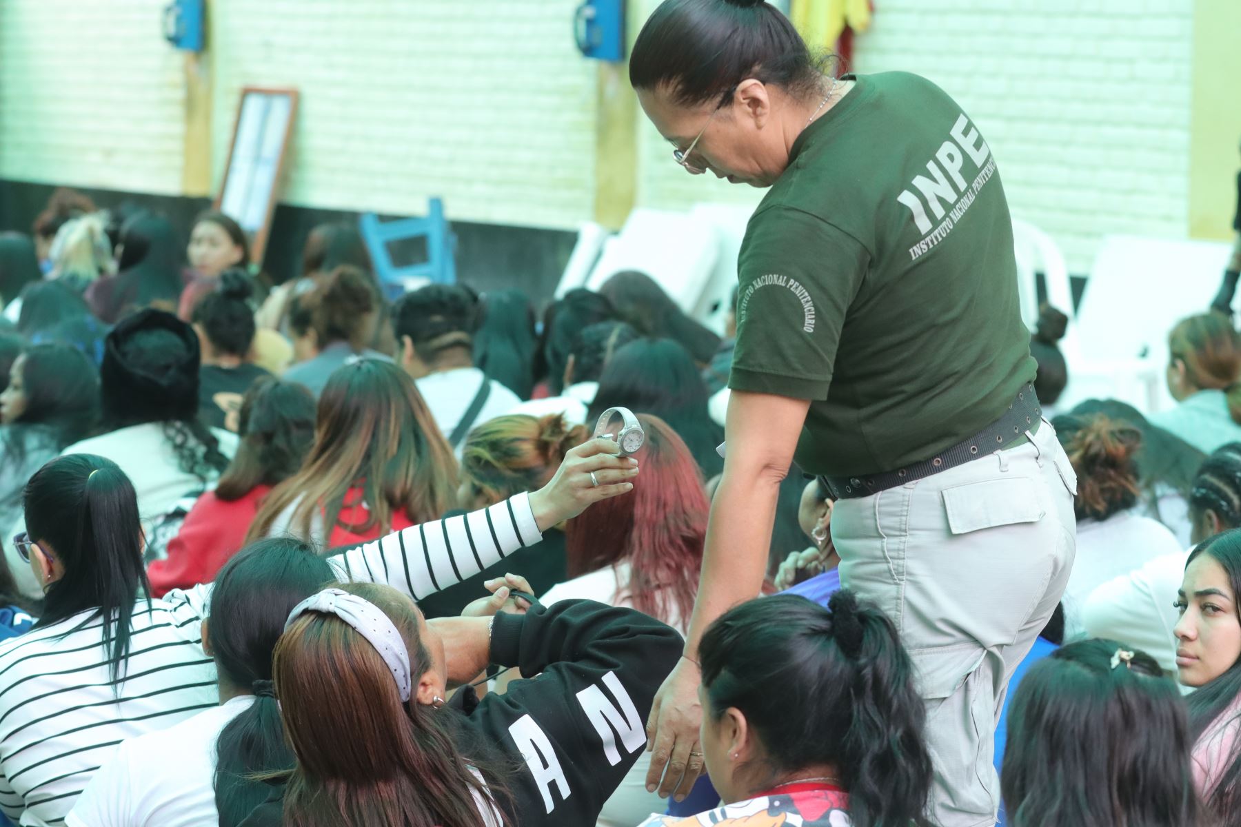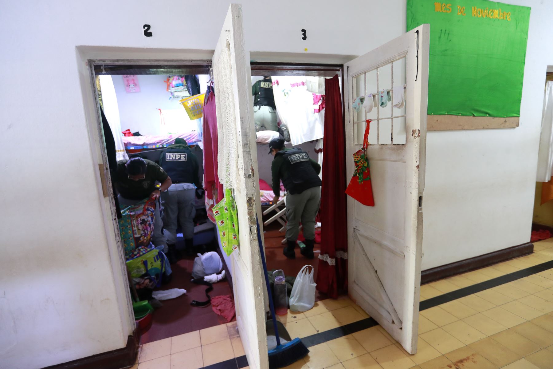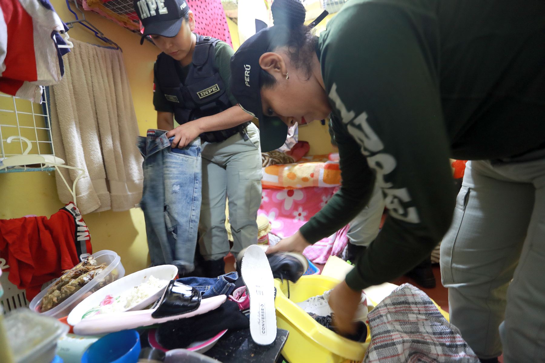 Con el objetivo de luchar contra las extorsiones y el crimen organizado, el titular del INPE, Iván Paredes Yataco dispuso de un operativo de requisa en el penal Mujeres Chorrillos. Agentes penitenciarios recorrieron diversos pabellones en busca de objetos y sustancias prohibidas. Lo acompaña la viceministra de Justicia, Shady Valdez Tejada.