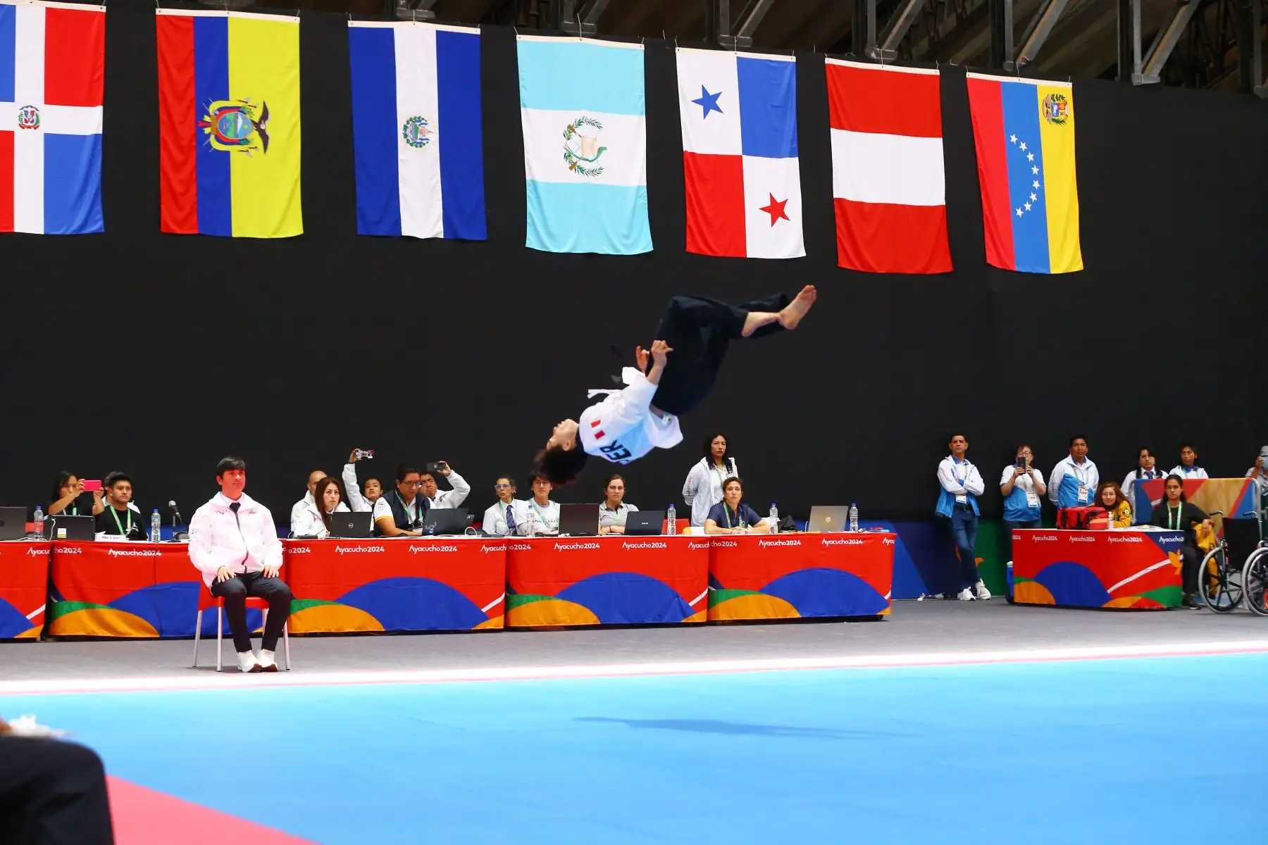 01/12/2024 Ceremonia oficial de premiación a los tres primeros lugares en taekwondo categoría freestyle individual masculino de los Juegos Panamericanos Bicentenario Ayacucho 2024 , en la que el representante de Perú, Mateo Sebastián Argomedo Perea, conquistó la medalla de oro. Foto: ANDINA/Daniel Bracamonte