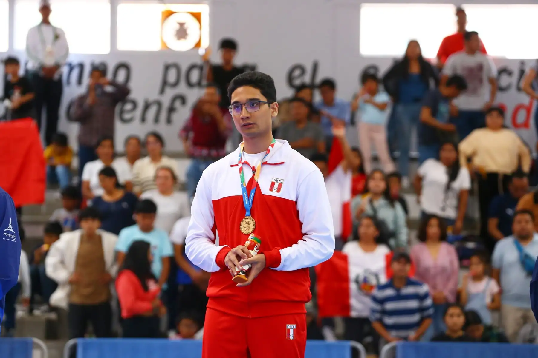01/12/2024 Premiacion al deportista peruano Sebastian Andres Guzman , medalla de oro en Taekwondo de la categoría tradicional individual masculino en el coliseo del colegio Mariscal Cáceres de Huamanga. Foto: ANDINA/Eddy Ramos