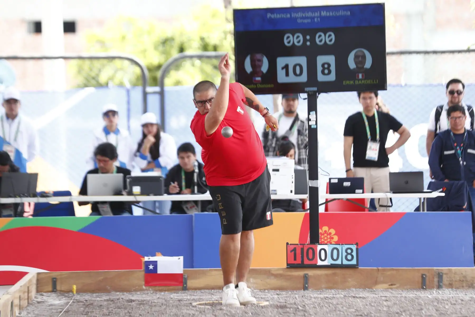 28/11/2024 Se iniciaron las competencias de bochas de los Juegos Bolivarianos Bicentenario Ayacucho 2024, en las que se enfrentaron Erik Américo Bardelli de Perú contra Renato Alberto Donoso de Chile en la categoría de petanca individual masculina, desde el Complejo Canaan Alto en la ciudad de Ayacucho. Foto: ANDINA/Daniel Bracamonte