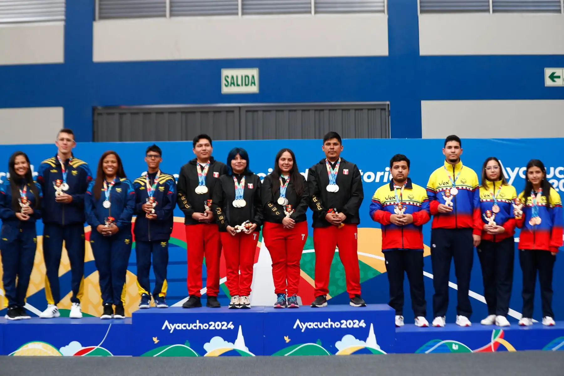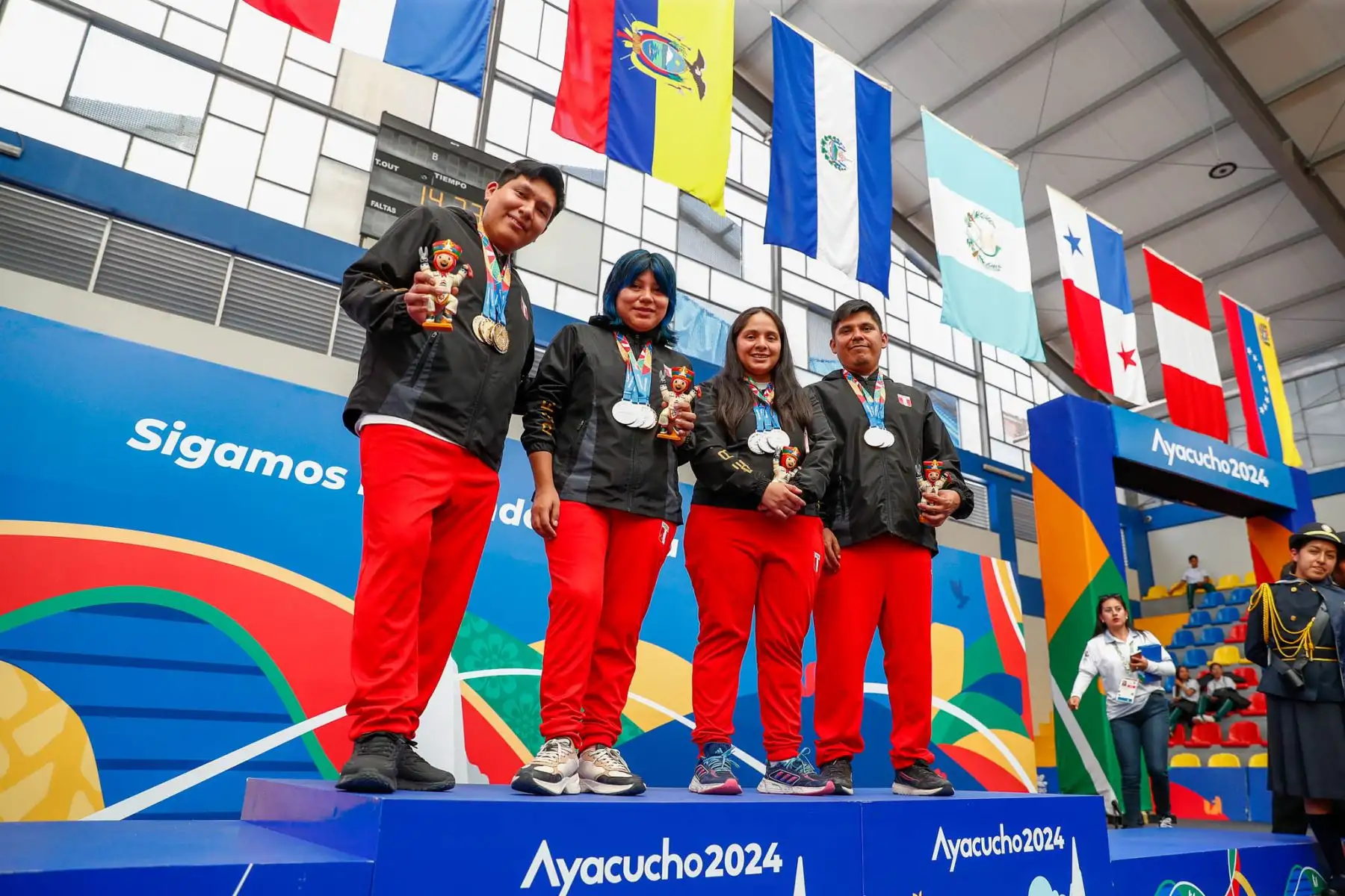 03/12/2024 Los peruanos Deysi Cori, Jorge Cori, Ingrid Aliaga y Renato Terry fueron reconocidos con la medalla de oro en la ceremonia oficial de premiación a los tres primeros puestos del torneo de ajedrez categoría Blitz, de equipos mixto, de los Juegos Bolivarianos Bicentenario Ayacucho 2024. La ceremonia se realizó en el coliseo del colegio Nuestra Señora de las Mercedes de Huamanga. Foto: ANDINA/Daniel Bracamonte