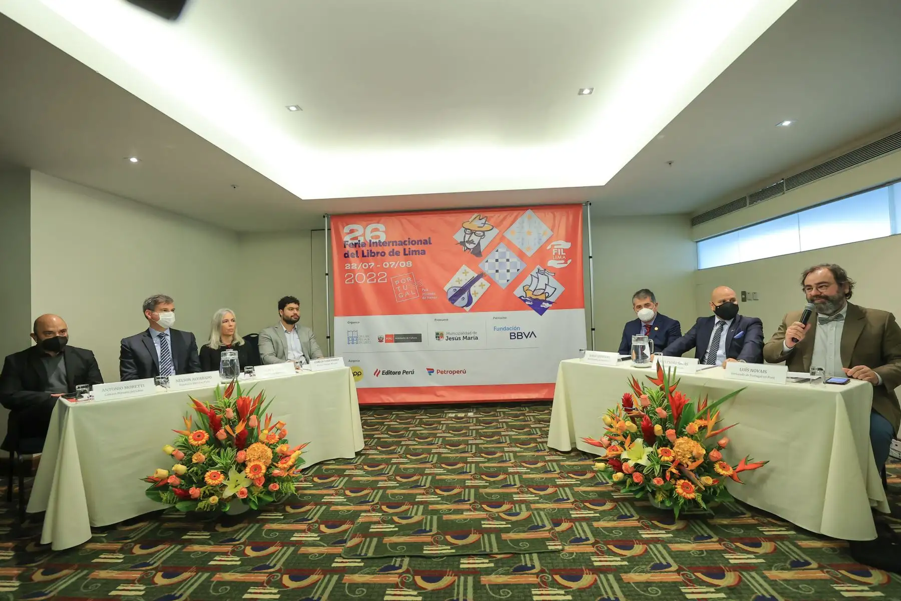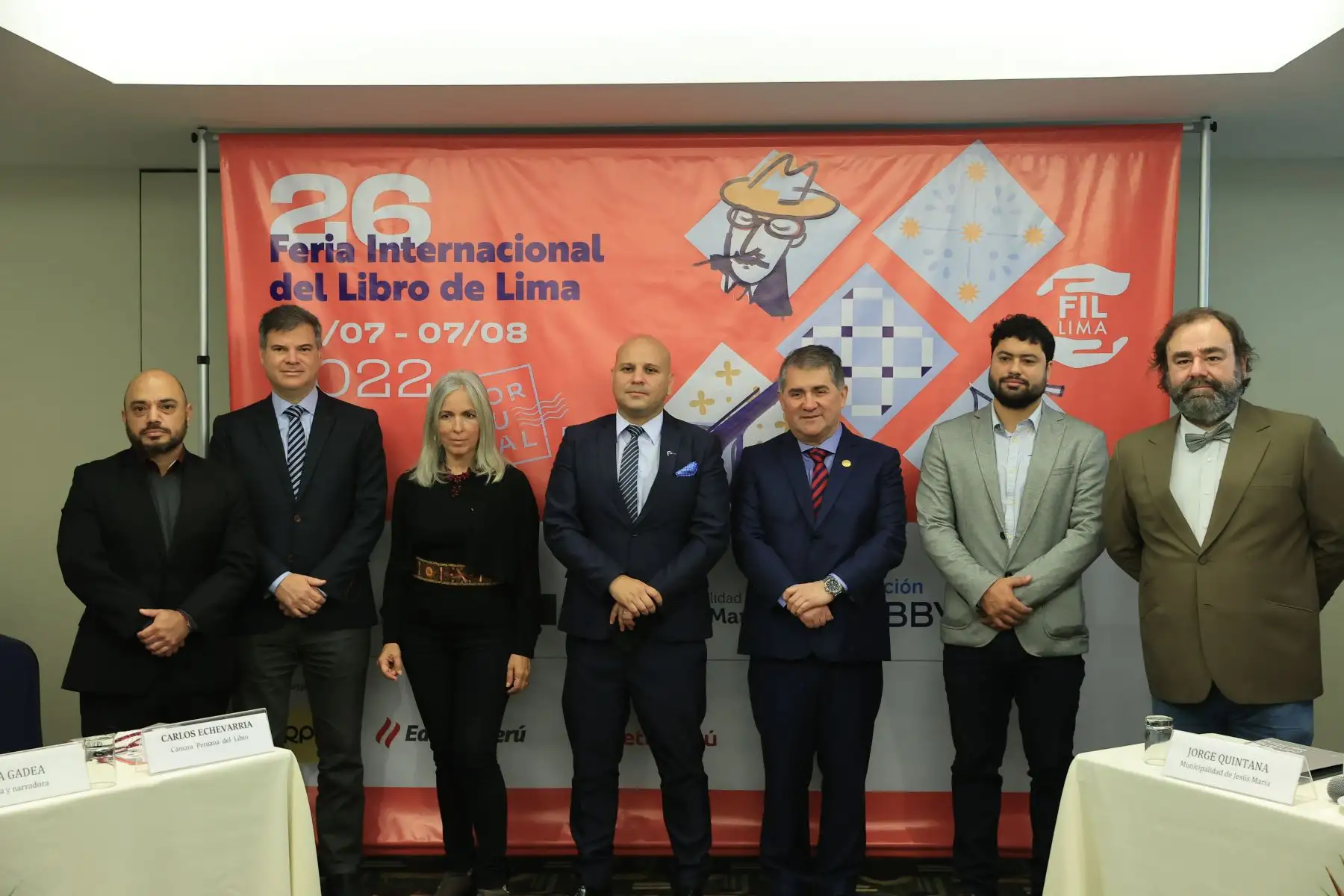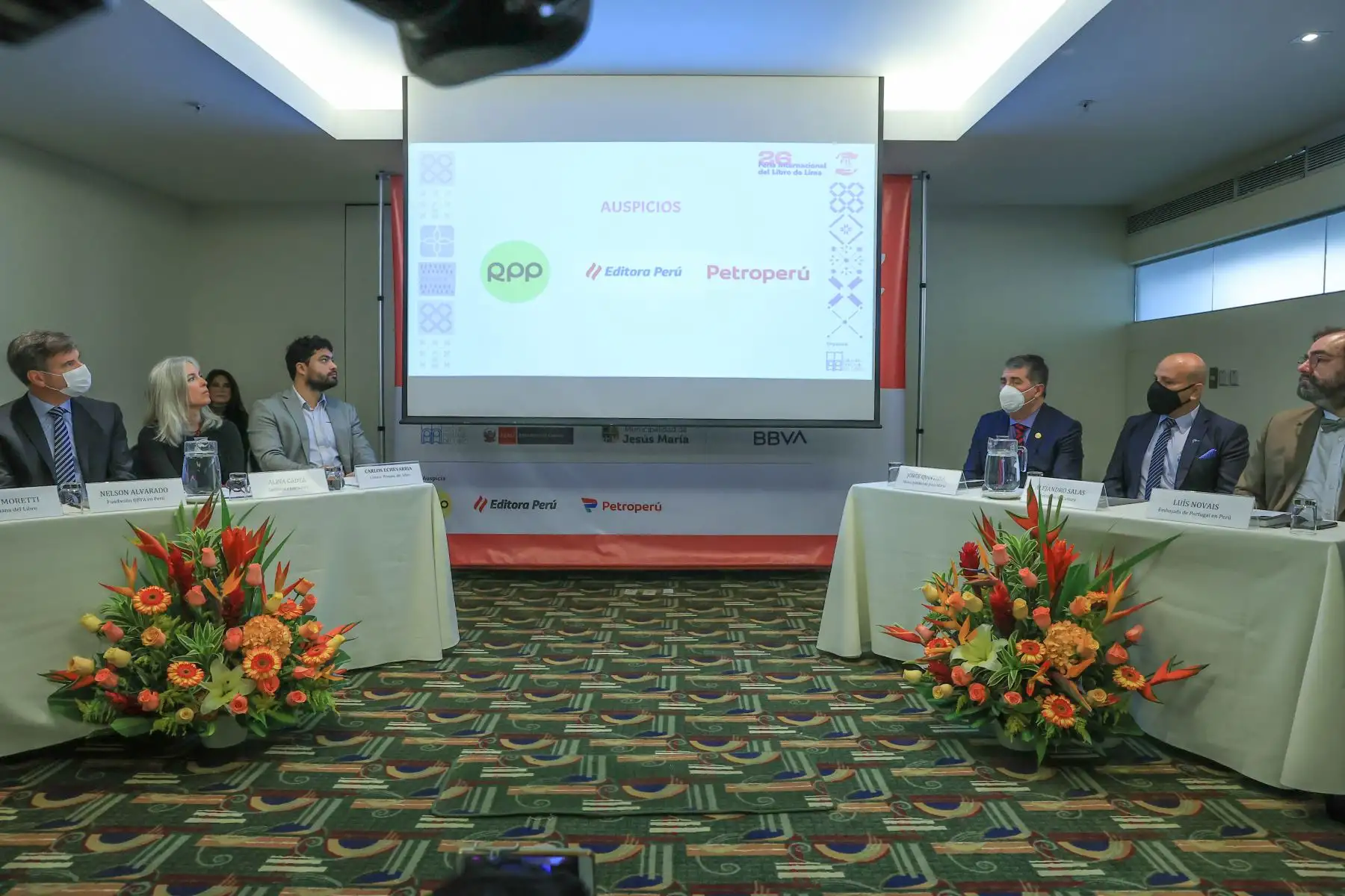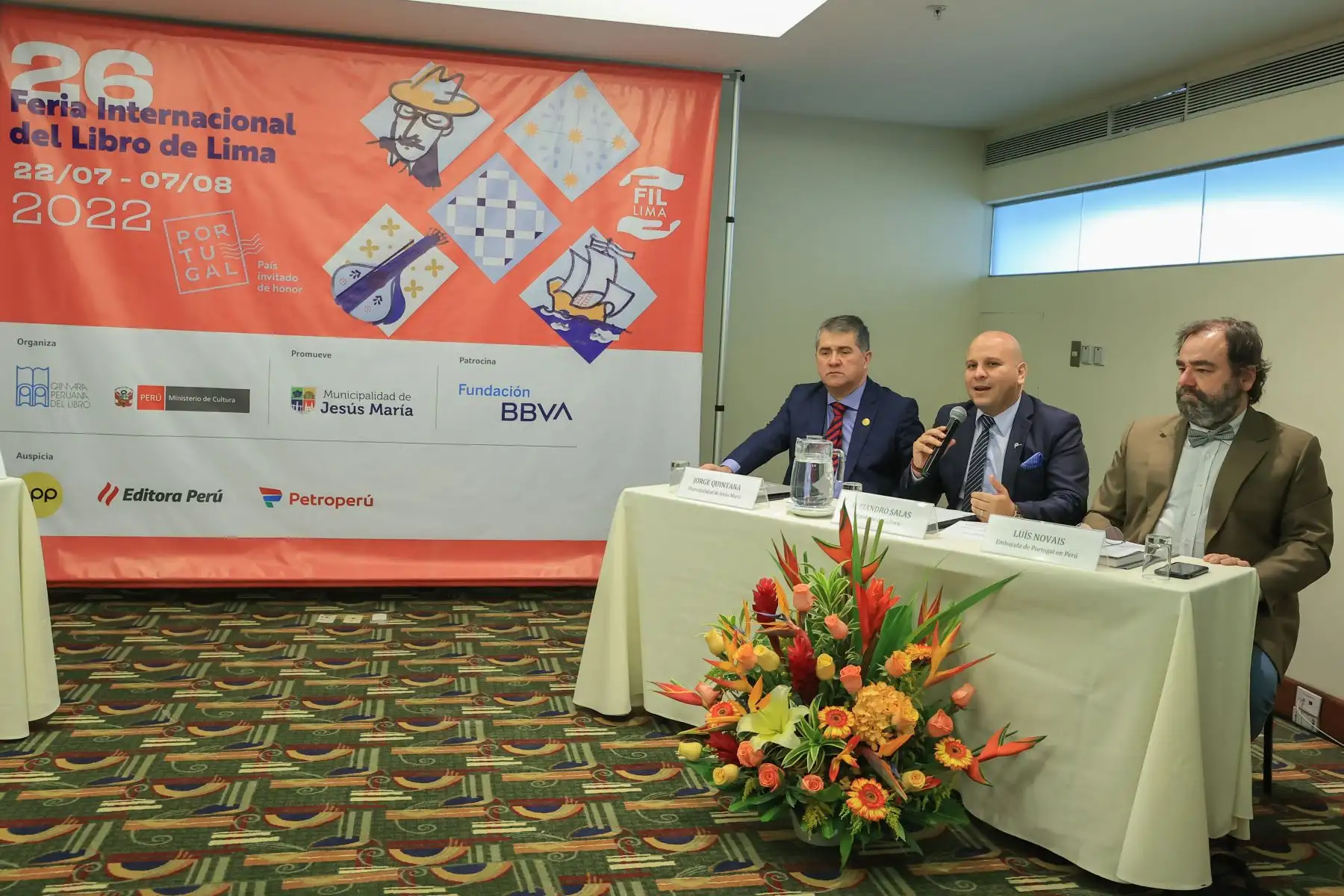 27/06/2022 El evento cultura y editorial más relevante del Perú regresa a la presencialidad después de dos años y con ello se suma al retorno de ferias del libro más importantes de Latinoamérica. En conferencia de prensa, el ministro de Cultura, Alejandro Salas, el agregado de Portugal, Luis Novais, el alcalde de Jesús María, Jorge Quintana, Antonio Moretti, de la Cámara Peruana del Libro, Nelson Alvarado, de la Fundación BVVA, Alina Gadea, escritora y narradora, Carlos Echevarría, de la Cámara Peruana del Libro, anunciaron el retorno de la Feria Internacional de Libro desde este 22 de julio hasta el 07 de agosto en el Parque Próceres de la Independencia de Jesús María. Foto: ANDINA/ Andrés Valle