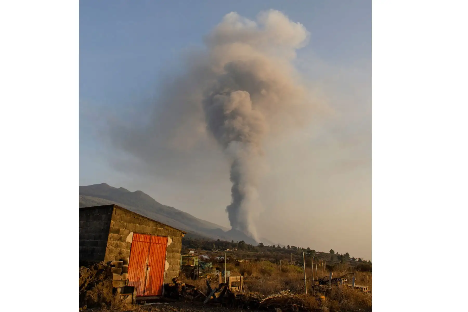 04/10/2021 Edificios y viviendas se muestran como el volcán Cumbre Vieja en el fondo arroja lava, ceniza y humo, en Los Llanos de Aridane, en la isla canaria de La Palma.