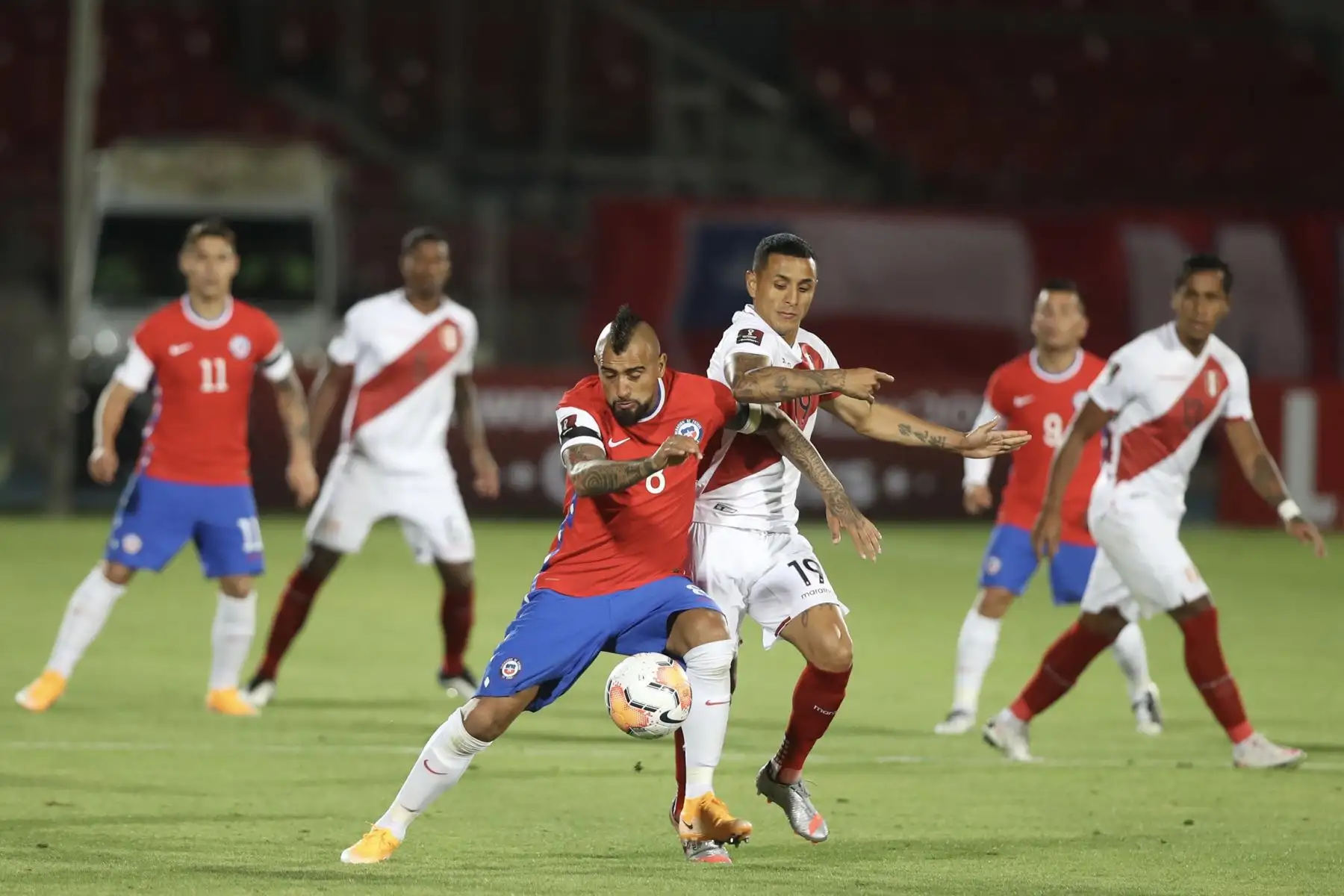 30/03/2022 Yoshimar Yotún de la Selección peruana lucha por el balón ante la marca de Arturo Vidal de Chile durante partido por las Clasificatorias Qatar 2022. Foto: FPF