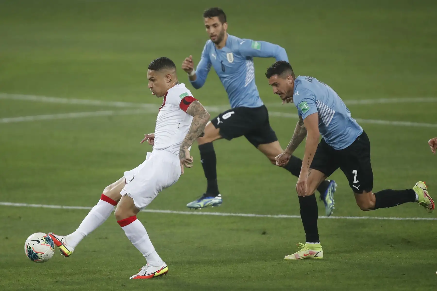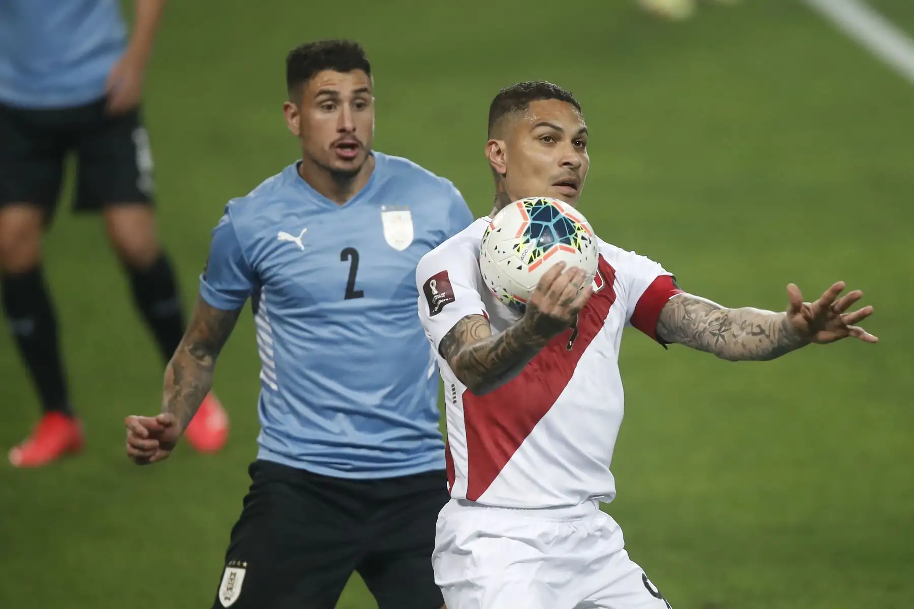 30/03/2022 El jugador peruano Paolo Guerrero disputa el balón ante el jugador de la selección uruguaya durante el partido
