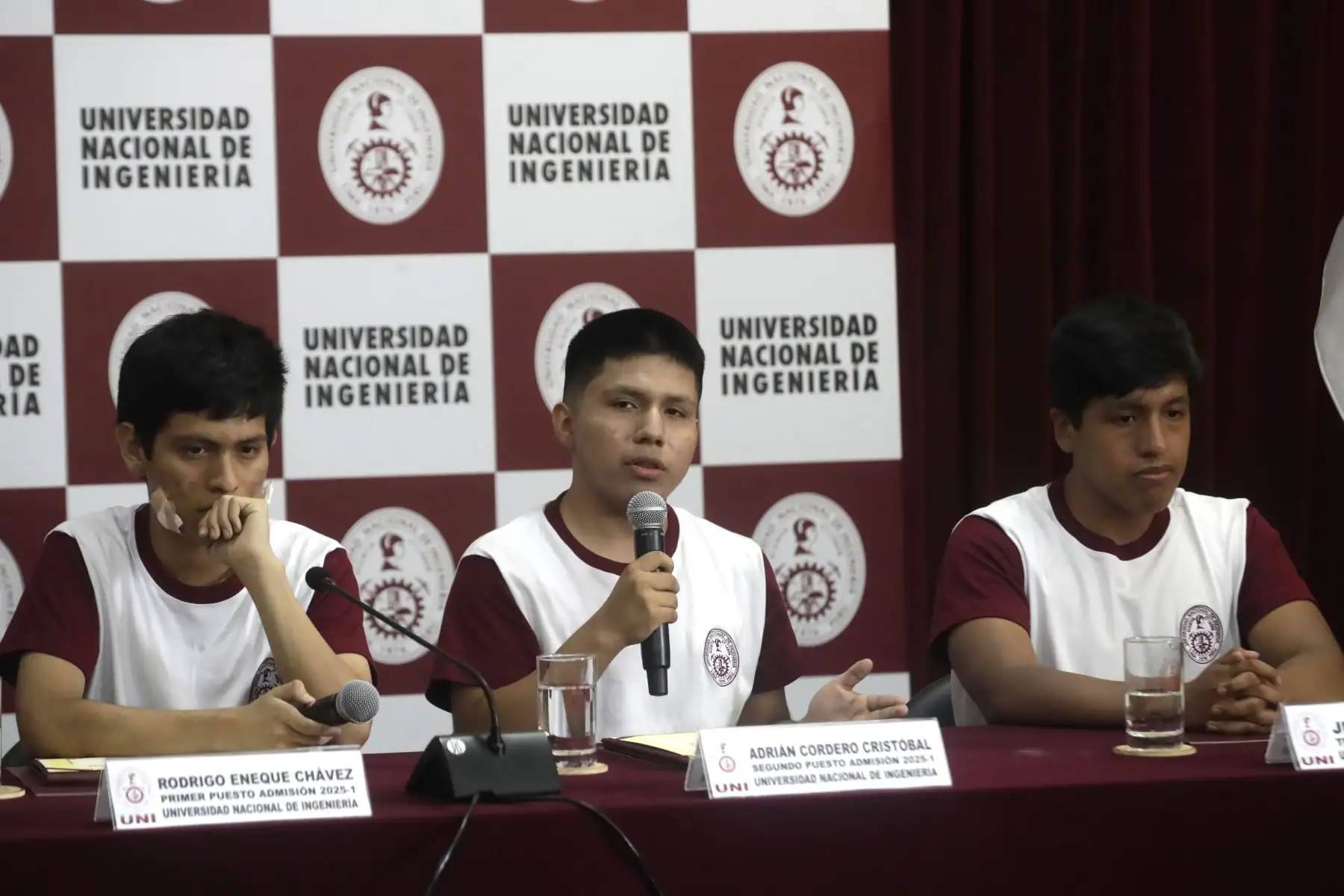 25/02/2025 La Universidad Nacional de Ingeniería (UNI) presentó a los tres primeros puestos de su proceso de admisión. Rodrigo Leonardo Eneque Chávez obtuvo el primer puesto en el cómputo general con un destacado puntaje de 1,630.200, asegurando su ingreso a Ingeniería Mecatrónica. El segundo lugar fue para Adrián Iker Cordero Cristóbal, con 1,629.640 puntos, quien estudiará Ingeniería de Software. JeanPier Joaquín Díaz Osis ocupó el tercer puesto con 1,606.080 puntos e ingresó a Ingeniería Económica. Foto: ANDINA/Eddy Ramos