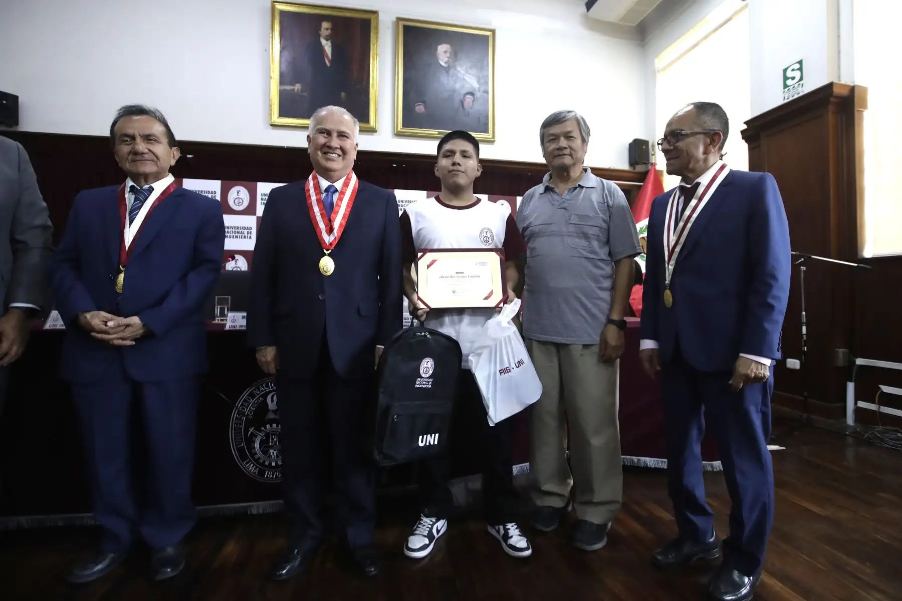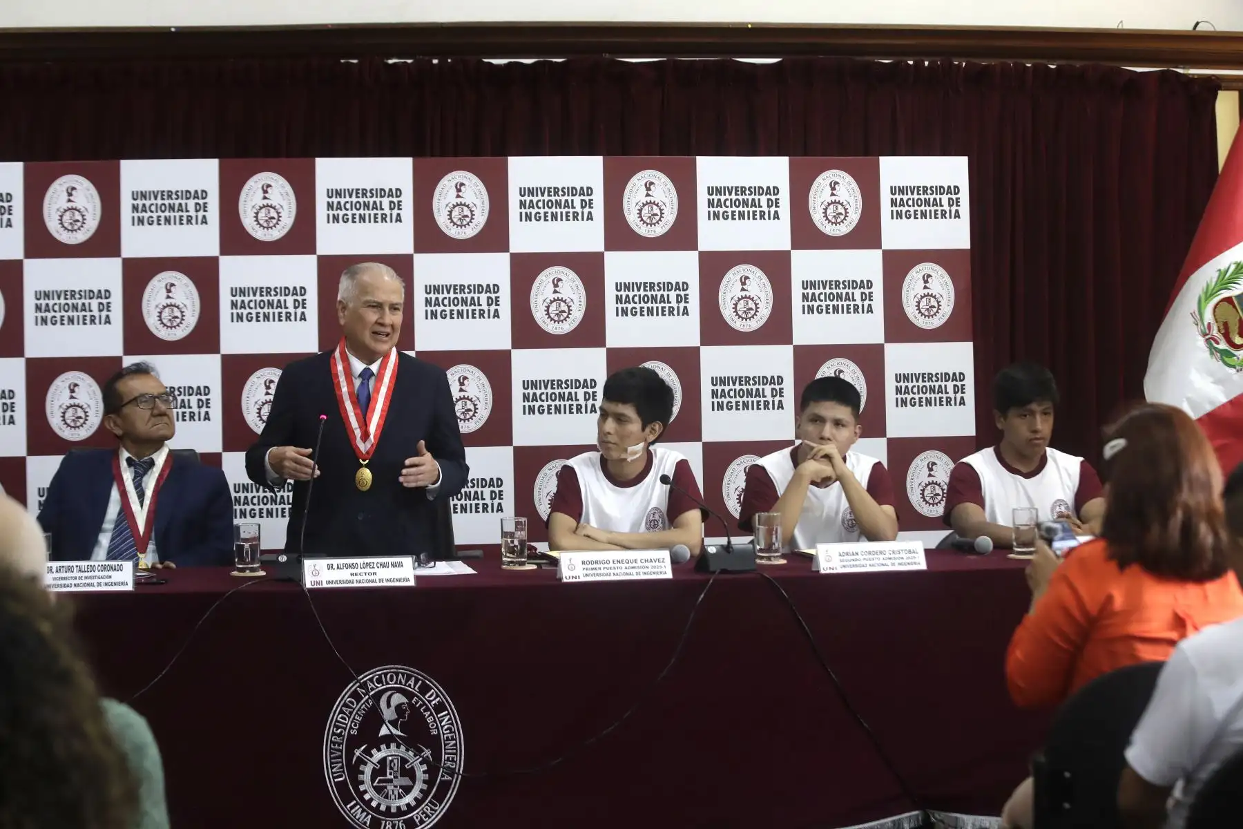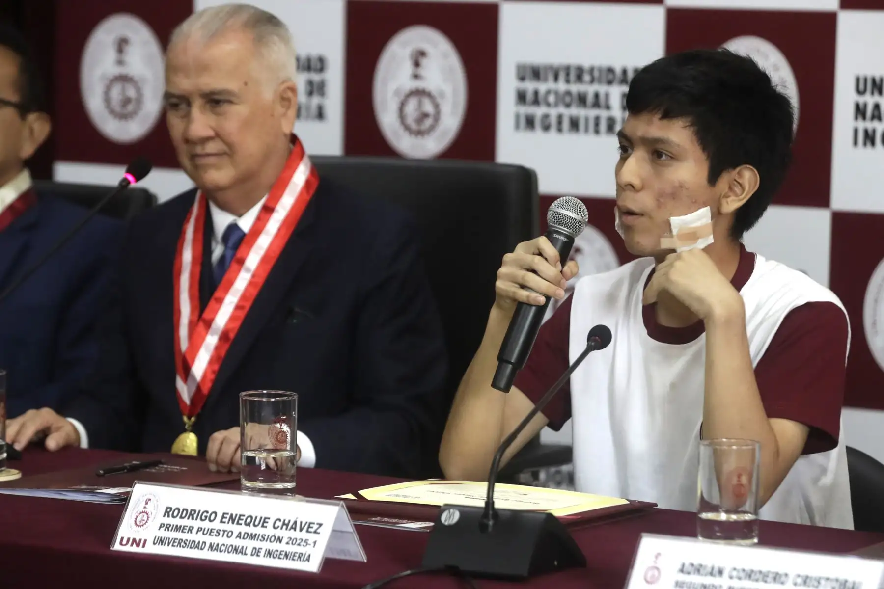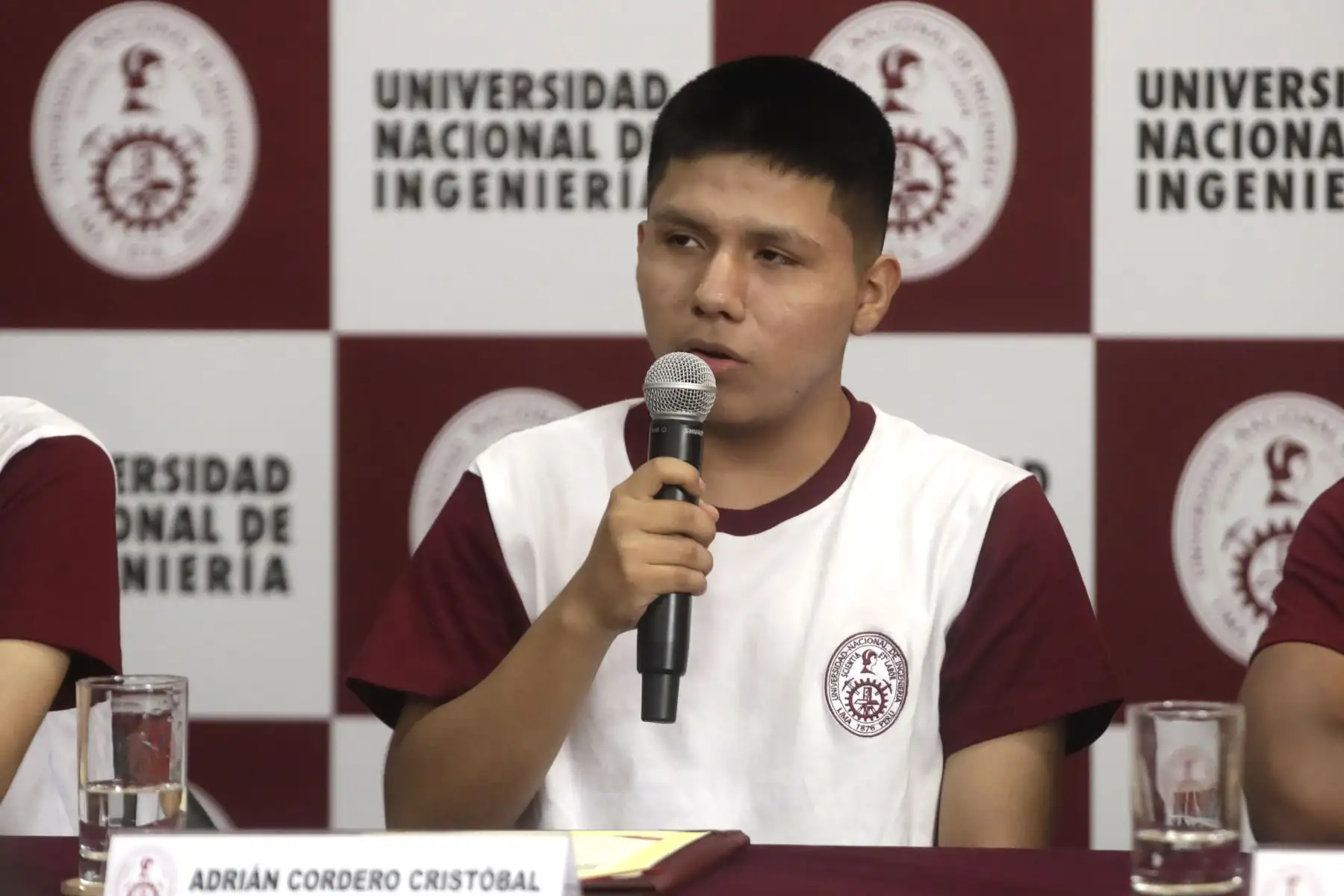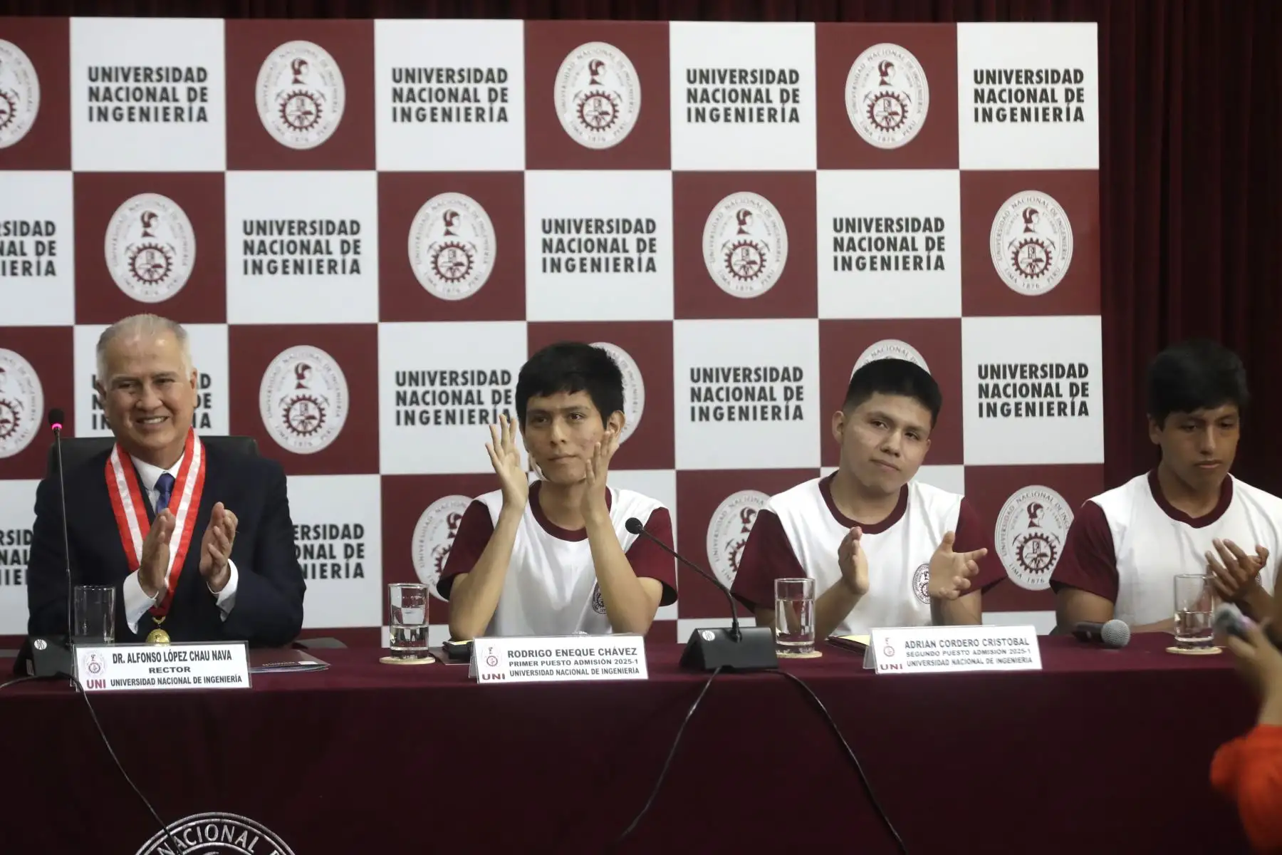 25/02/2025 La Universidad Nacional de Ingeniería presentó a sus tres mejores postulantes. Con un puntaje de 1,630.200, Rodrigo Leonardo Eneque Chávez logró el primer lugar en el cómputo general e ingresó a la carrera de Ingeniería Mecatrónica. El segundo puesto fue para Adrián Iker Cordero Cristóbal, quien alcanzó 1,629.640 puntos y estudiará Ingeniería de Software. En tercer lugar, se ubicó JeanPier Joaquín Díaz Osis, con un puntaje de 1,606.080, asegurando su ingreso a Ingeniería Económica.