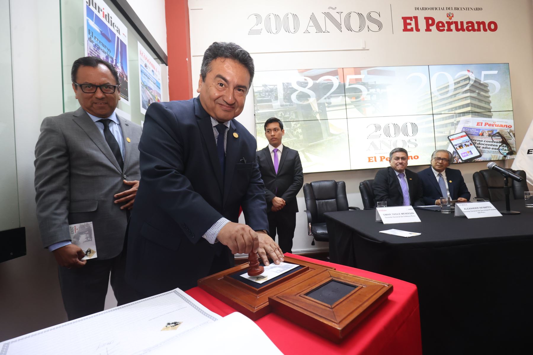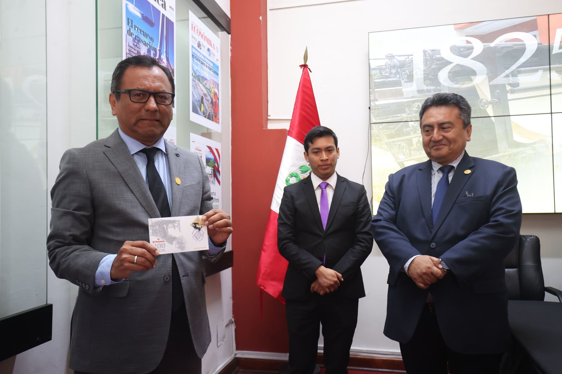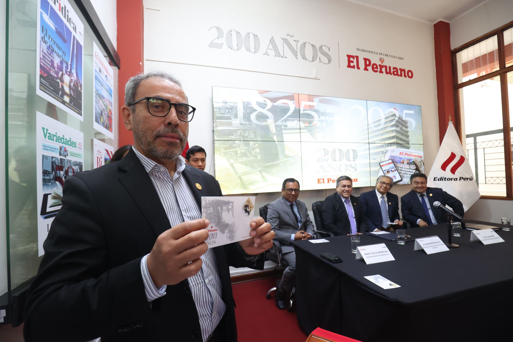 23/10/2025 Lanzamiento de la estampilla conmemorativa por el bicentenario del diario oficial El Peruano realizado en las instalaciones de Editora Perú y donde participaron el gerente general de Editora Perú, Omar Tagle Mendoza, Alexander Infantes, gerente general de Serpost, Hugo Aguirre, presidente de directorio de Editora Perú y Félix Paz, Director de Medios Periodísticos.