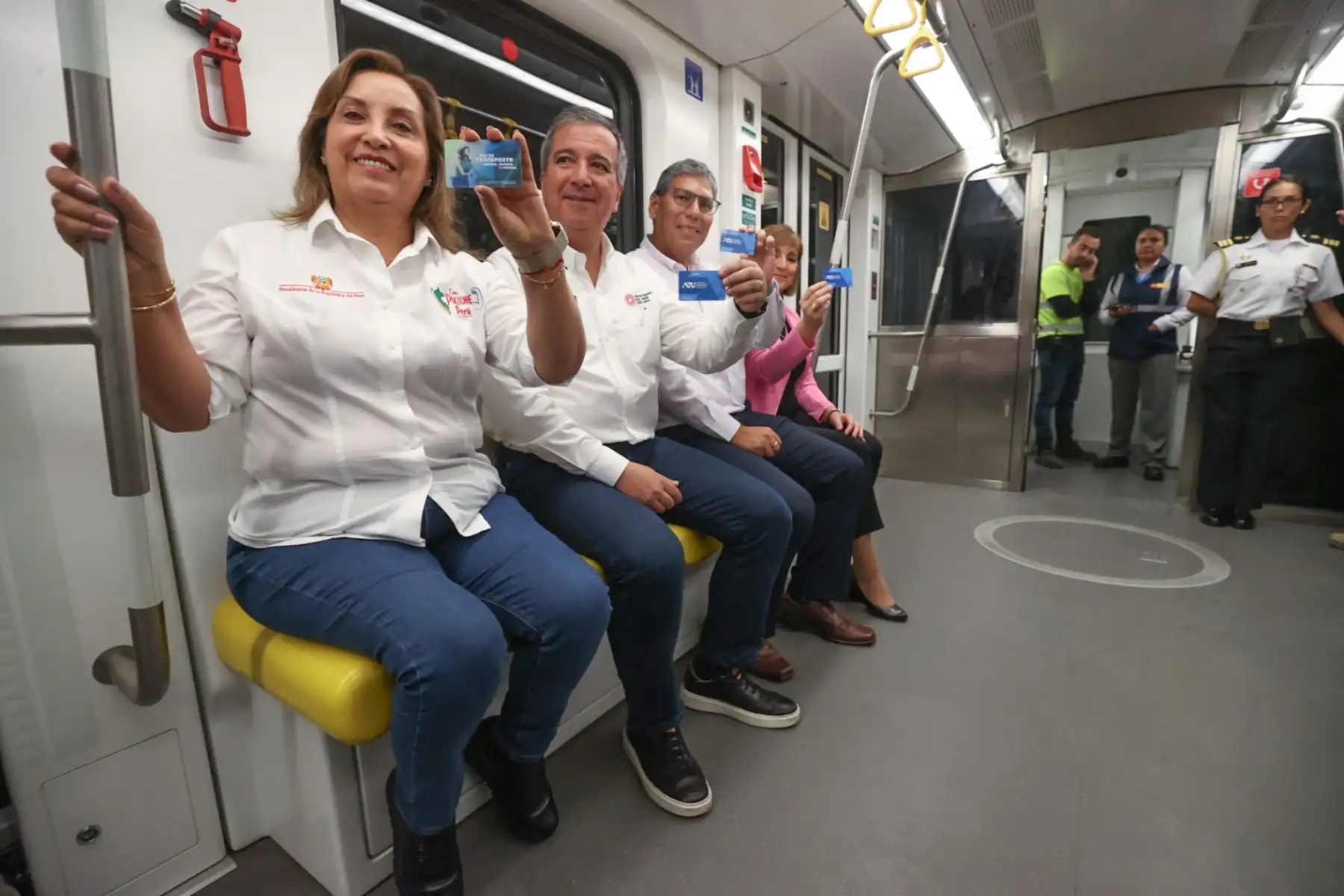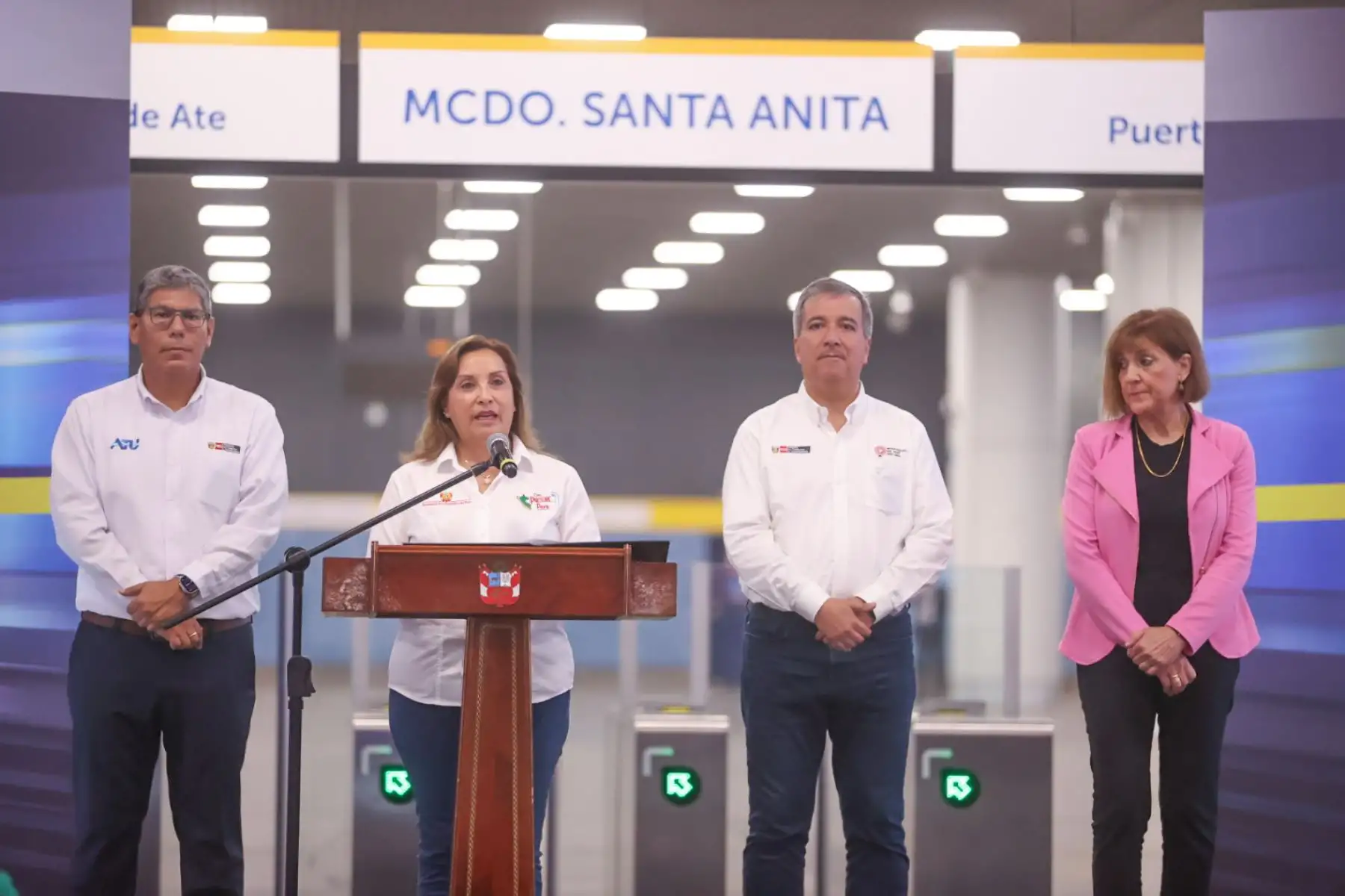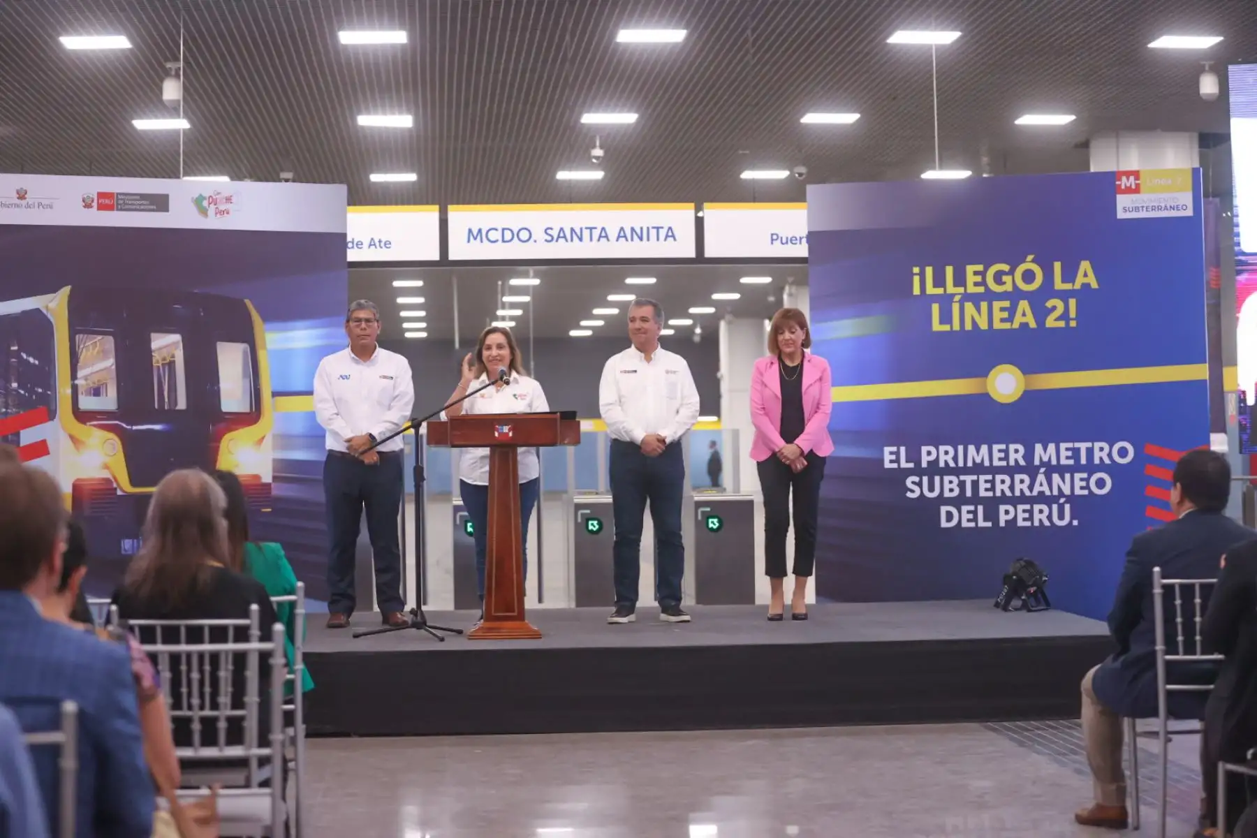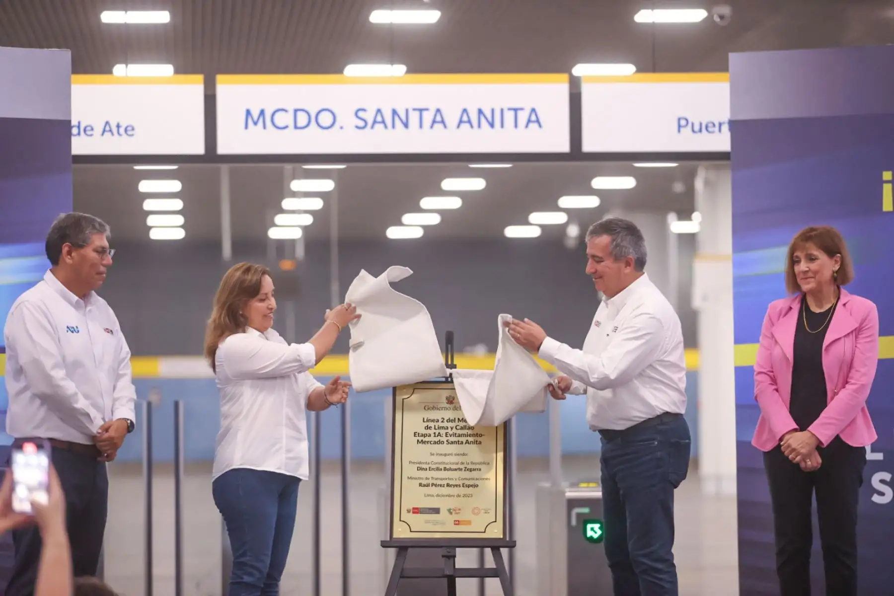 21/12/2023 La presidenta, Dina Boluarte acompañada por el ministro de Transportes y Comunicaciones, Raúl Pérez Reyes participó el día de hoy del inicio de operaciones de la etapa 1A de la Línea 2 del metro de Lima y Callao, desde la estación Mercado de Santa Anita hacia la estación Evitamiento cuyo servicio será temporalmente gratuito durante los 3 meses que duré el periodo de marcha blanca.