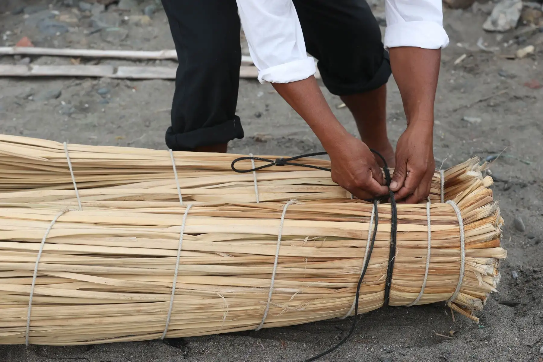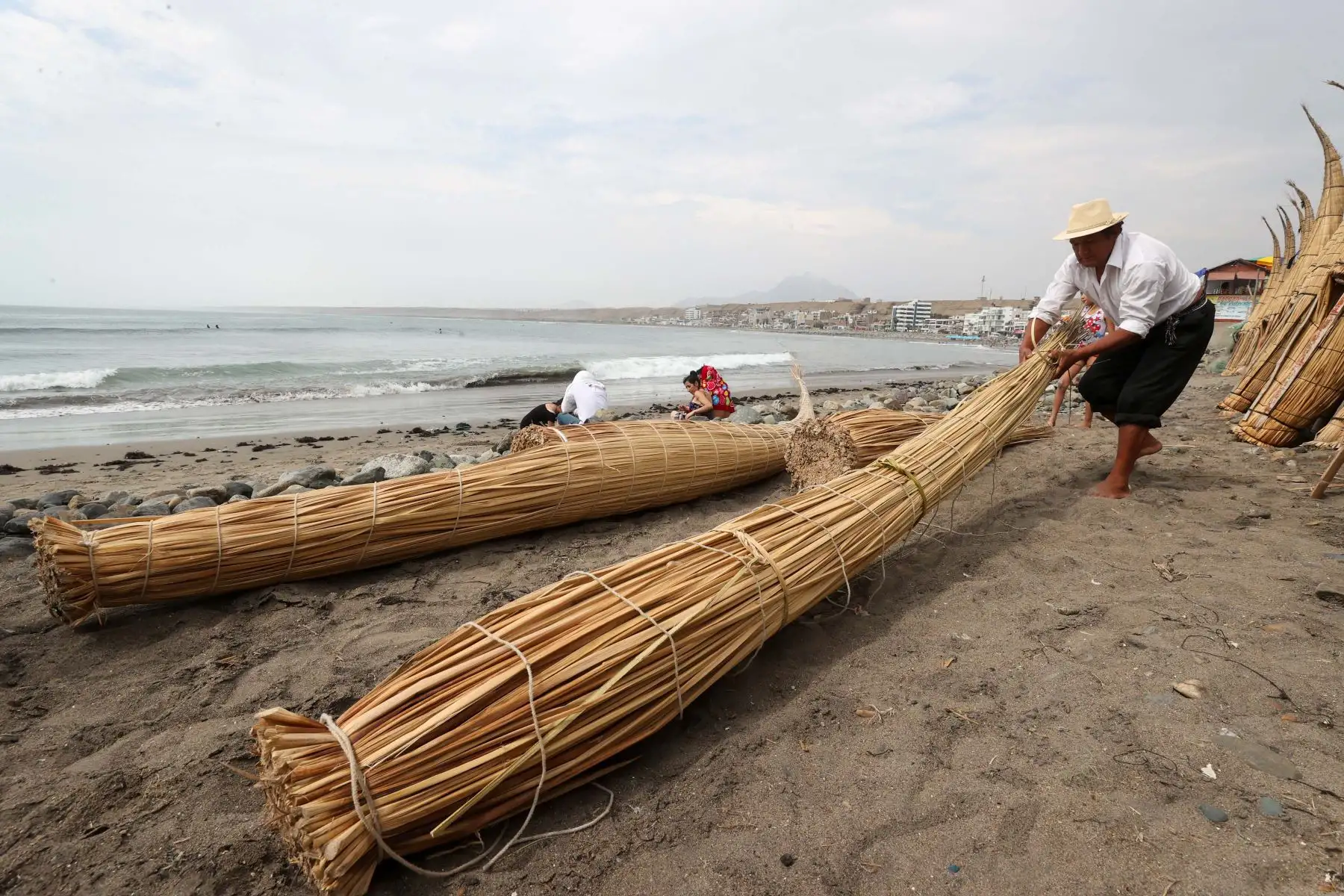 11/12/2024 En la playa de Huanchaco se puede apreciar una actividad de cultura viva como el armado del tradicional Caballito de Totora. Foto:ANDINA/ Juan Carlos Guzmán Negrini