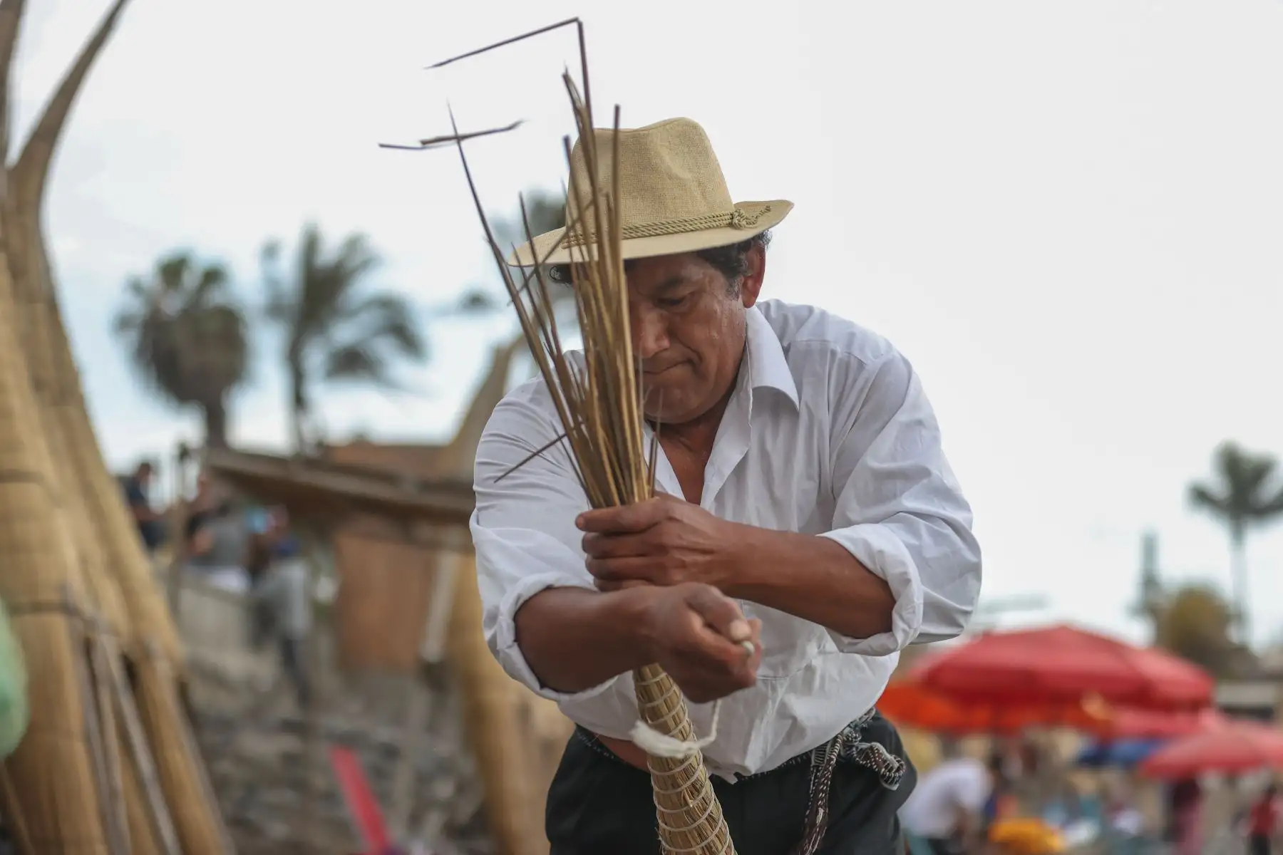 En la playa de Huanchaco se puede apreciar una actividad de cultura viva como el armado del tradicional Caballito de Totora. Foto:ANDINA/ Juan Carlos Guzmán Negrini