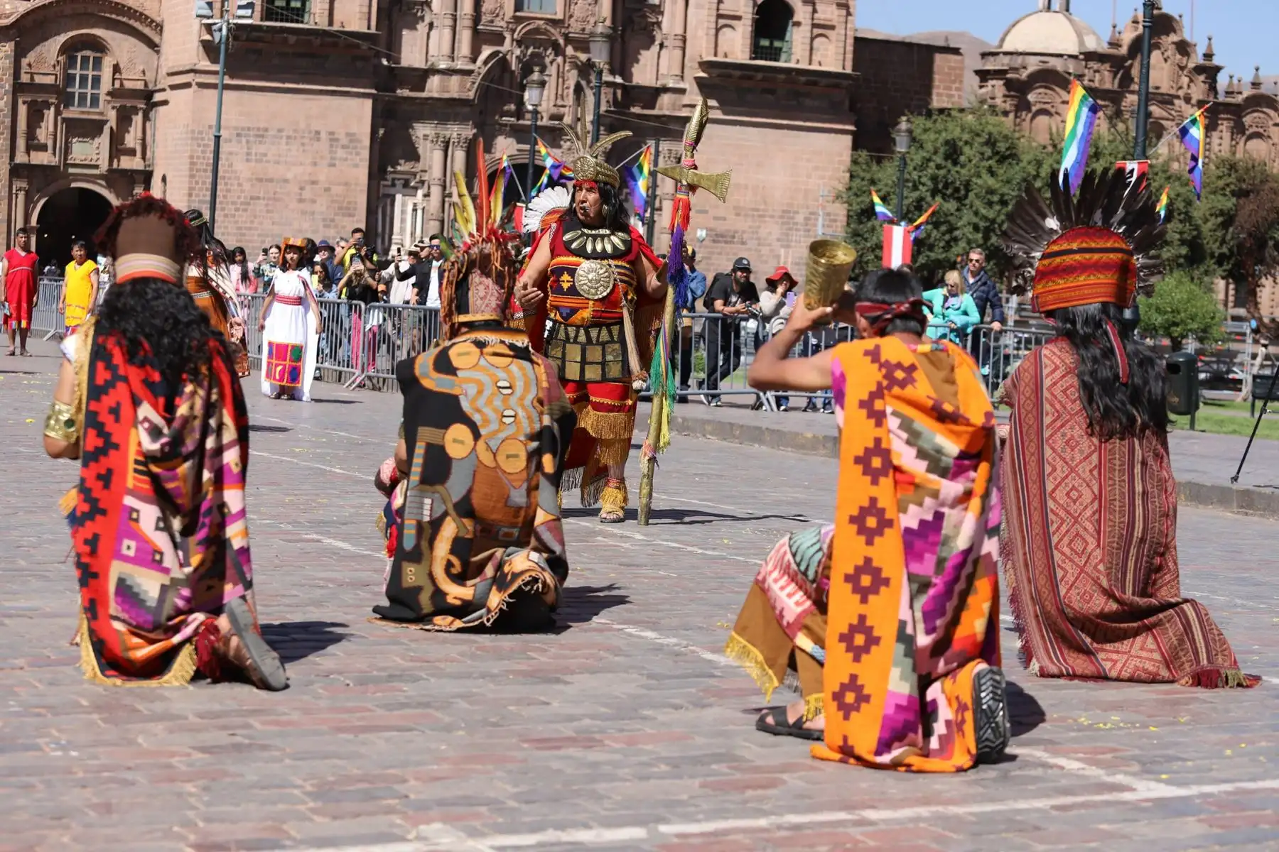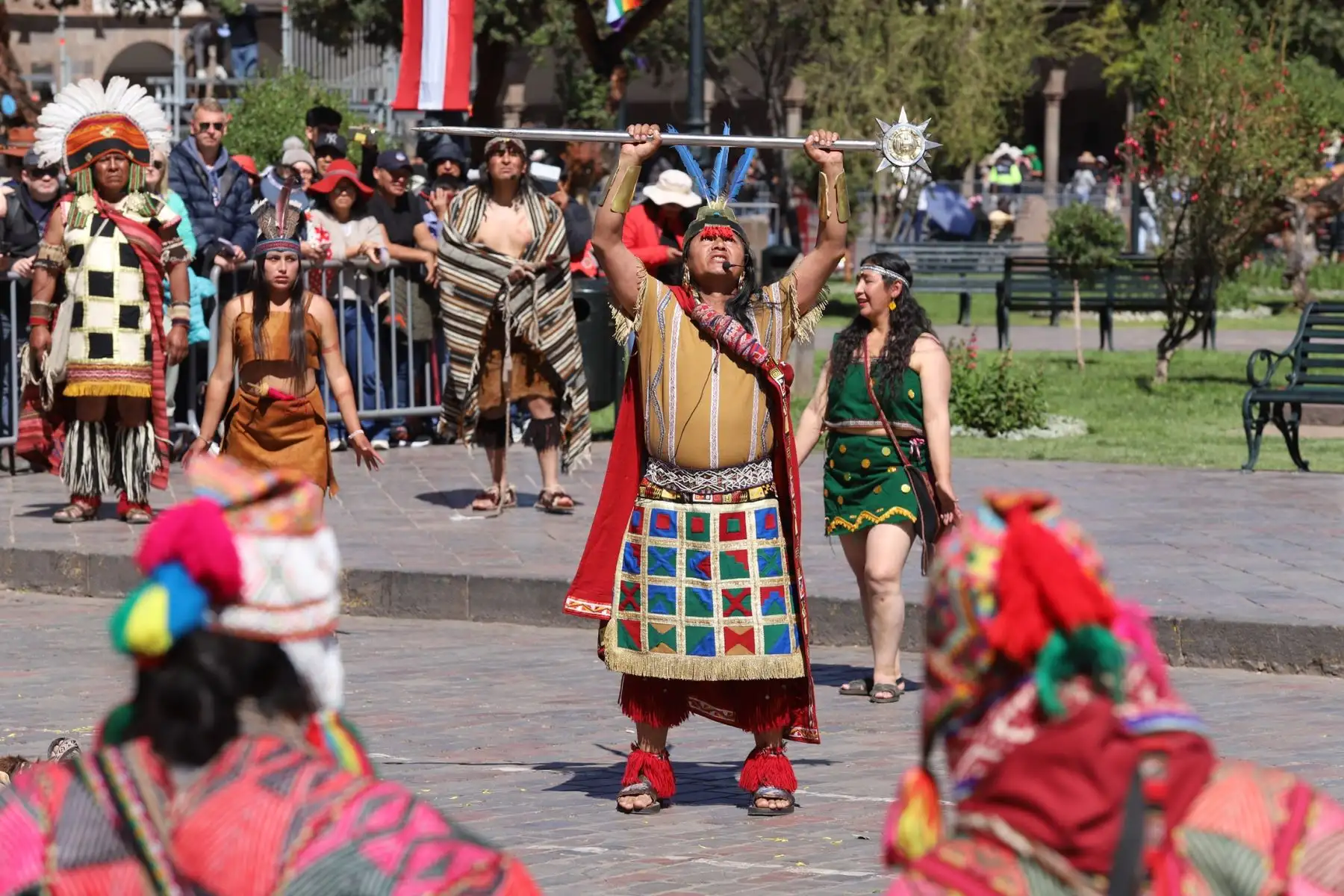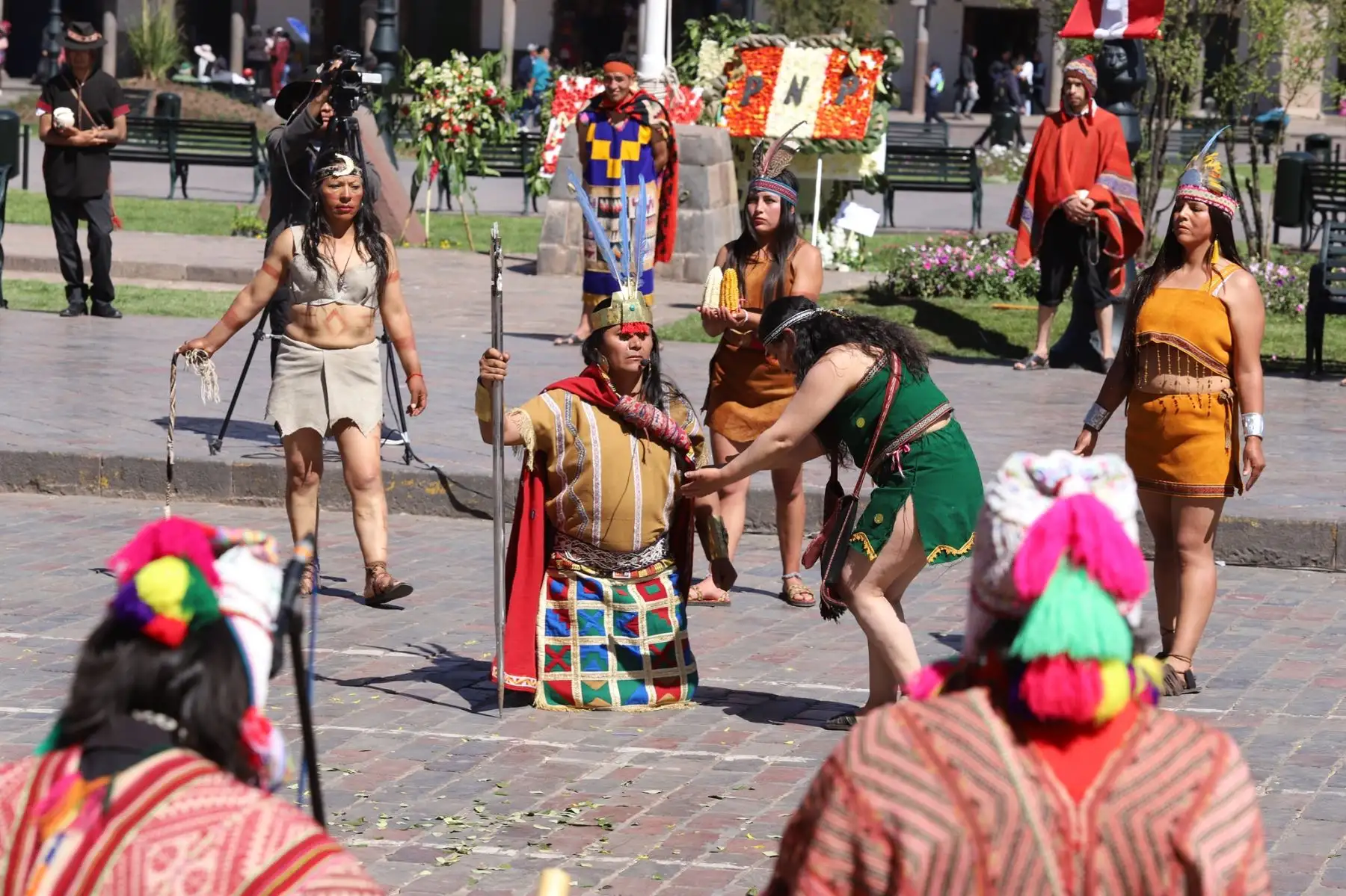 10/06/2024 Parte de esta puesta en escena se vivió al pie de la Basílica Catedral, guiados por el Inti, el Dios Sol, los cuatro Hermanos Ayar expresaron que fueron llamados a fundar esta importante ciudad, solo Ayar Manco y Mama Occllo llegaron y descendieron desde el Apu Wanacauri a expandirse por el valle. Foto: ANDINA/Percy Hurtado
