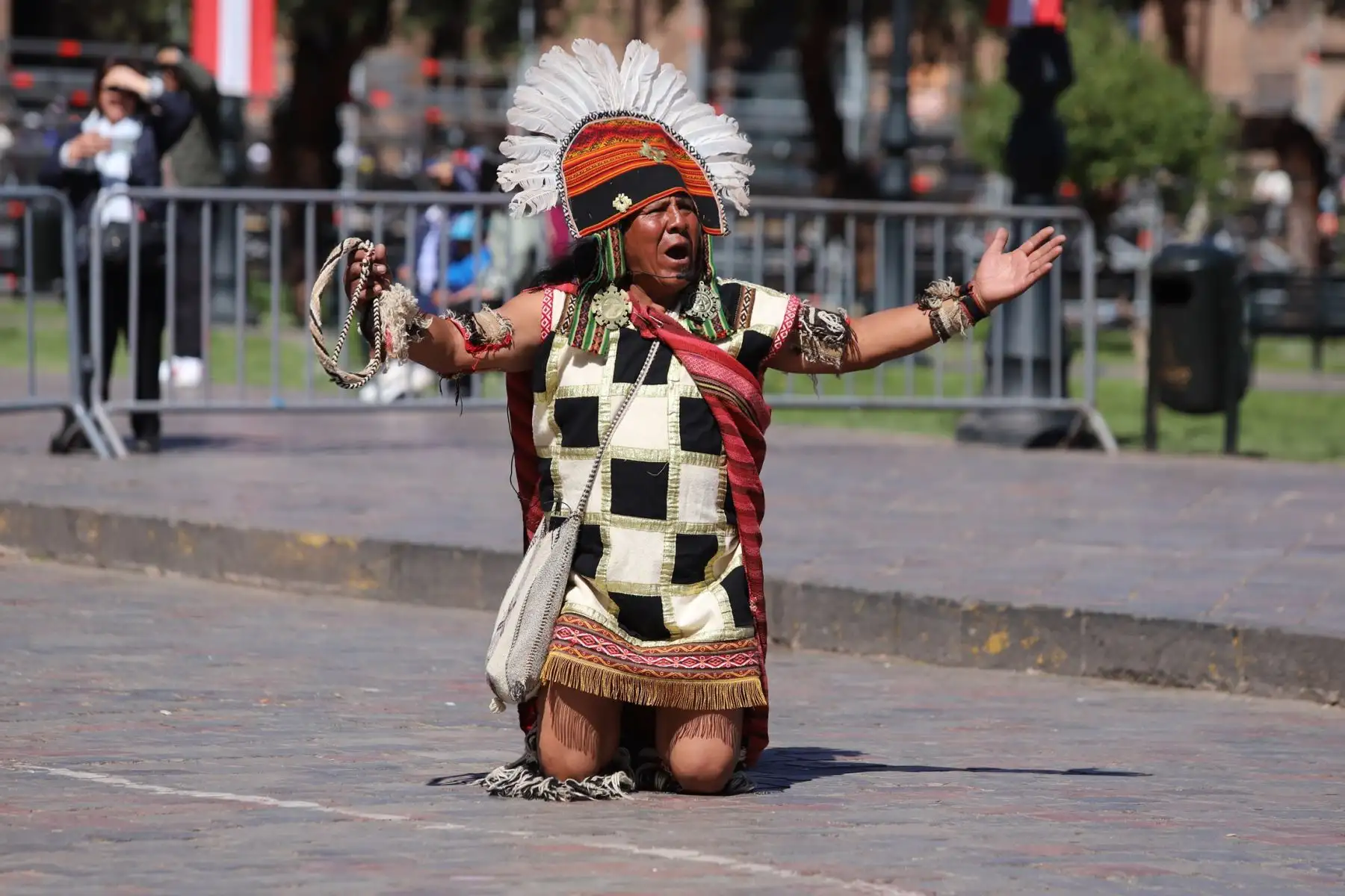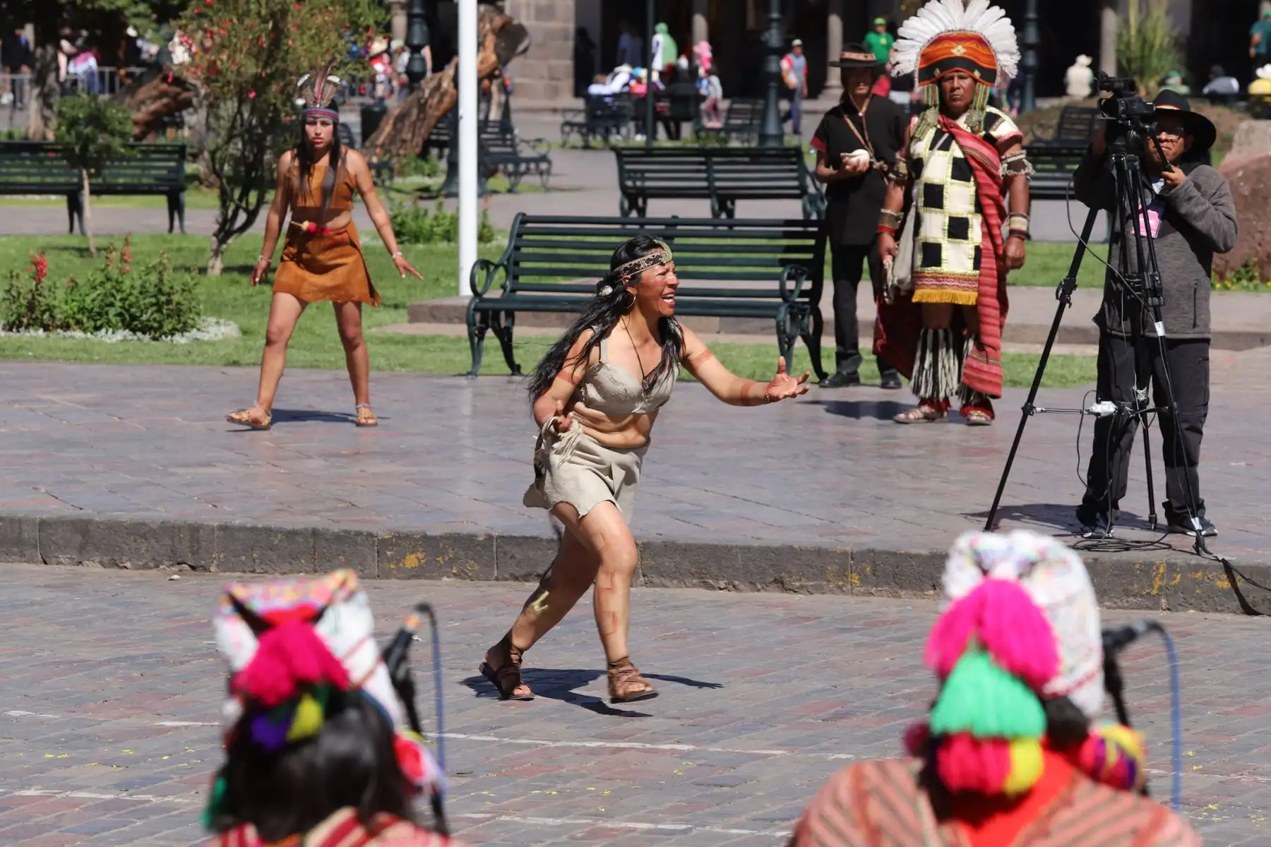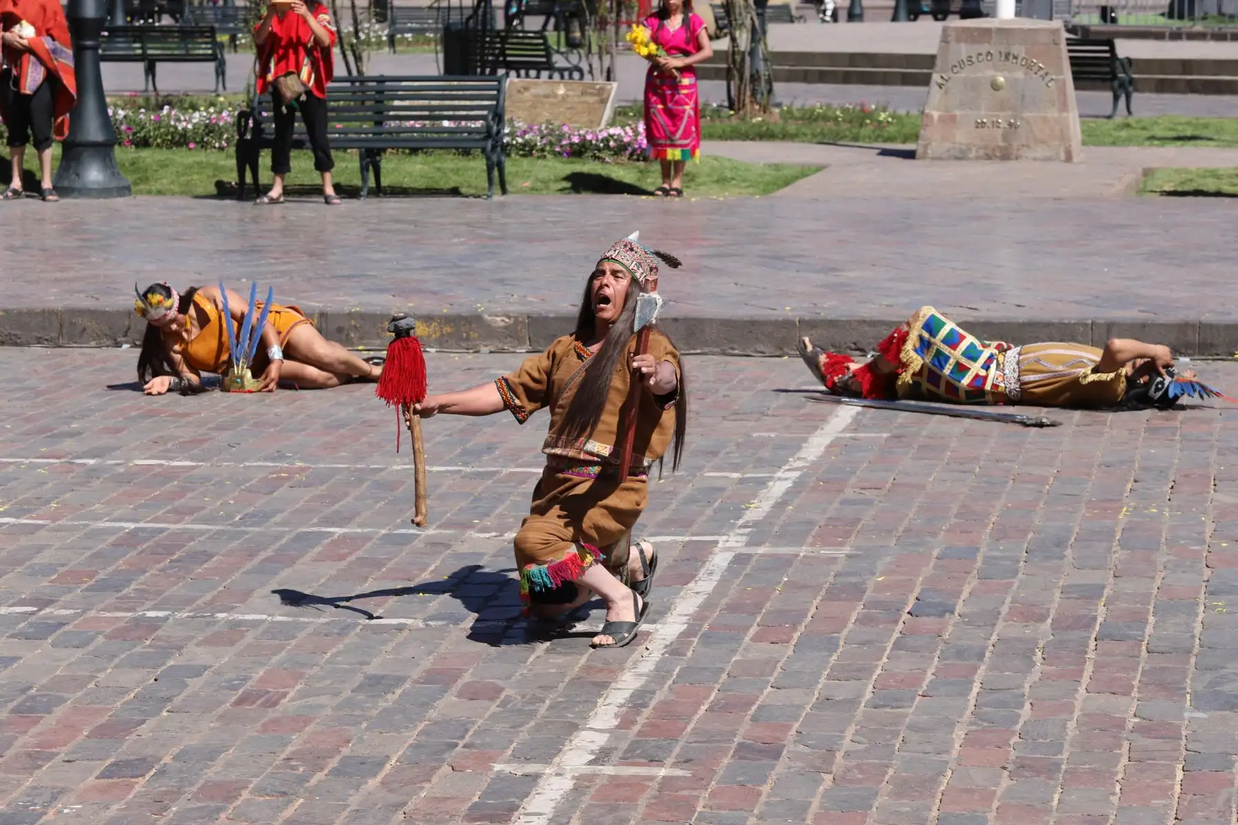 10/06/2024 Parte de esta puesta en escena se vivió al pie de la Basílica Catedral, guiados por el Inti, el Dios Sol, los cuatro Hermanos Ayar expresaron que fueron llamados a fundar esta importante ciudad, solo Ayar Manco y Mama Occllo llegaron y descendieron desde el Apu Wanacauri a expandirse por el valle. Foto: ANDINA/Percy Hurtado