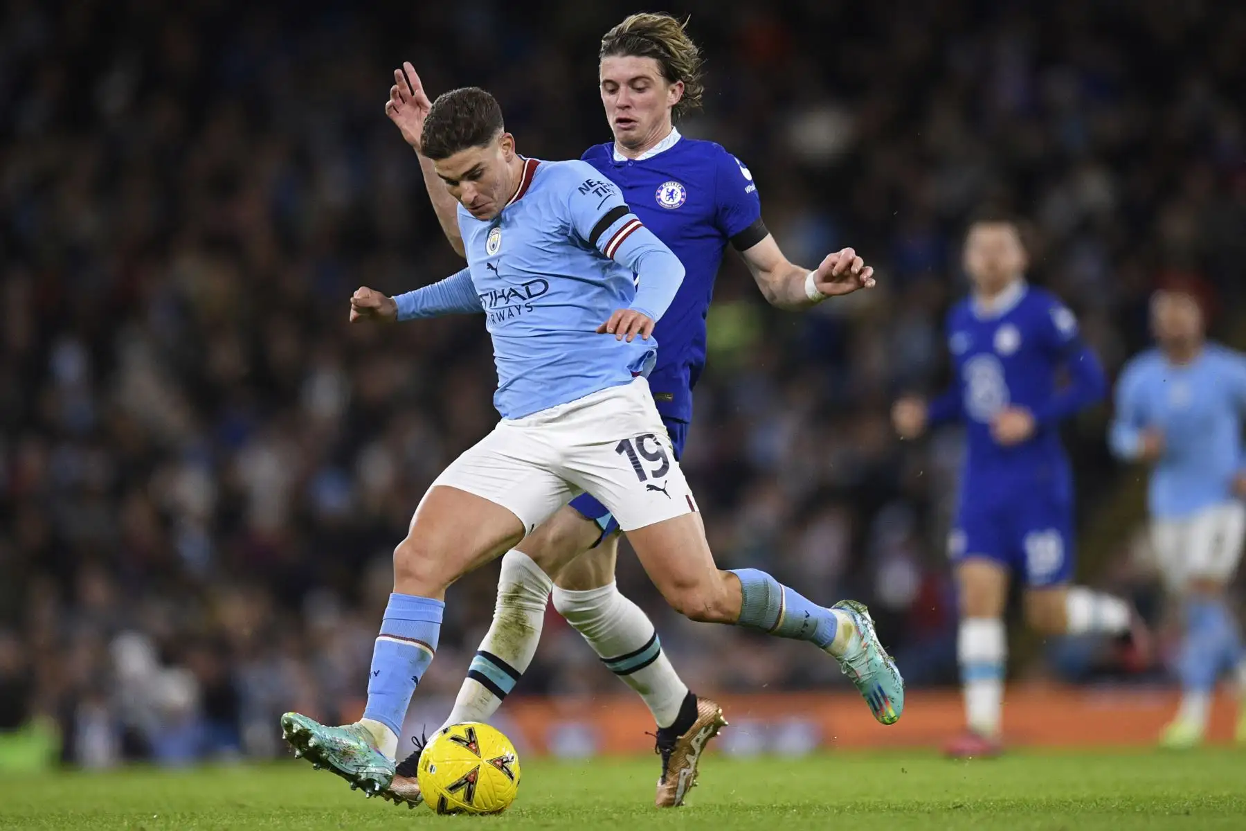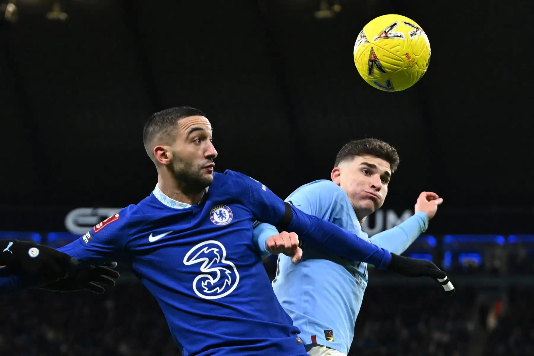 08/01/2023 El mediocampista marroquí del Chelsea Hakim Ziyech compite con el delantero argentino del Manchester City Julian Alvarez durante el partido de fútbol de la tercera ronda de la Copa FA inglesa entre el Manchester City y el Chelsea. AFP