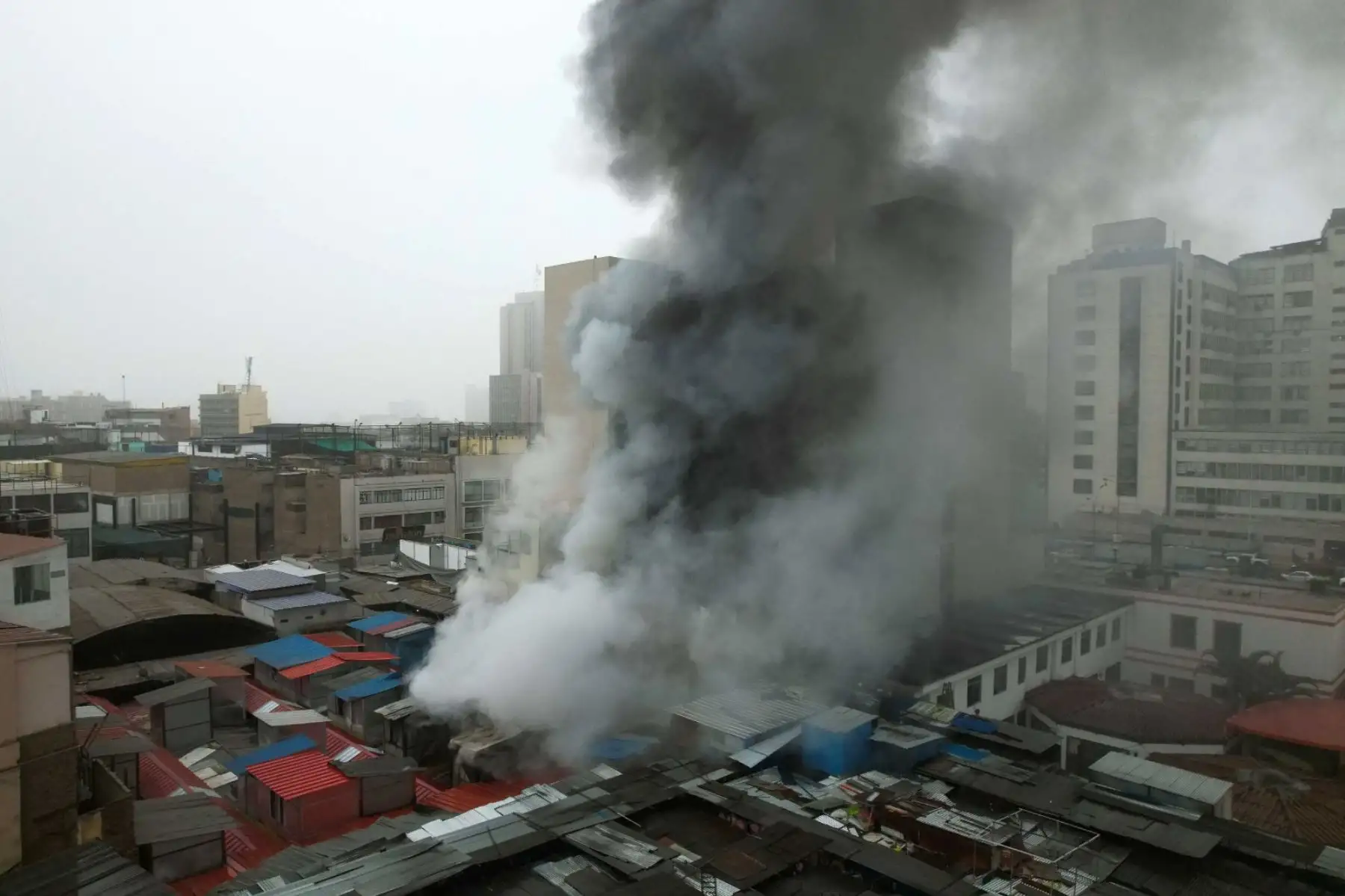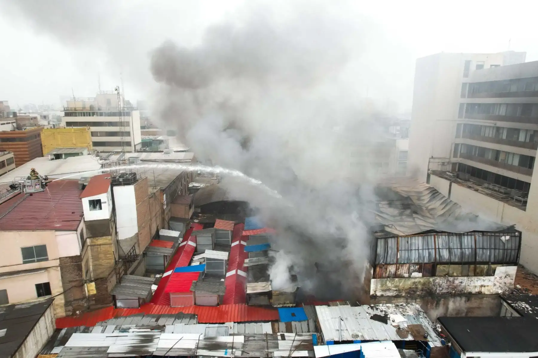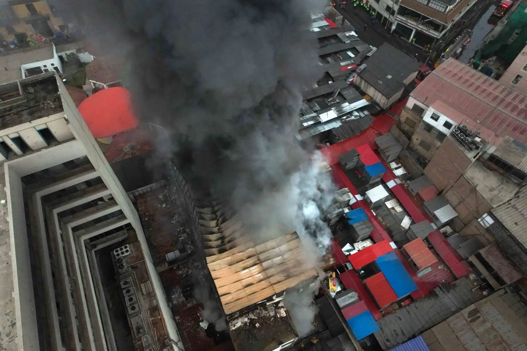 23/05/2024 Cerca de 16 unidades de bomberos intentan combatir un incendio que se registra, en estos momentos, en una galería comercial de Mesa Redonda a la altura de la cuadra 8 del jirón Andahuaylas cruce con jirón Ayacucho en el Cercado de Lima. Foto: ANDINA/ Daniel Bracamonte