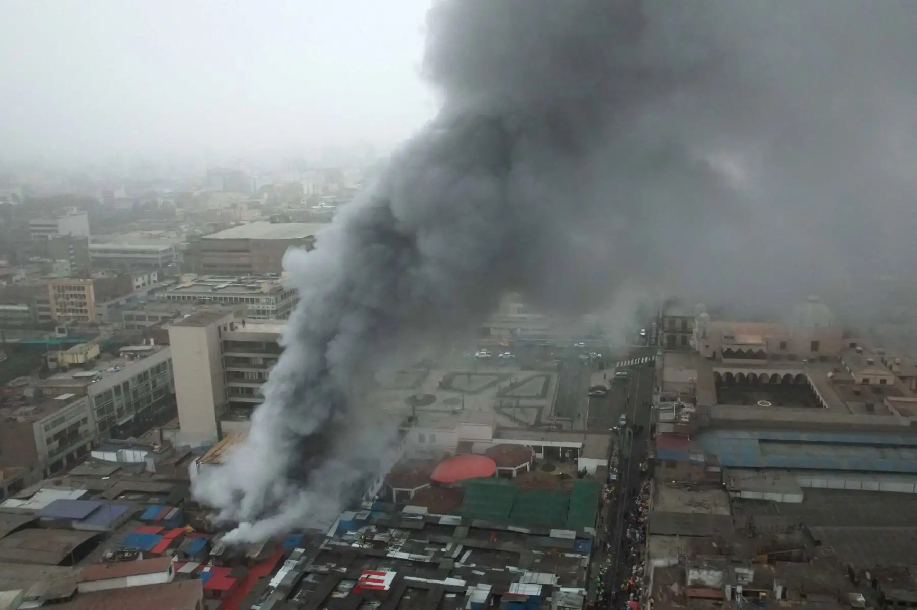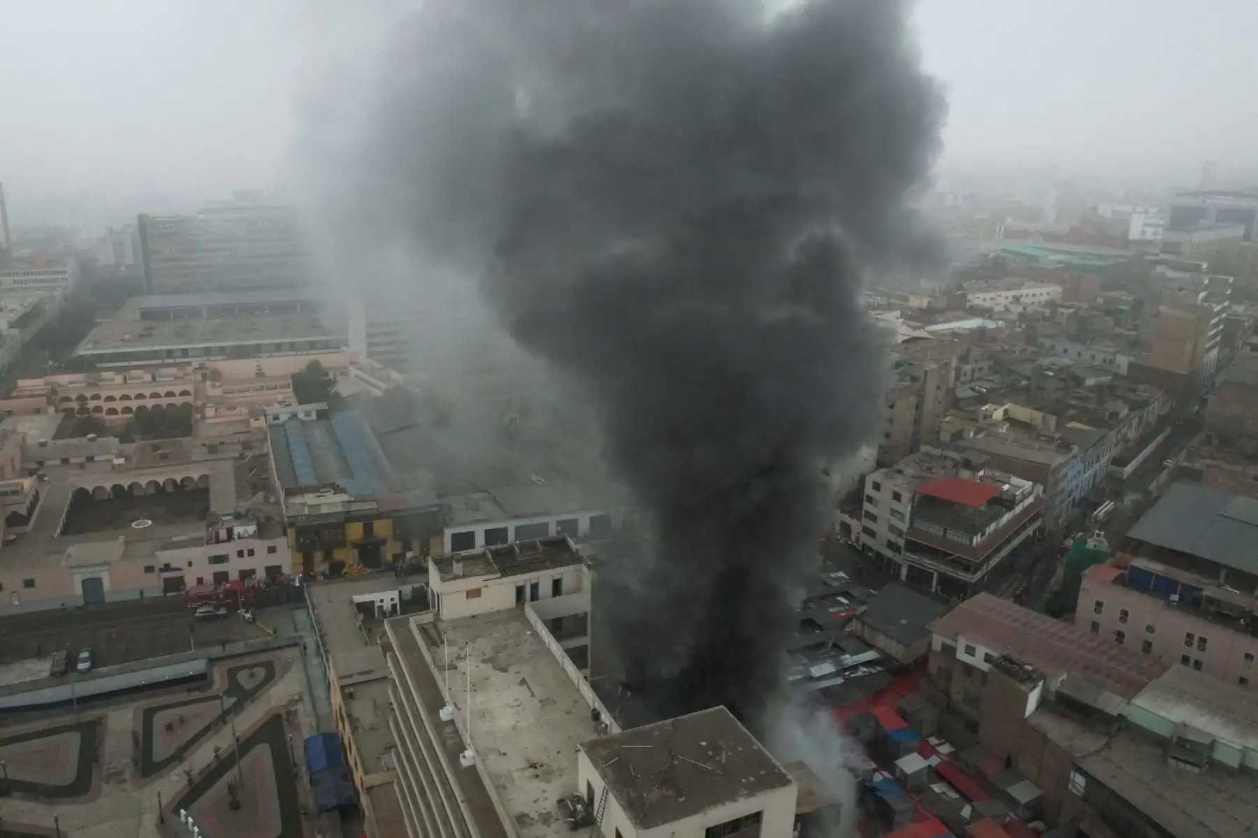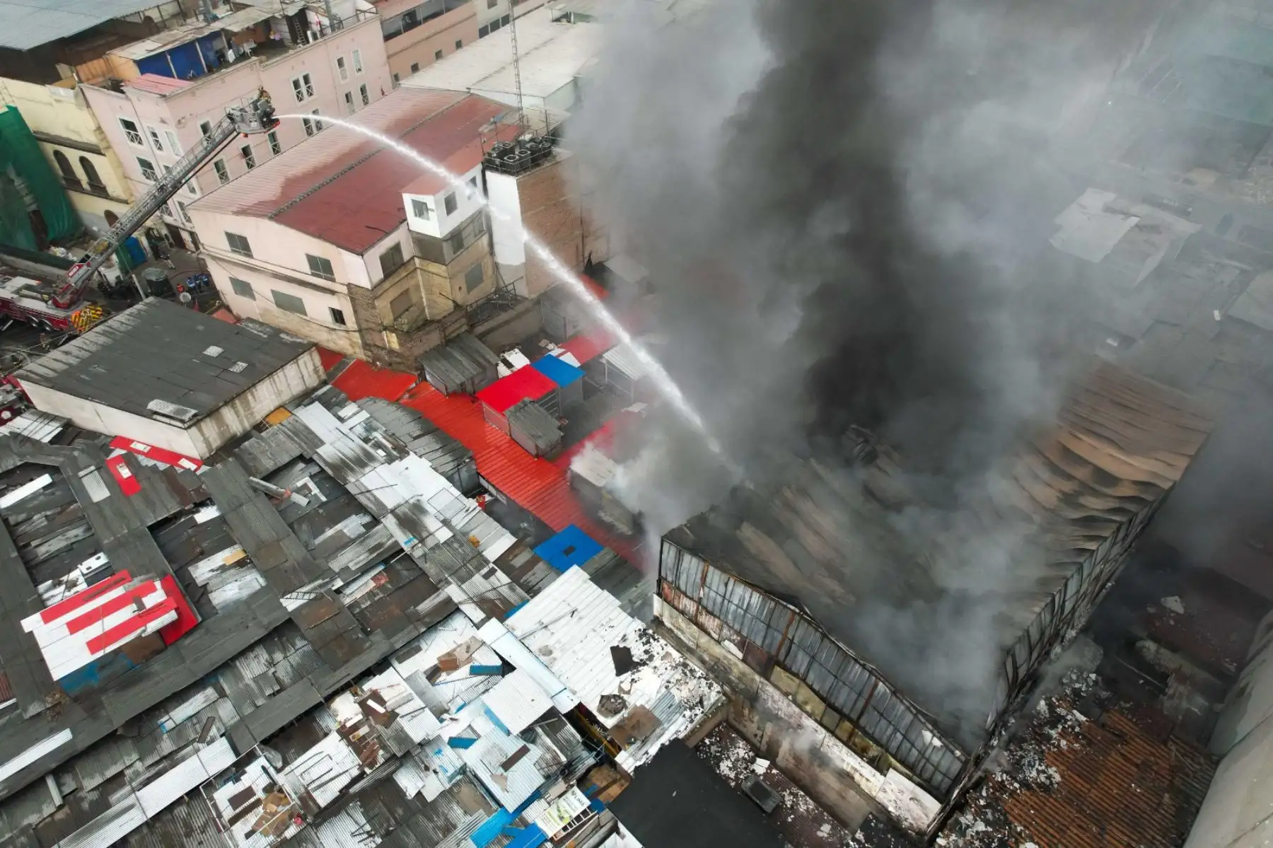 23/05/2024 Cerca de 16 unidades de bomberos intentan combatir un incendio que se registra, en estos momentos, en una galería comercial de Mesa Redonda a la altura de la cuadra 8 del jirón Andahuaylas cruce con jirón Ayacucho en el Cercado de Lima. Foto: ANDINA/ Daniel Bracamonte