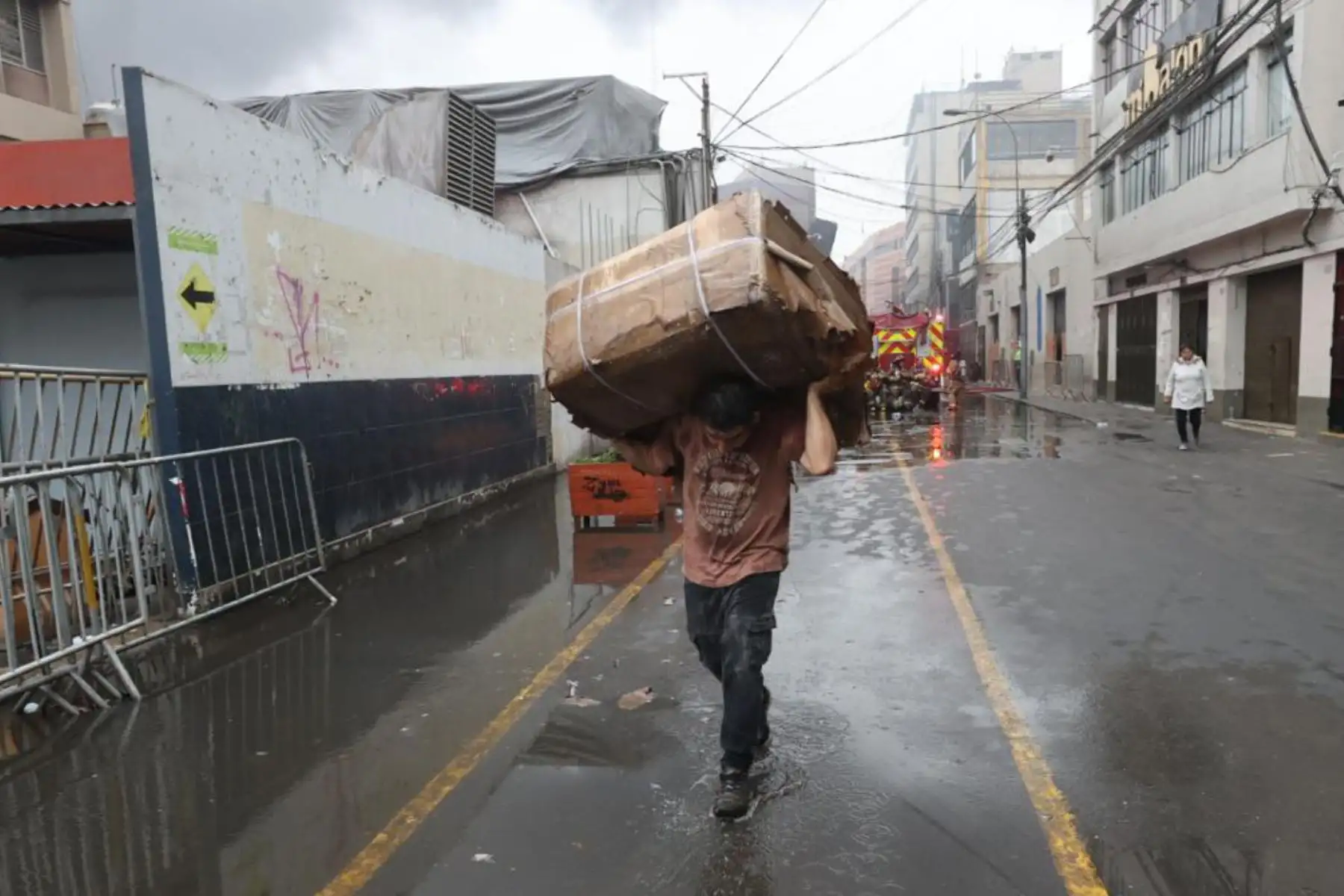 23/05/2024 Una escalera telescópica ha sido necesaria para aplacar el incendio en esta galería. Los comerciantes de las tiendas colindantes buscan salvaguardar sus mercaderías y ponerlas a buen recaudo. Foto: ANDINA/ Daniel Bracamonte