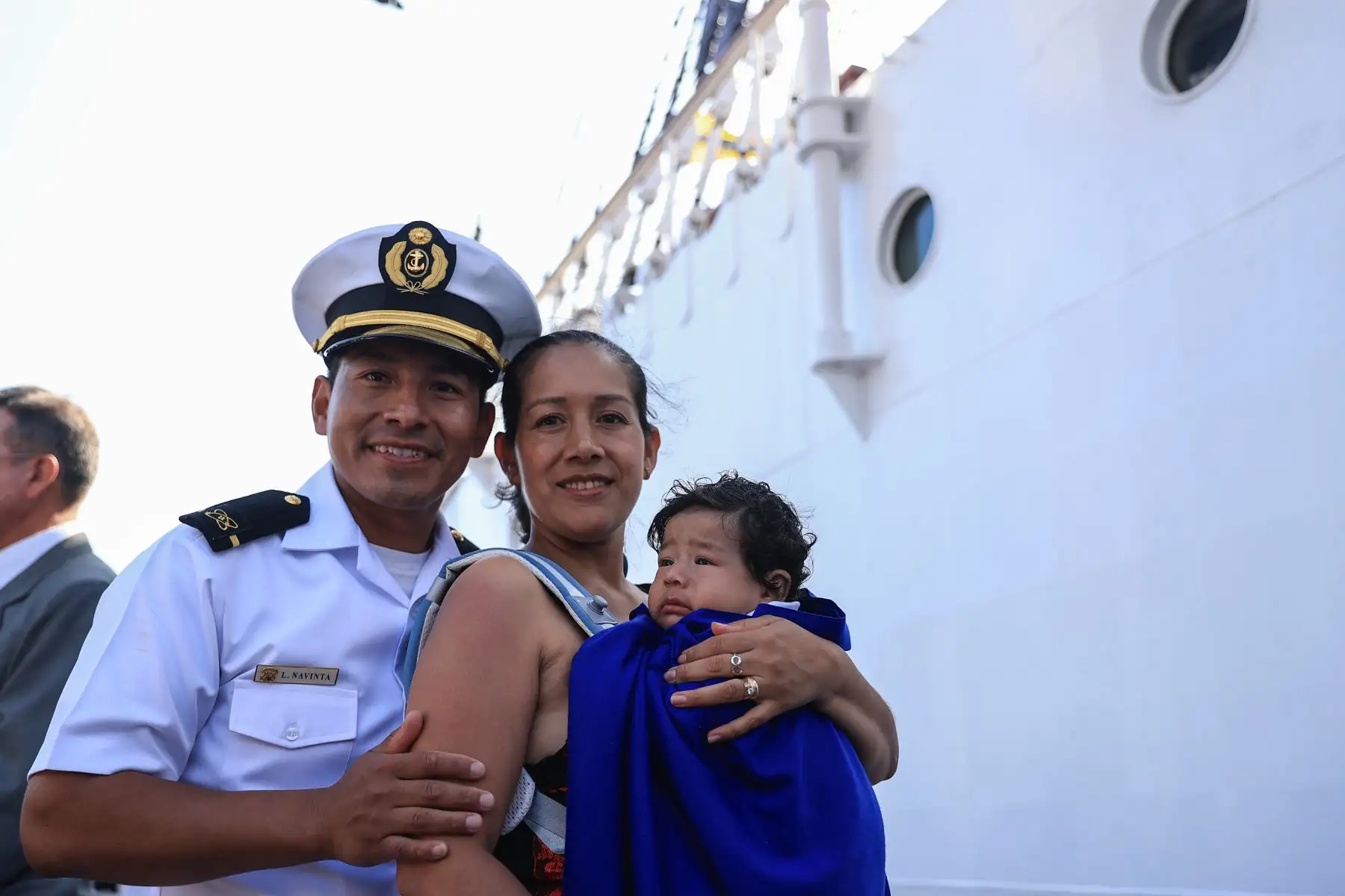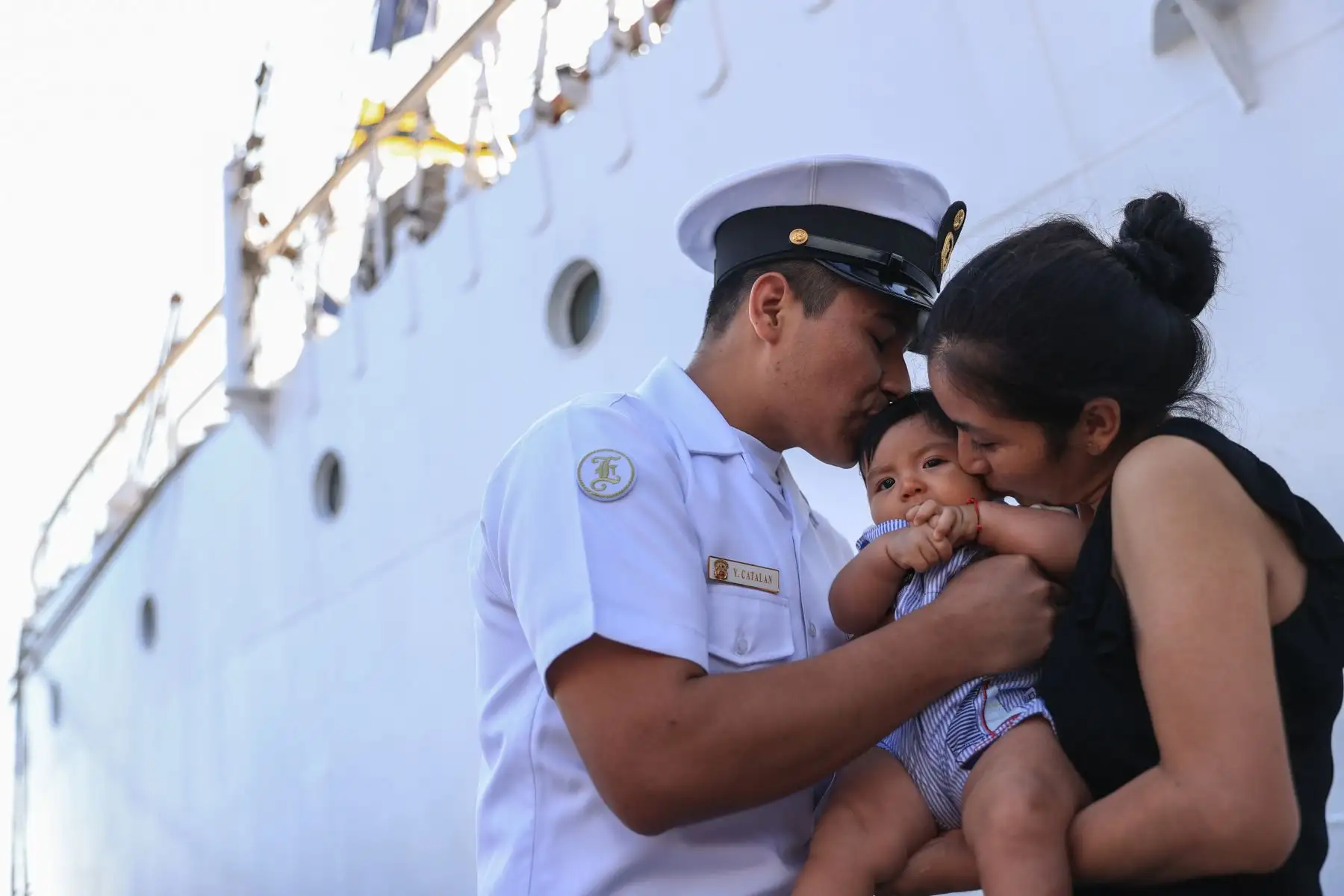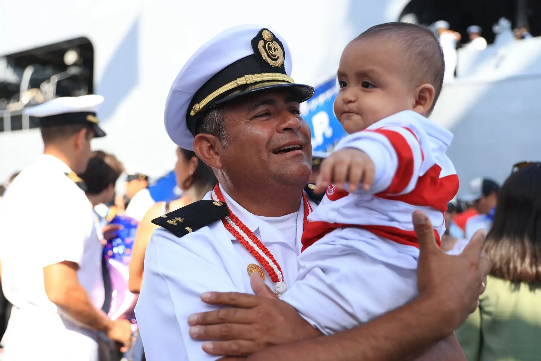 28/04/2024 Jack Vásquez, oficial de Mar de I, carga a su hijo por primera vez. Miembros de la tripulación del B.A.P. Unión tuvieron un primer encuentro con sus bebés quienes nacieron mientras ellos se encontraban viajando alrededor del mundo. El primer acercamiento fue muy emotivo porque solo habían visto a sus hijos a través de videollamadas y fotos. Foto: ANDINA/Jhonel Rodríguez Robles