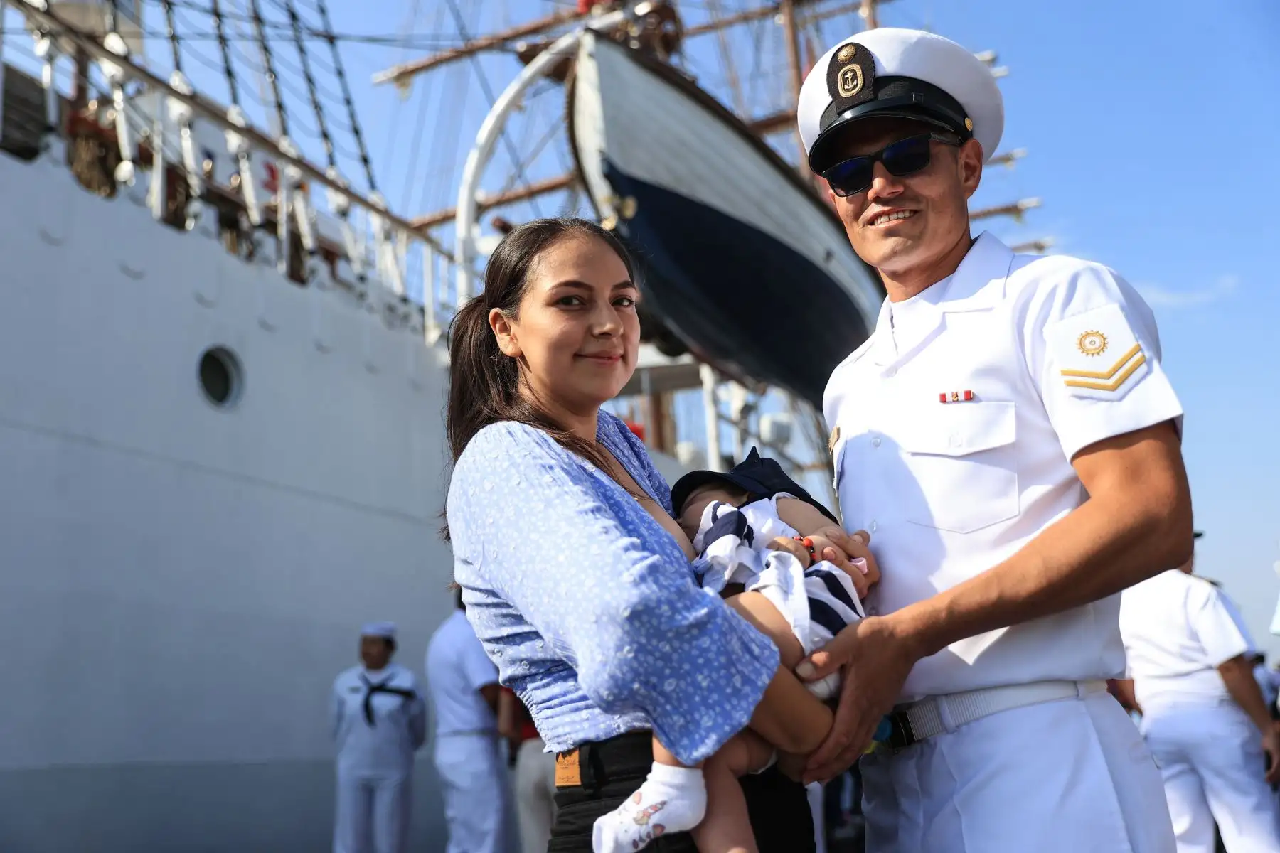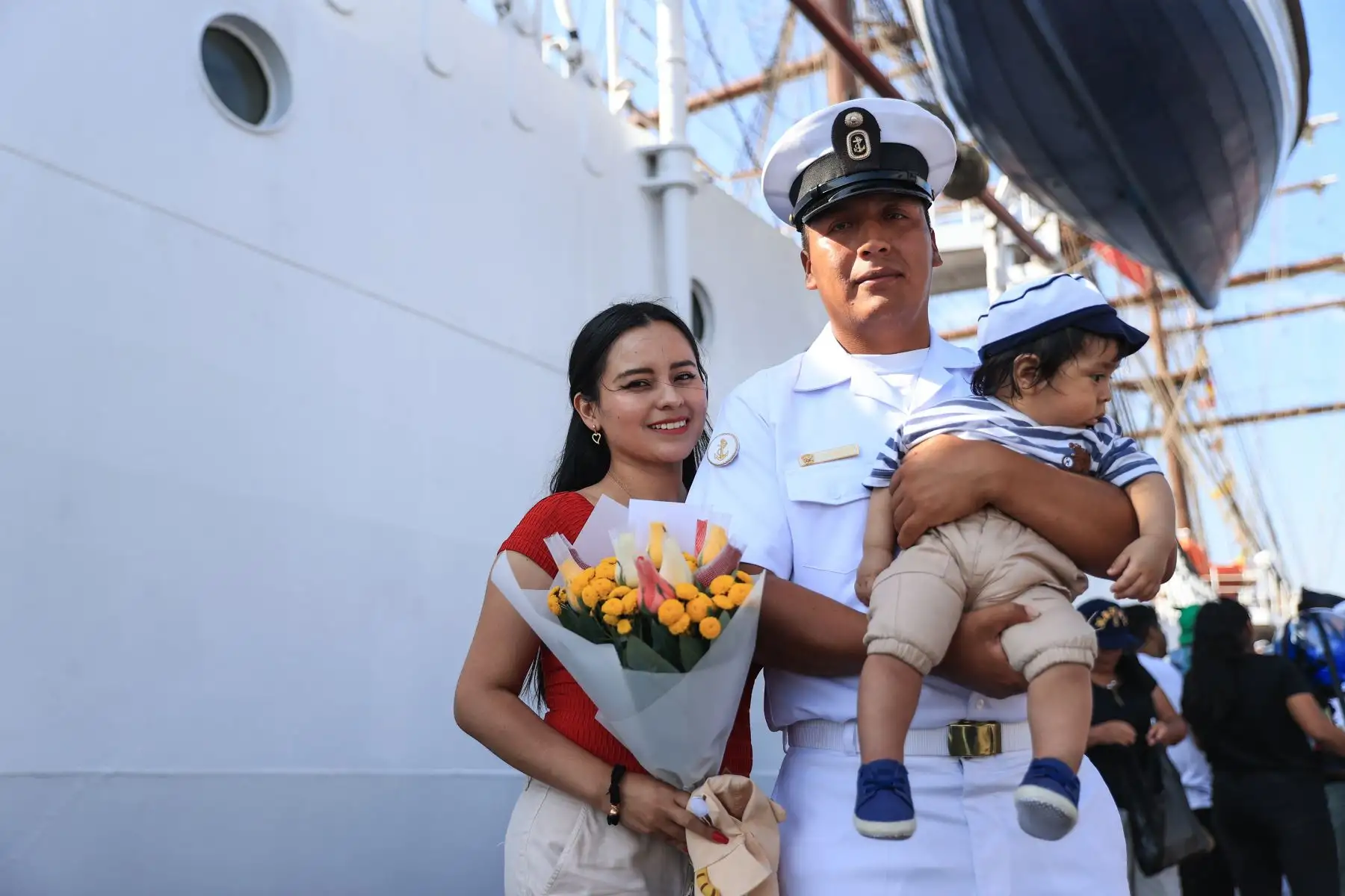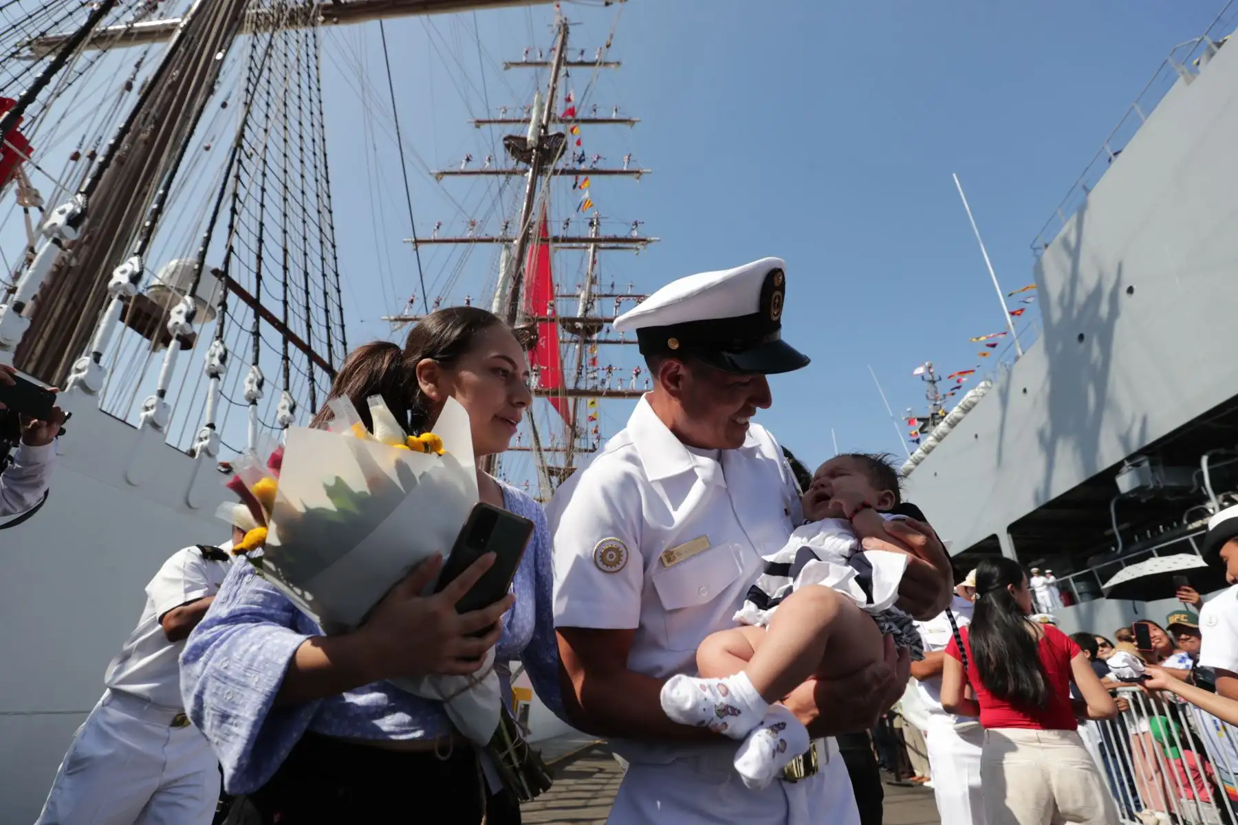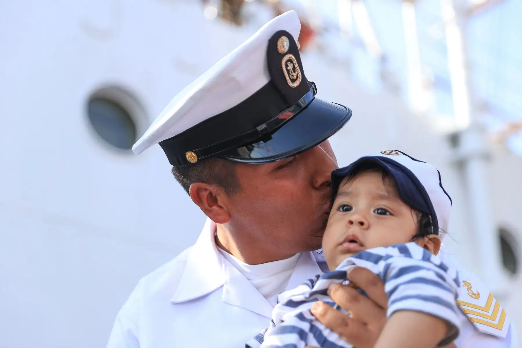 28/04/2024 Jack Vásquez, oficial de Mar de I, carga a su hijo por primera vez. Miembros de la tripulación del B.A.P. Unión tuvieron un primer encuentro con sus bebés quienes nacieron mientras ellos se encontraban viajando alrededor del mundo. El primer acercamiento fue muy emotivo porque solo habían visto a sus hijos a través de videollamadas y fotos. Foto: ANDINA/Jhonel Rodríguez Robles
