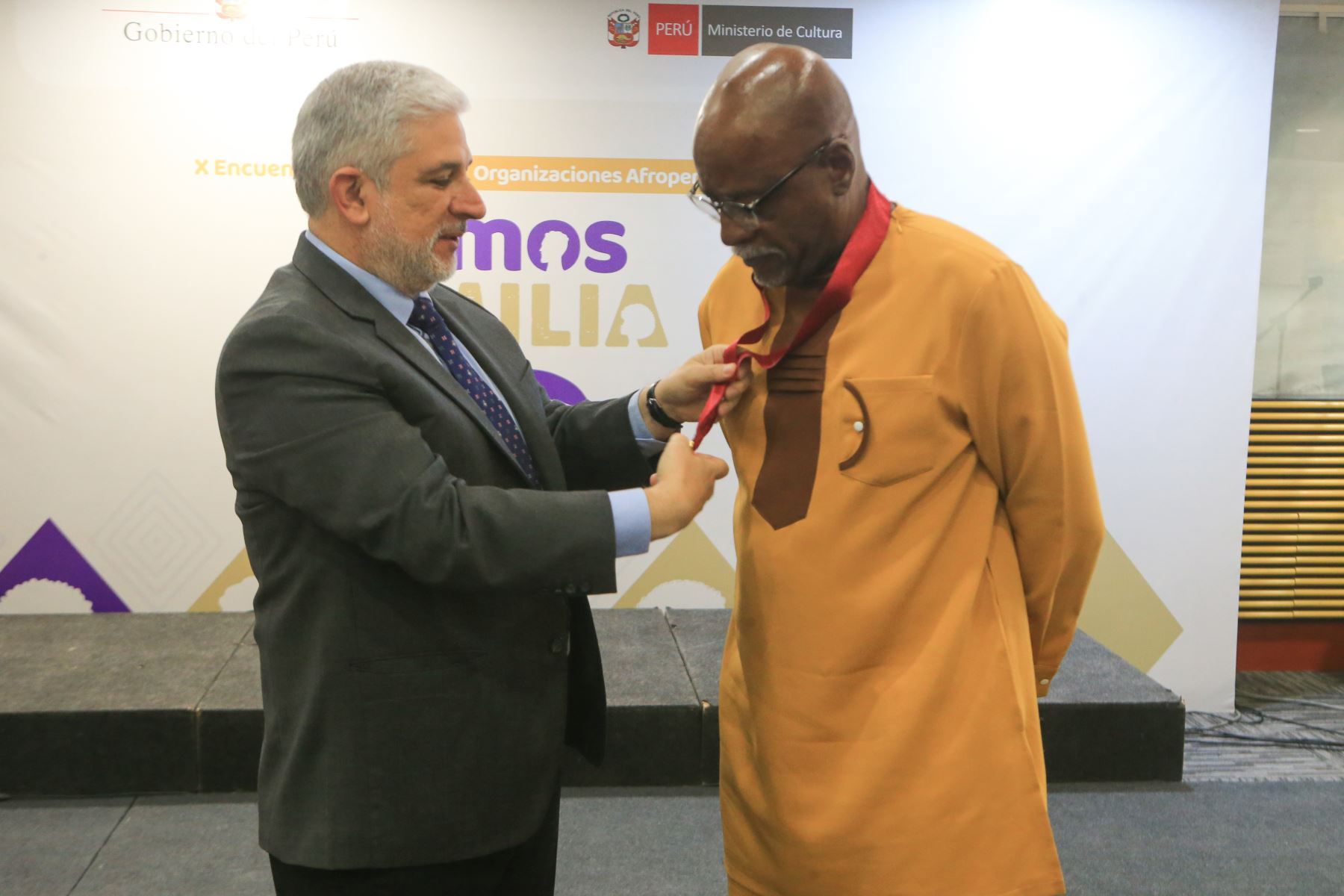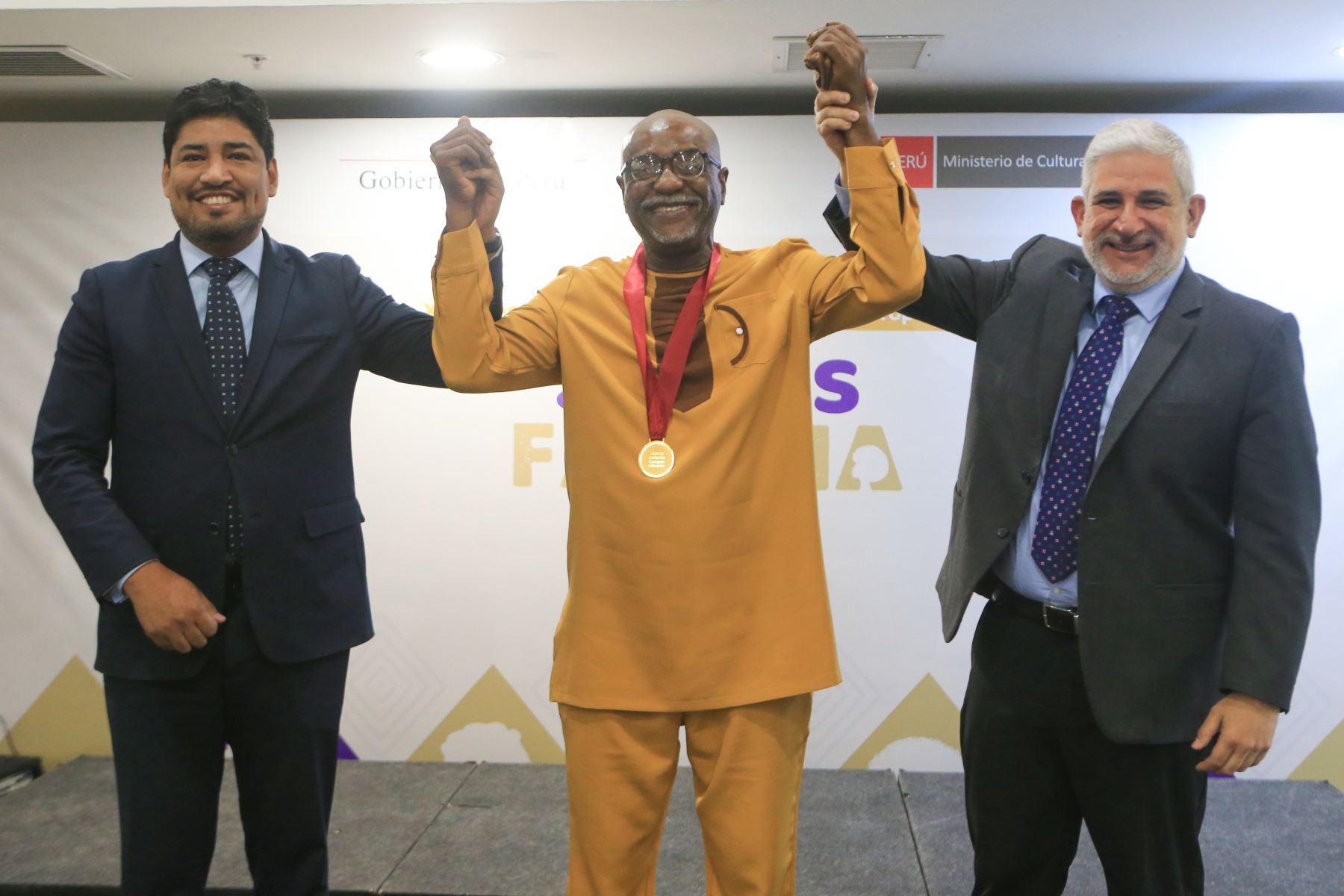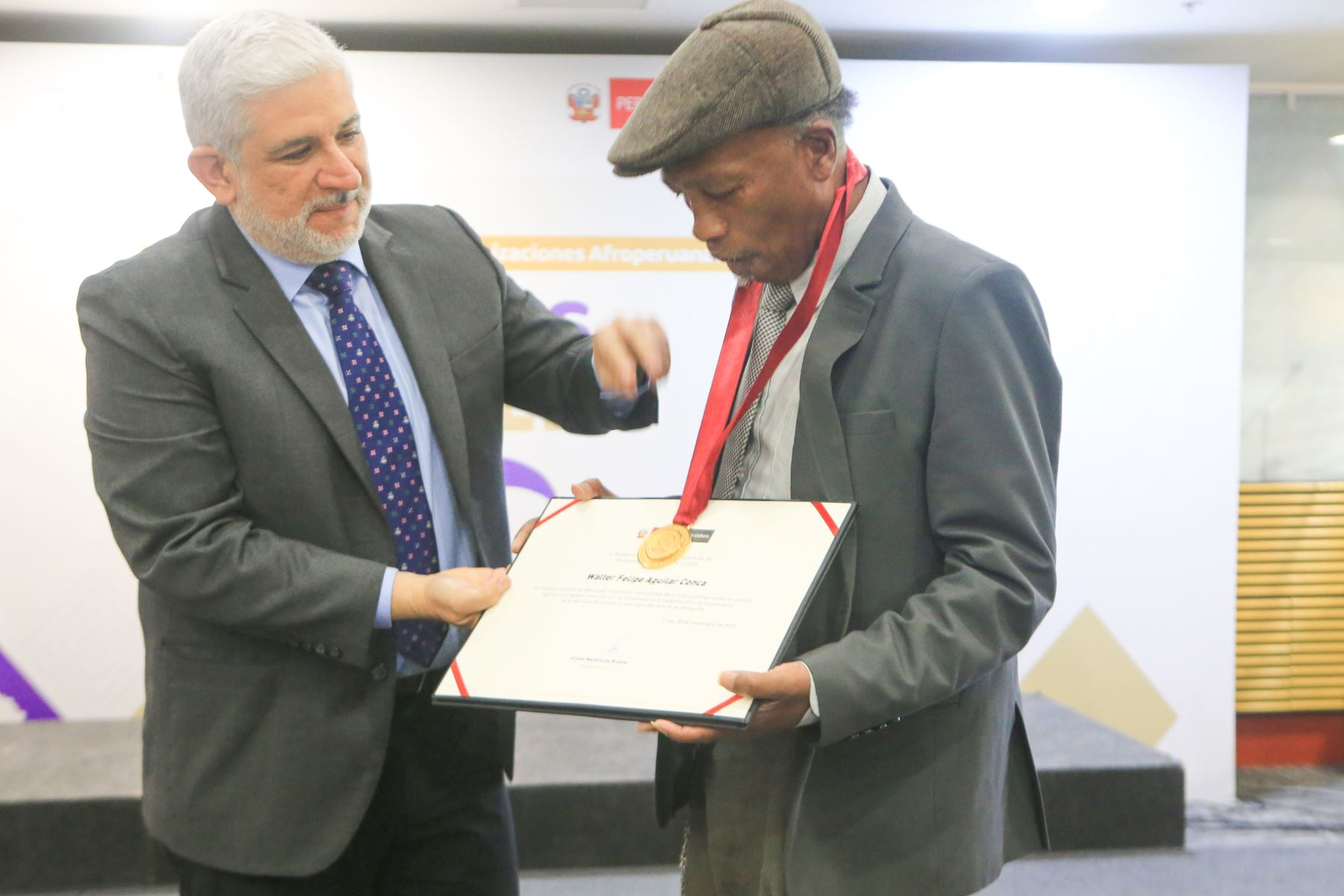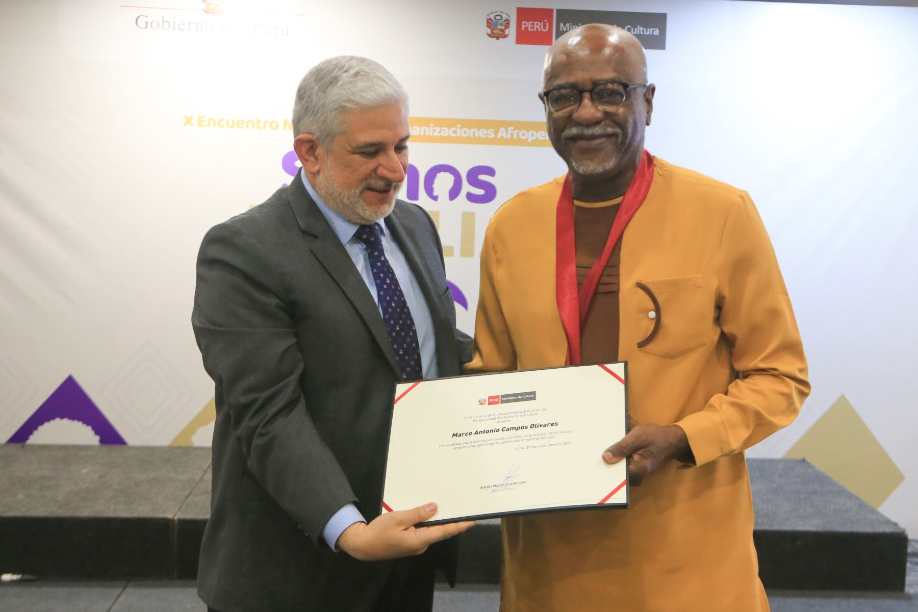 28/11/2025 Ministro de Cultura, Alfredo Luna entrega reconocimiento como Personalidad Meritoria de la Cultura a dos destacados artistas y difusores de la cultura afroperuana: Marco Campos y Walter Aguilar. Foto: ANDINA/Héctor Vinces