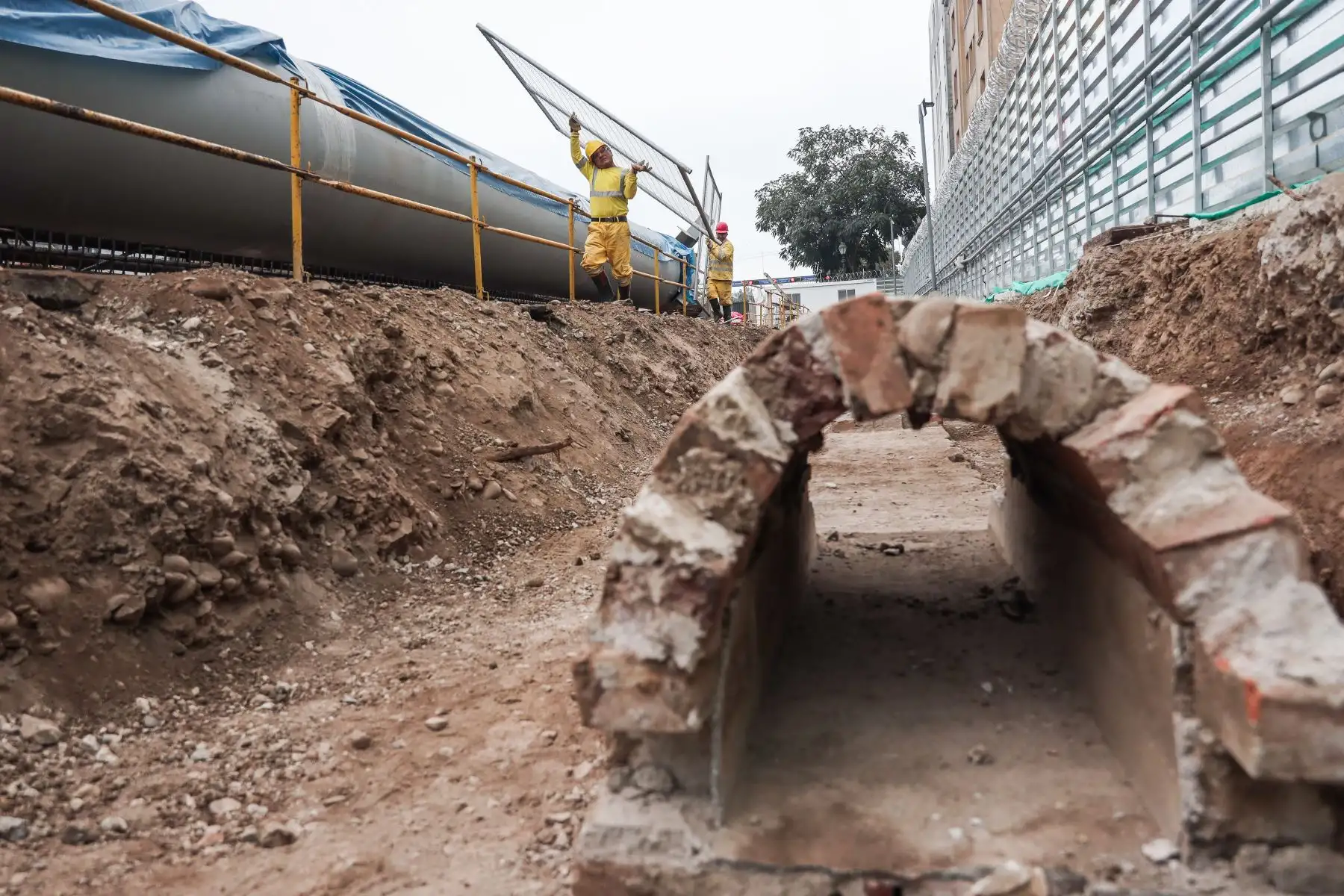 06/09/2024 El Ministerio de Cultura supervisa los trabajos de preservación de dos albañales (antiguo sistema de alcantarillado de Lima) y la base de una pileta que serían de los primeros años de la etapa republicana, de inicios del siglo XIX, descubiertas durante los trabajos de construcción de la Estación E13 de la Línea 2 del Metro de Lima, ubicada en el Cercado de Lima. Foto: ANDINA/ Connie Calderon