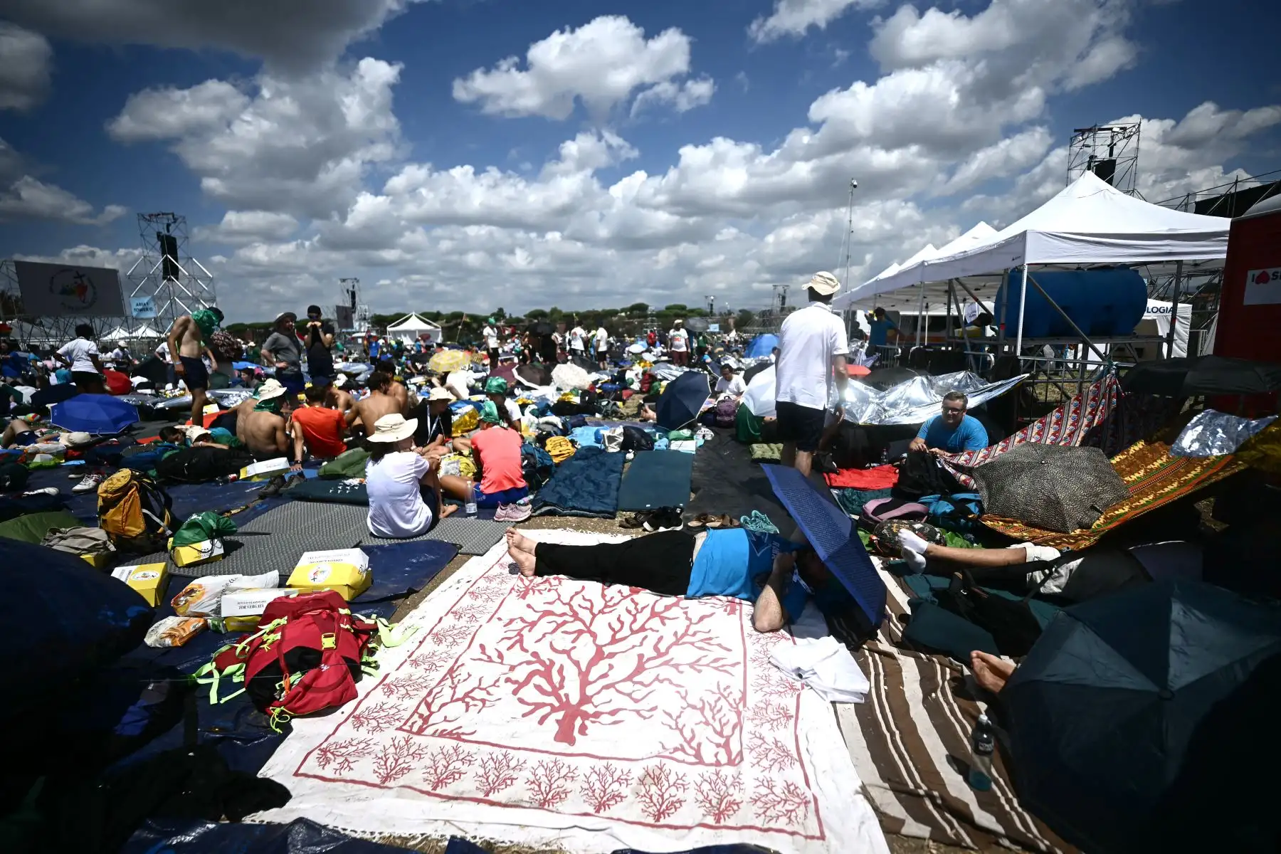 02/08/2025 Los asistentes son rociados con manguera para refrescarse mientras los jóvenes y peregrinos se reúnen en el barrio oriental de Tor Vergata en Roma para una vigilia de oración dirigida por el Papa antes de la misa del domingo como parte del Jubileo de la Juventud.