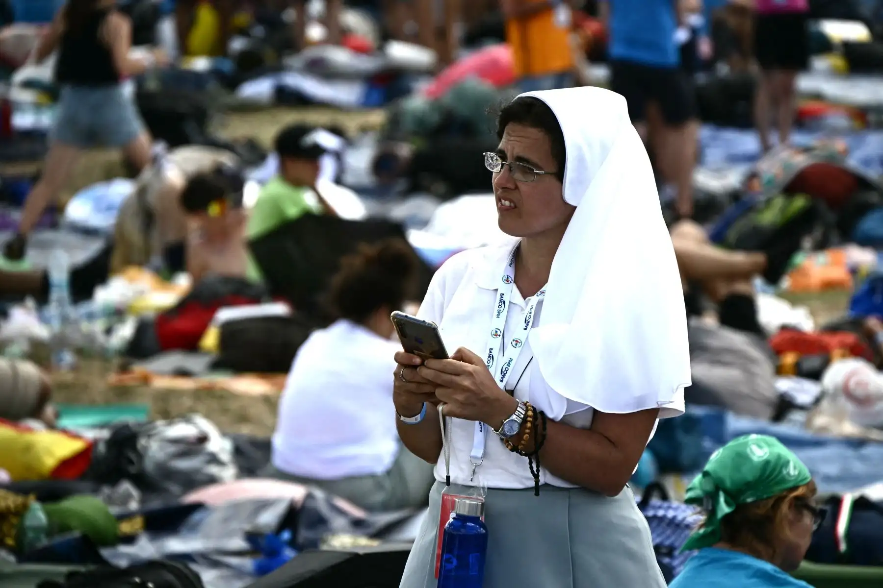 02/08/2025 Una monja observa cómo los jóvenes y peregrinos se reúnen en el barrio oriental de Tor Vergata en Roma para una vigilia de oración dirigida por el Papa antes de la misa del domingo como parte del Jubileo de la Juventud.