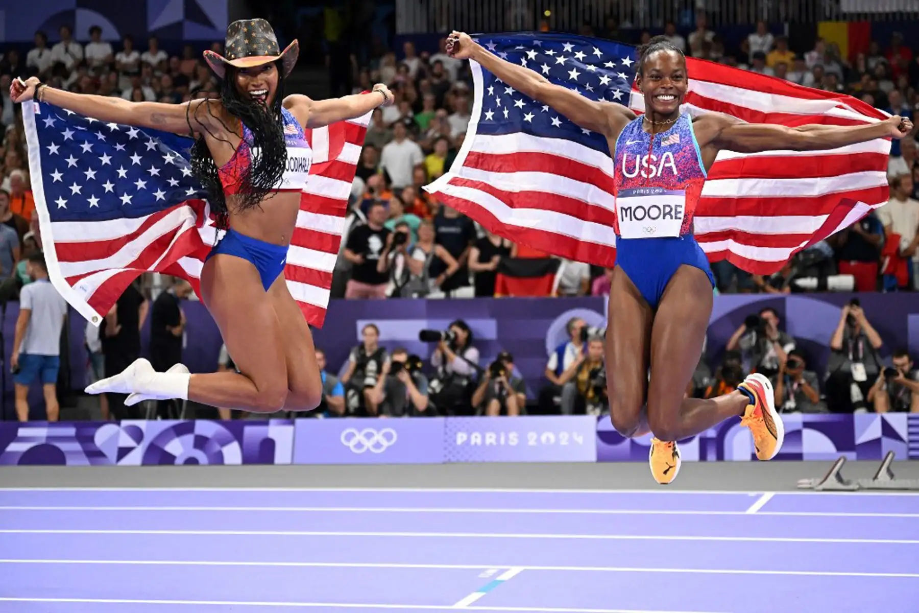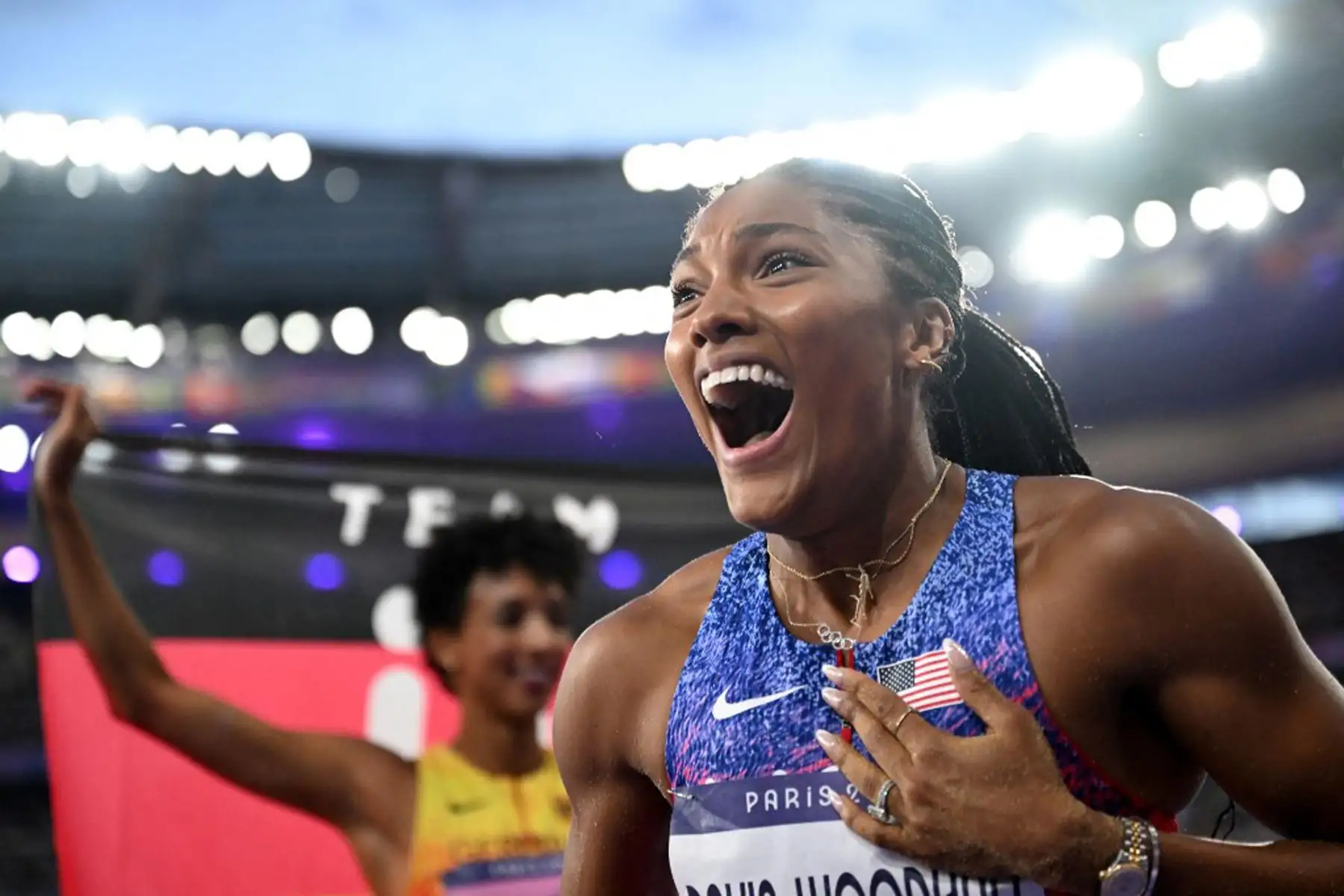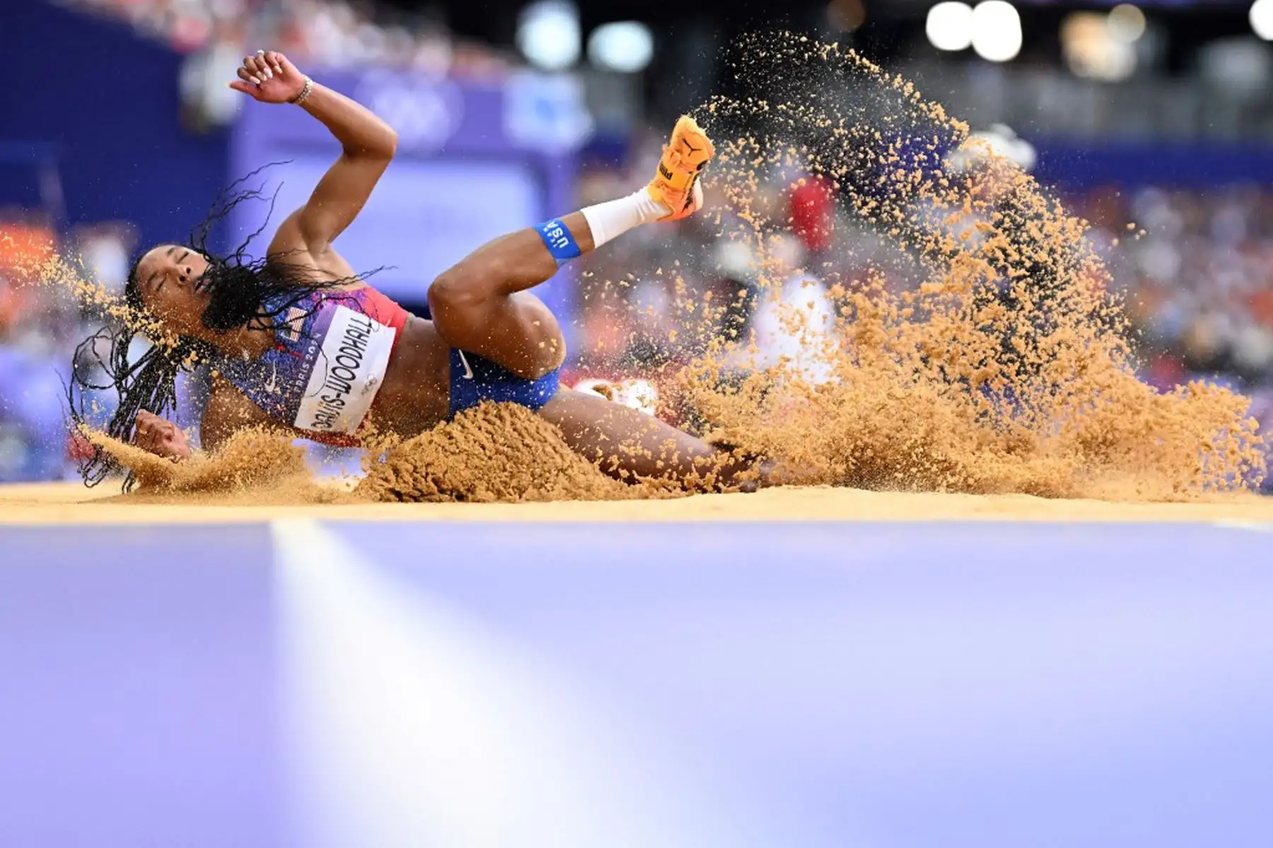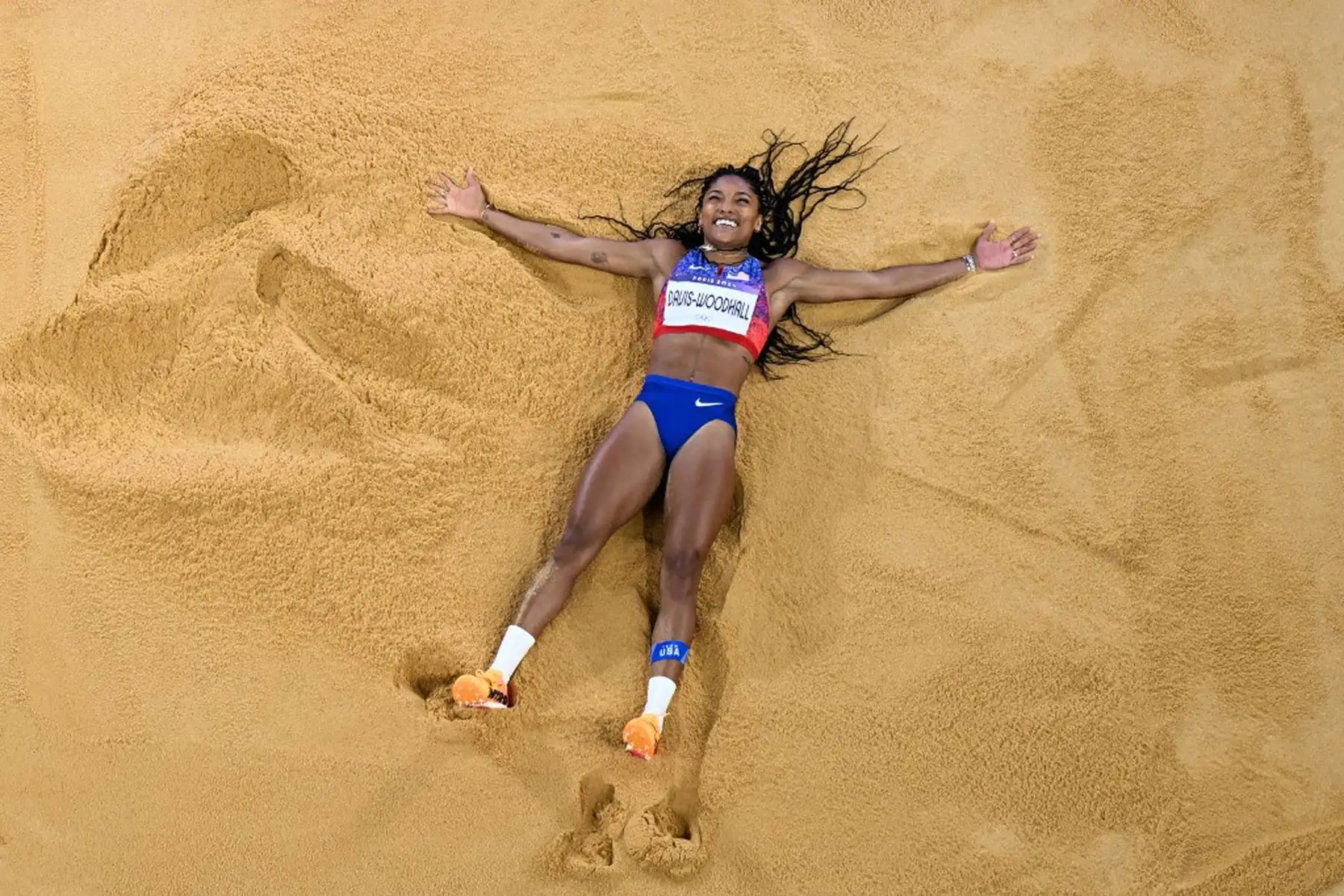 09/08/2024 La estadounidense Tara Davis-Woodhall compite en la final femenina de salto largo en los Juegos Olímpicos de París 2024 en el Stade de France de Saint-Denis. Foto: AFP
