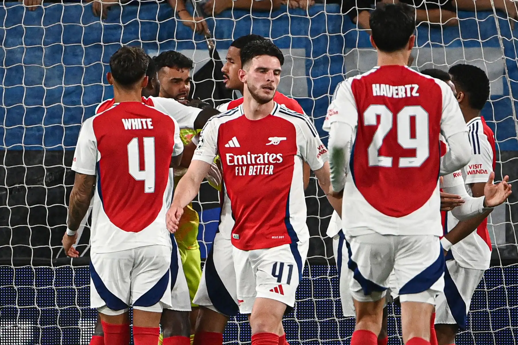 19/09/2024 Los jugadores del Arsenal felicitan al portero español número del Arsenal, David Raya (trasero izq.) después de desviar un penalti durante el partido de fútbol de la primera ronda de la UEFA Champions League entre Atalanta Bergamo y Arsenal. Foto. ANDINA/ AFP