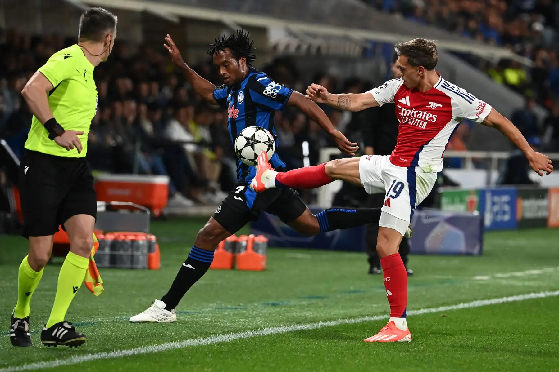 19/09/2024 El centrocampista colombiano del Atalanta, Juan Cuadrado, y el delantero belga del Arsenal, Leandro Trossard, se lanzan al balón durante el partido de fútbol de la primera ronda de la UEFA Champions League entre el Atalanta Bergamo y el Arsenal.
