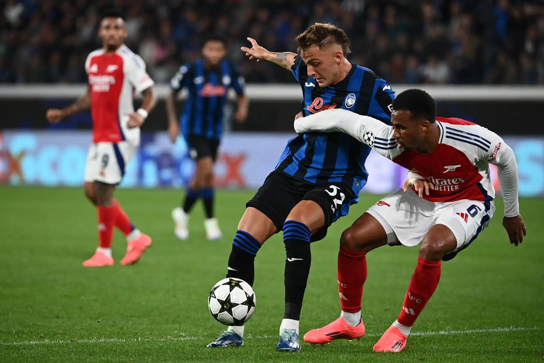 19/09/2024 El delantero inglés del Arsenal, el número 30 Raheem Sterling, desafía al defensor bosnio del Atalanta, el número 23 Sead Kolasinac durante el partido de fútbol de la primera ronda de la UEFA Champions League entre el Atalanta Bergamo y el Arsenal.