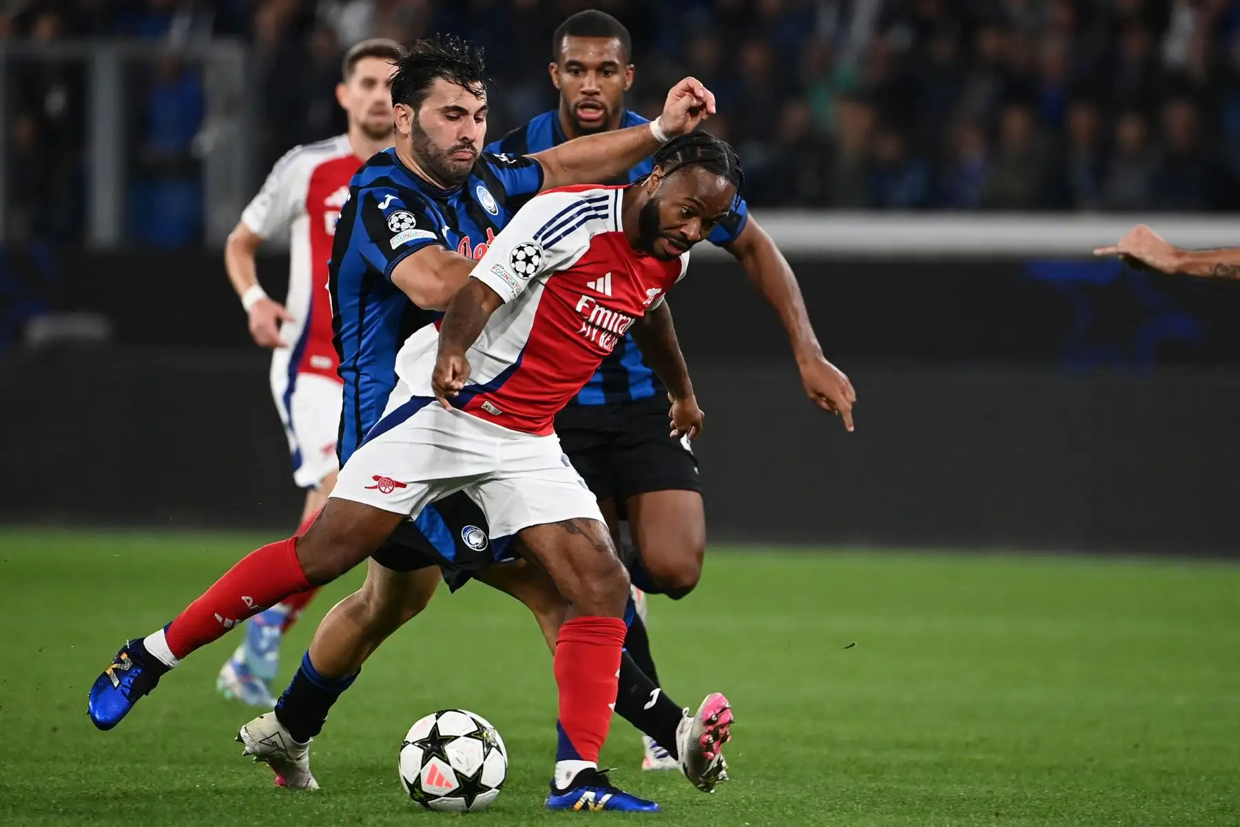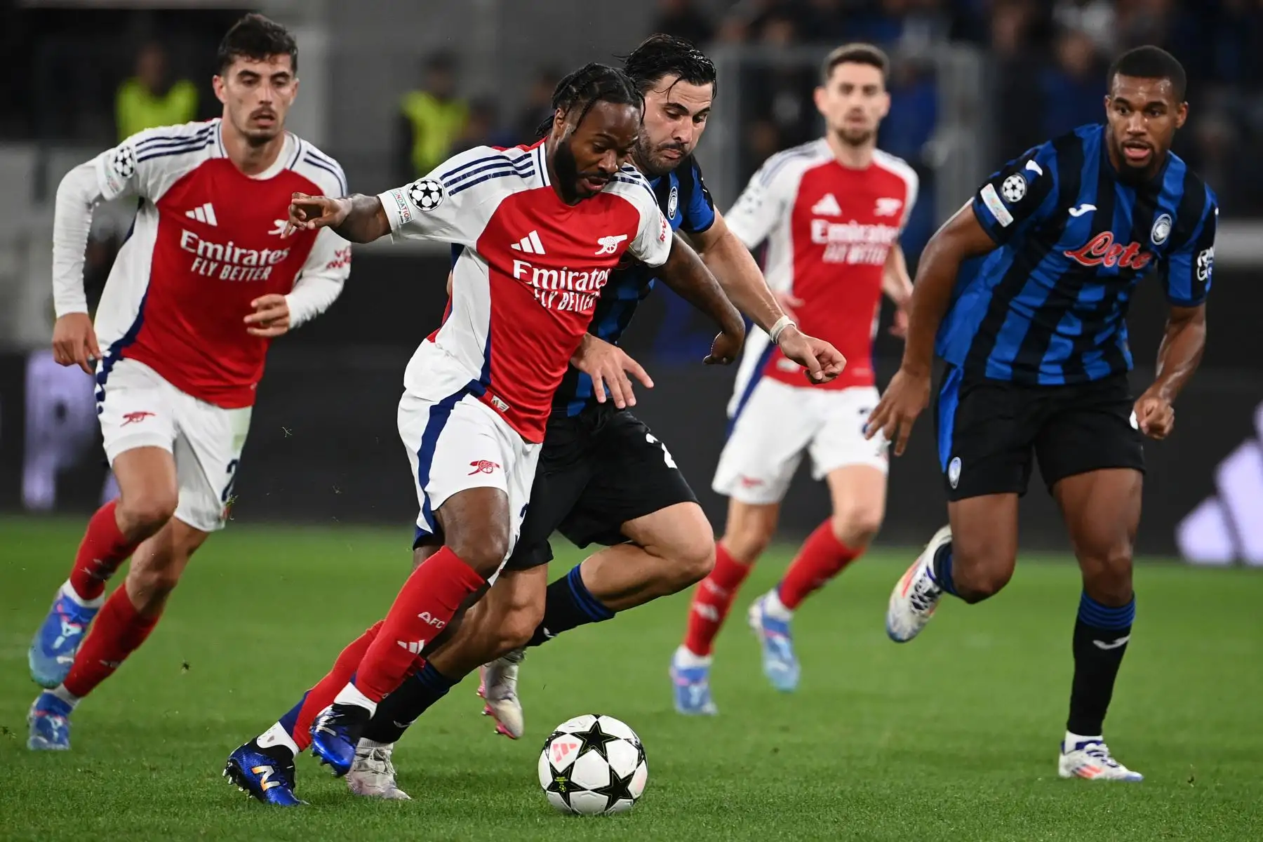 19/09/2024 El delantero inglés del Arsenal, el número 30 Raheem Sterling desafía al defensor bosnio del Atalanta, el número 23 Sead Kolasinac, durante el partido de fútbol de la primera ronda de la UEFA Champions League entre el Atalanta Bergamo y el Arsenal. Foto. ANDINA/ AFP