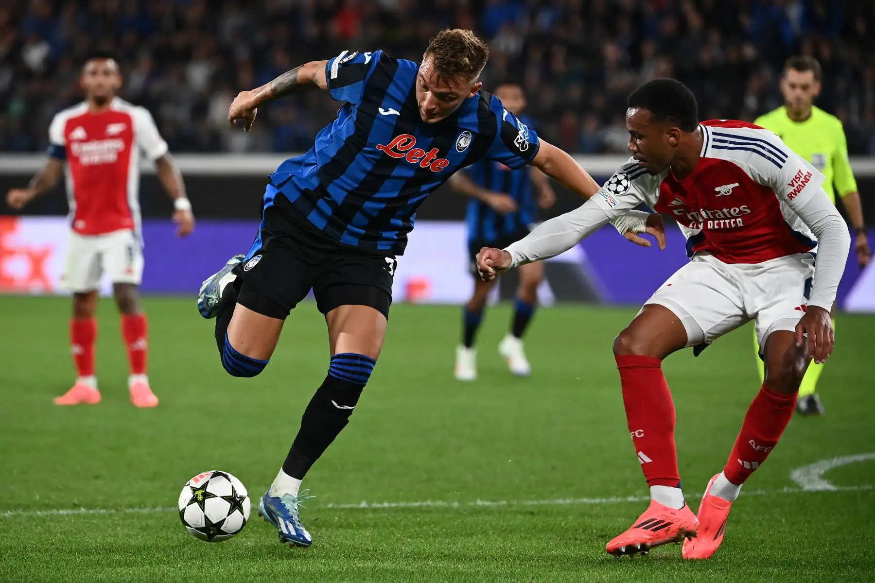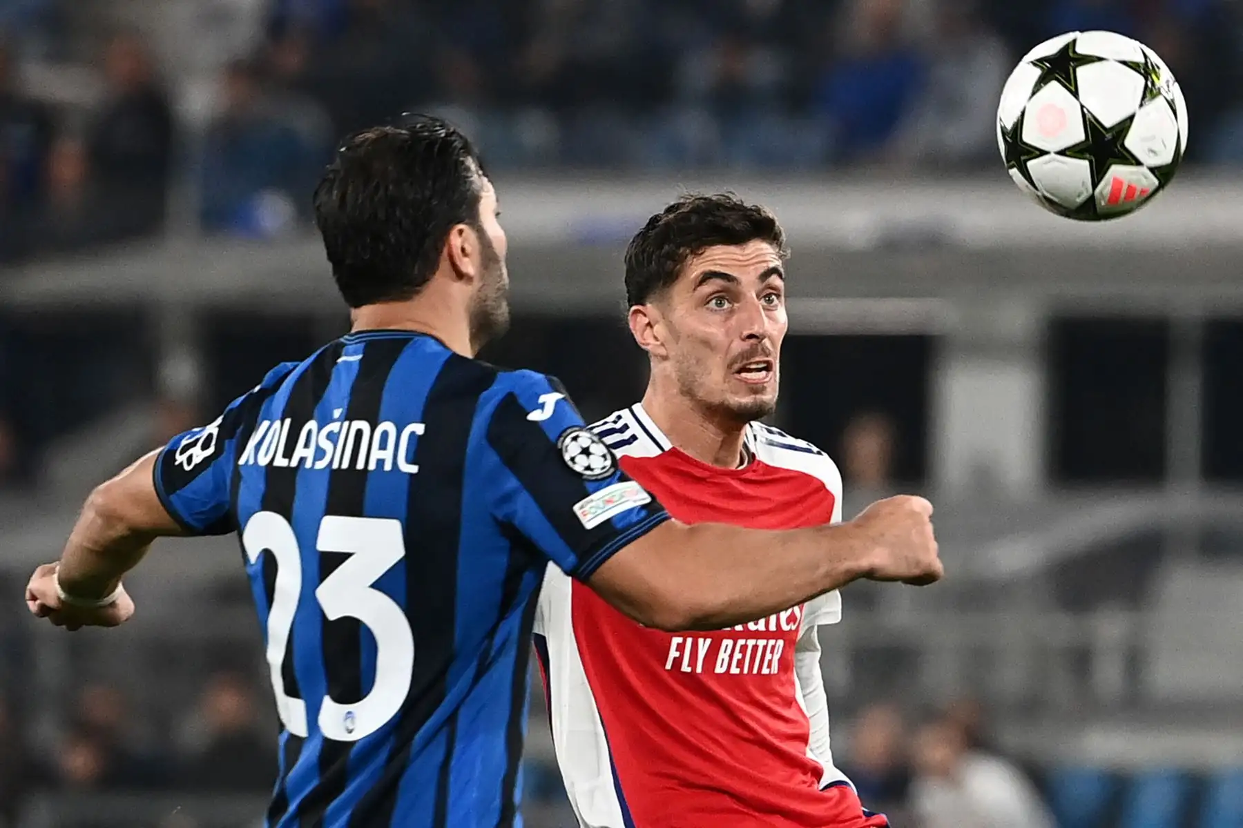 19/09/2024 El defensa bosnio del Atalanta, Sead Kolasinac, y el centrocampista alemán del Arsenal, Kai Havertz, se lanzan a por el balón durante el partido de fútbol de la primera jornada de la primera ronda de la UEFA Champions League entre el Atalanta Bergamo y el Arsenal. Foto. ANDINA/AFP