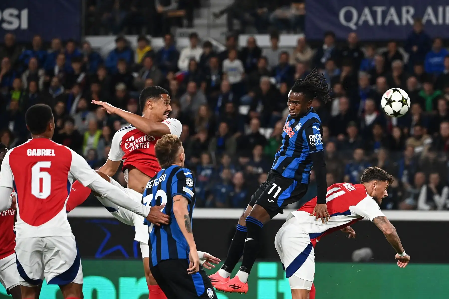 19/09/2024 El defensa inglés del Arsenal, Ben White, el delantero nigeriano del Atalanta, Ademola Lookman, y el defensa francés del Arsenal, William Saliba, intentan un cabezazo durante el partido de fútbol de la primera ronda de la UEFA Champions League, día 1, entre el Atalanta Bergamo y el Arsenal. Foto: ANDINA/AFP