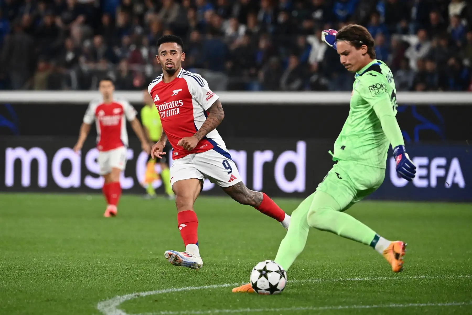 19/09/2024 El portero italiano del Atalanta, Marco Carnesecchi, despeja el balón presionado por el delantero brasileño del Arsenal, Gabriel Jesus, durante el partido de fútbol de la primera ronda de la UEFA Champions League, día 1, entre el Atalanta Bergamo y el Arsenal. Foto. ANDINA/ AFP