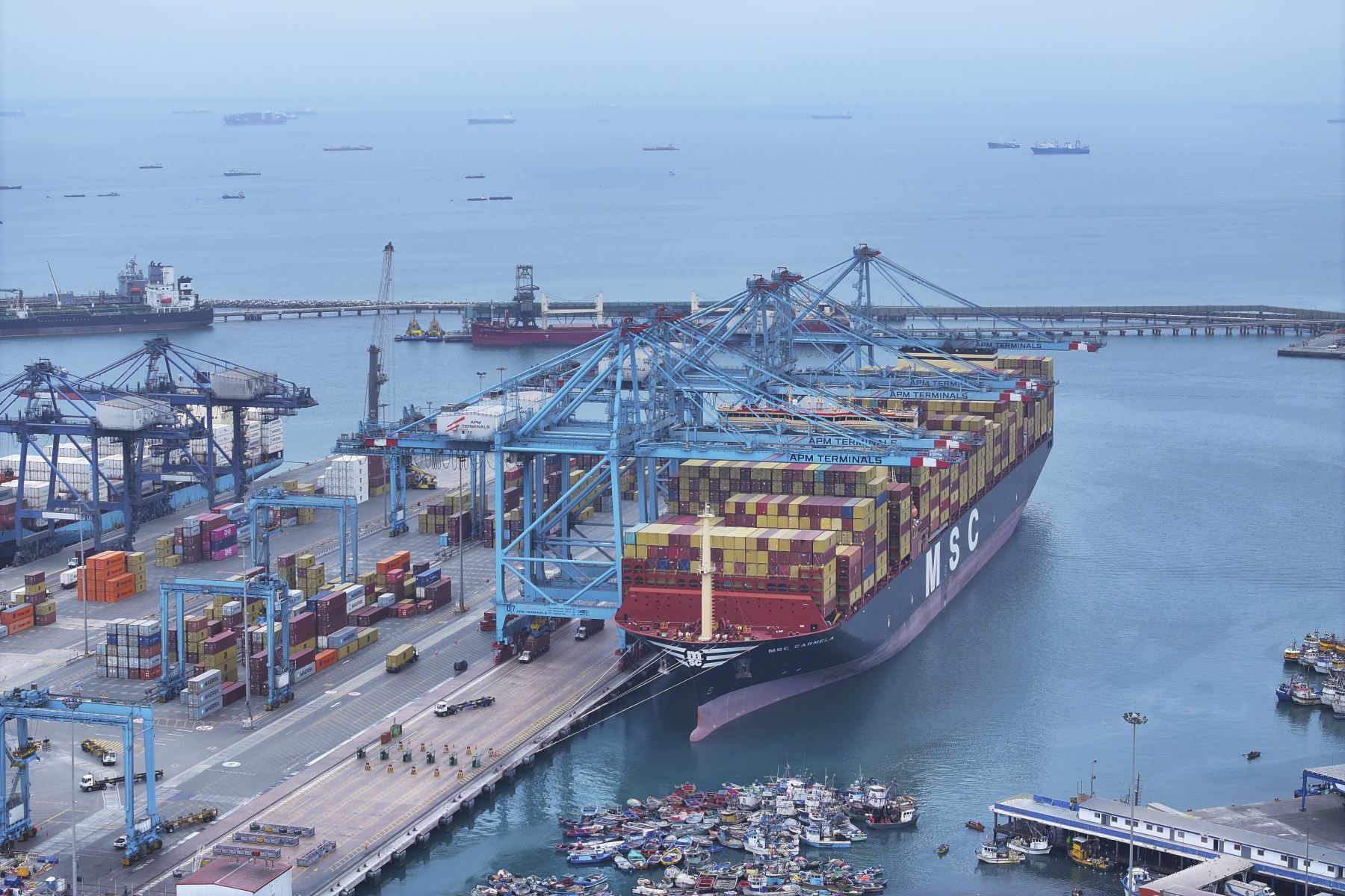 19/11/2025 Se inauguró el Servicio Alpaca en APM Terminals Callao, una nueva ruta naviera que conectará al Perú con los puertos de Ningbo (China) y Busan (Corea del Sur) sin escalas, reduciendo el tiempo de traslado a aproximadamente 23 días. La embarcación MSC Carmela es una de las primeras en utilizar este sistema. Foto: ANDINA/Jhonel Rodríguez Robles