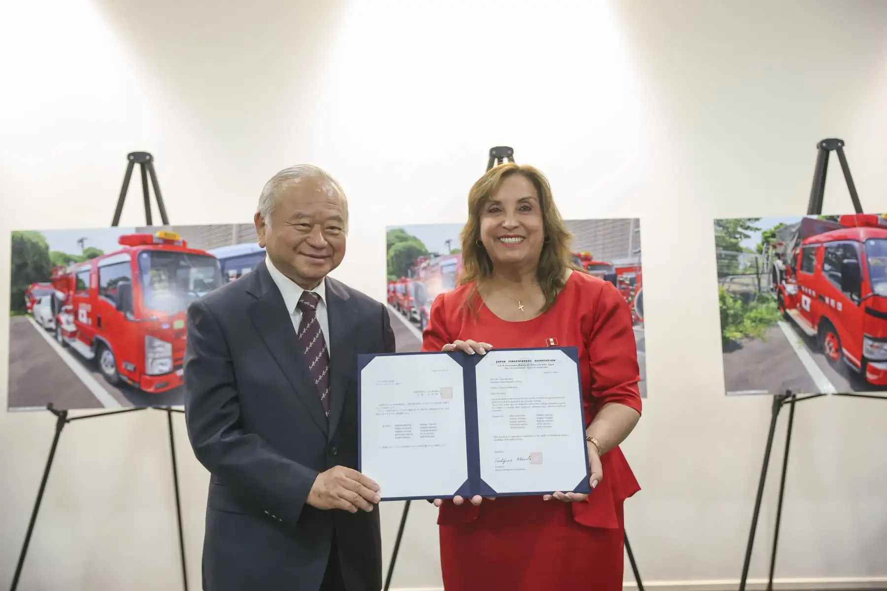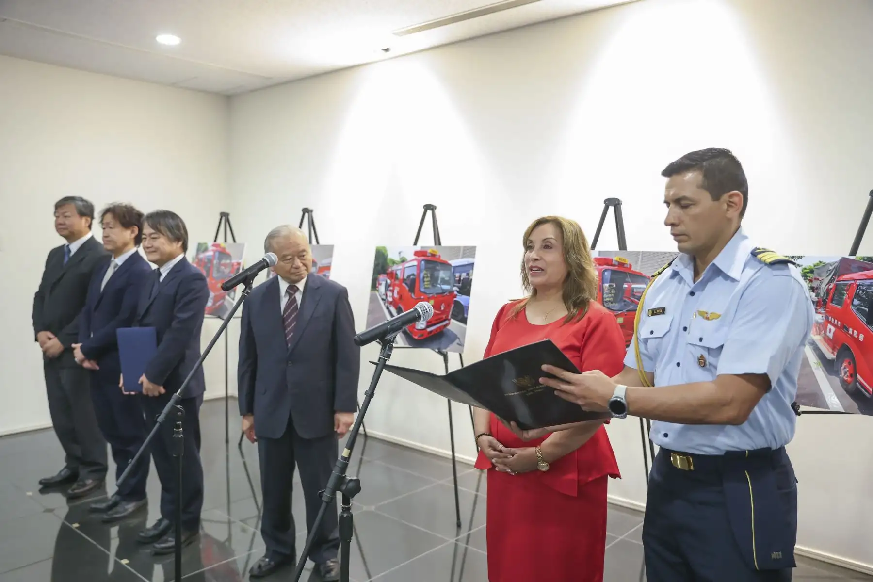 06/08/2025 Durante una ceremonia oficial, la presidenta de la República, Dina Boluarte, recibió la donación de 10 vehículos de bomberos por parte del gobierno de Japón. Estas unidades mejorarán las capacidades operativas del Cuerpo General de Bomberos Voluntarios del Perú en las regiones de Huánuco, Madre de Dios, Piura, Ica, Lima, Loreto, Apurímac y el Callao. Foto: ANDINA/Presidencia