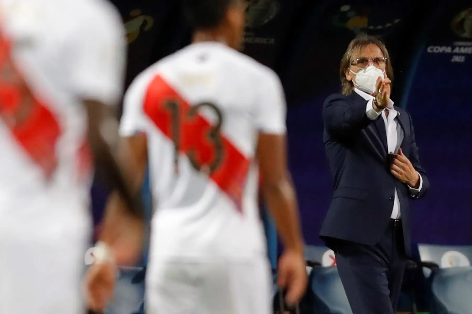 02/07/2021 El entrenador Ricardo Gareca de Perú dirige a sus jugadores contra Paraguay durante un partido por los cuartos de final de la Copa América, en el estadio Olímpico Pedro Ludovico Teixeira, en Goiania, Brasil. Foto: EFE