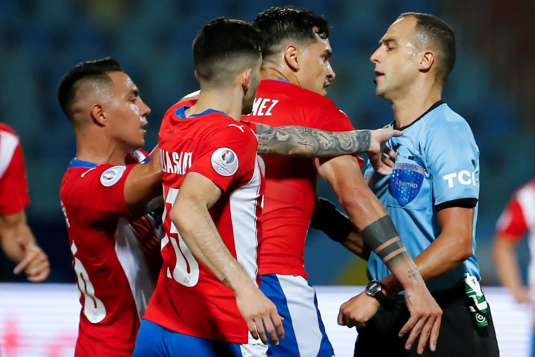 02/07/2021 Gustavo Gómez de Paraguay reclama al árbitro Esteban Ostojich durante partido por los cuartos de final de la Copa América, en el estadio Olímpico Pedro Ludovico Teixeira, en Goiania, Brasil. Foto: EFE