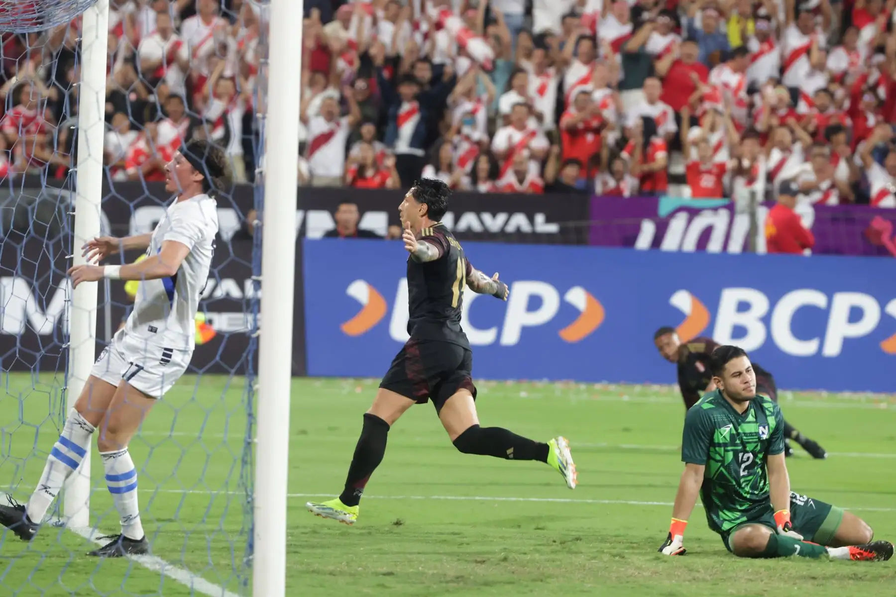22/03/2024 El jugador Joao Grimaldo de la selección peruana celebra su gol, anotado ante la Selección de Nicaragua, en un partido amistoso que se disputa en el estadio Alejandro Villanueva de La Victoria.