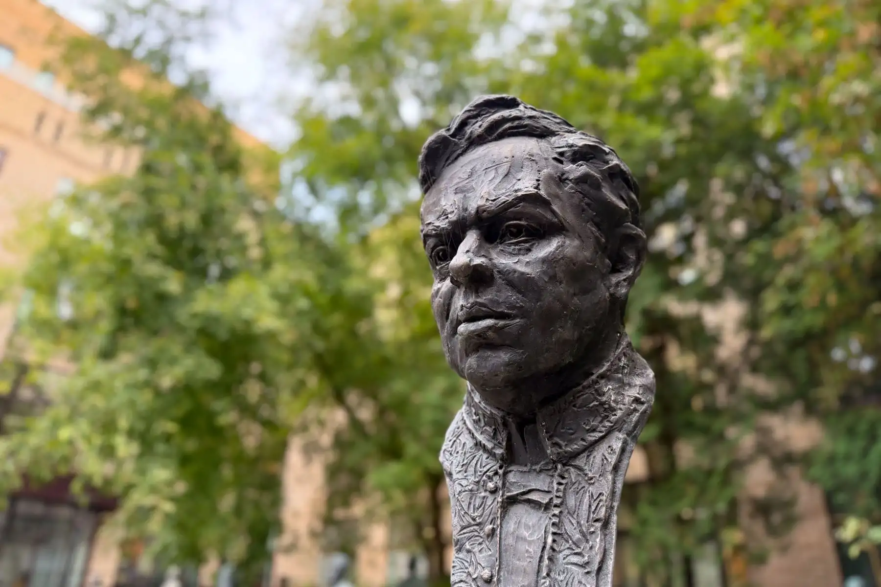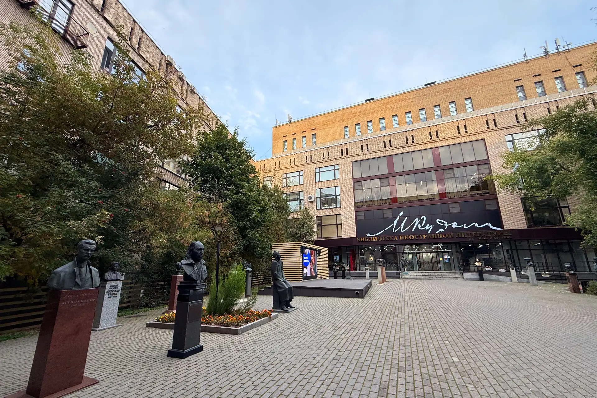 05/12/2025 El patio de ingreso a la Biblioteca Estatal Panrusa de Literatura Extranjera Margarita Rudomino, ubicada en Moscú, Rusia, alberga una valiosa colección de bustos y estatuas de destacados personajes de la política, la ciencia y la cultura de todo el mundo, entre ellos de algunos latinoamericanos como Simón Bolivar, Rubén Darío y el libertador dominicano Juan Pablo Duarte. Foto: ANDINA/Daniel Bracamonte