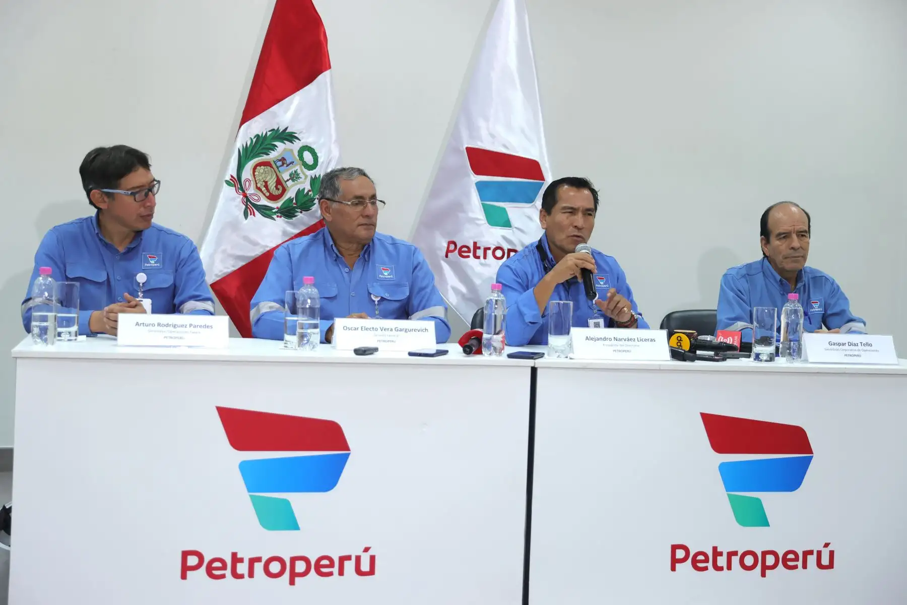 05/12/2024 El presidente del Directorio de PetroPerú, Alejandro Narvaez, junto al gerente general, Oscar Vera, el gerente de operaciones de refinería Talara, Arturo Rodríguez y el gerente de operaciones de PetroPeru Gaspar Días ofrecen conferencia de prensa..