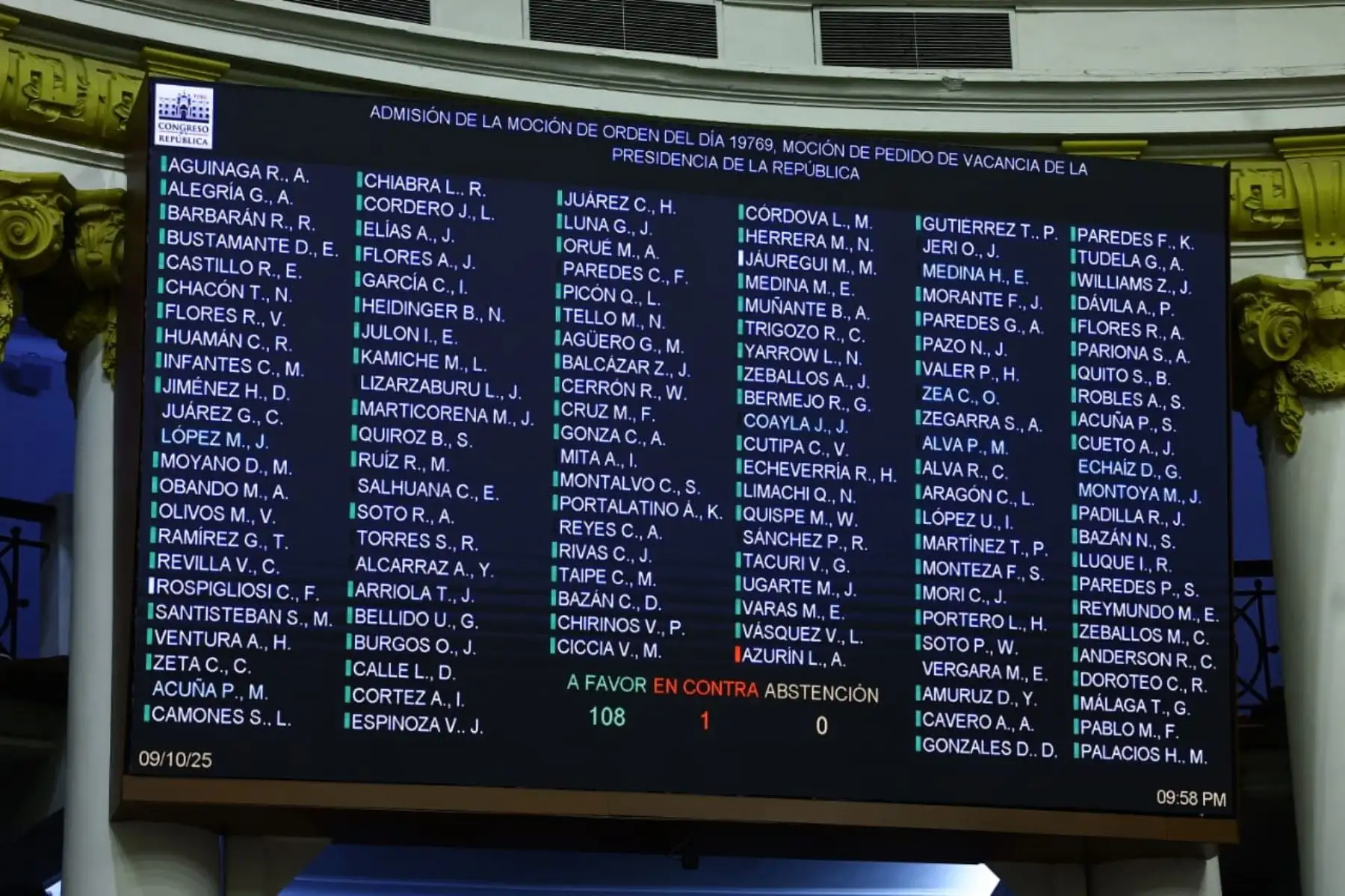 09/10/2025 Con 114 votos a favor, la representación nacional aprobó la admisión de la Moción 19769, que propone la vacancia de la presidenta de la República, Dina Boluarte Zegarra. Foto: Congreso