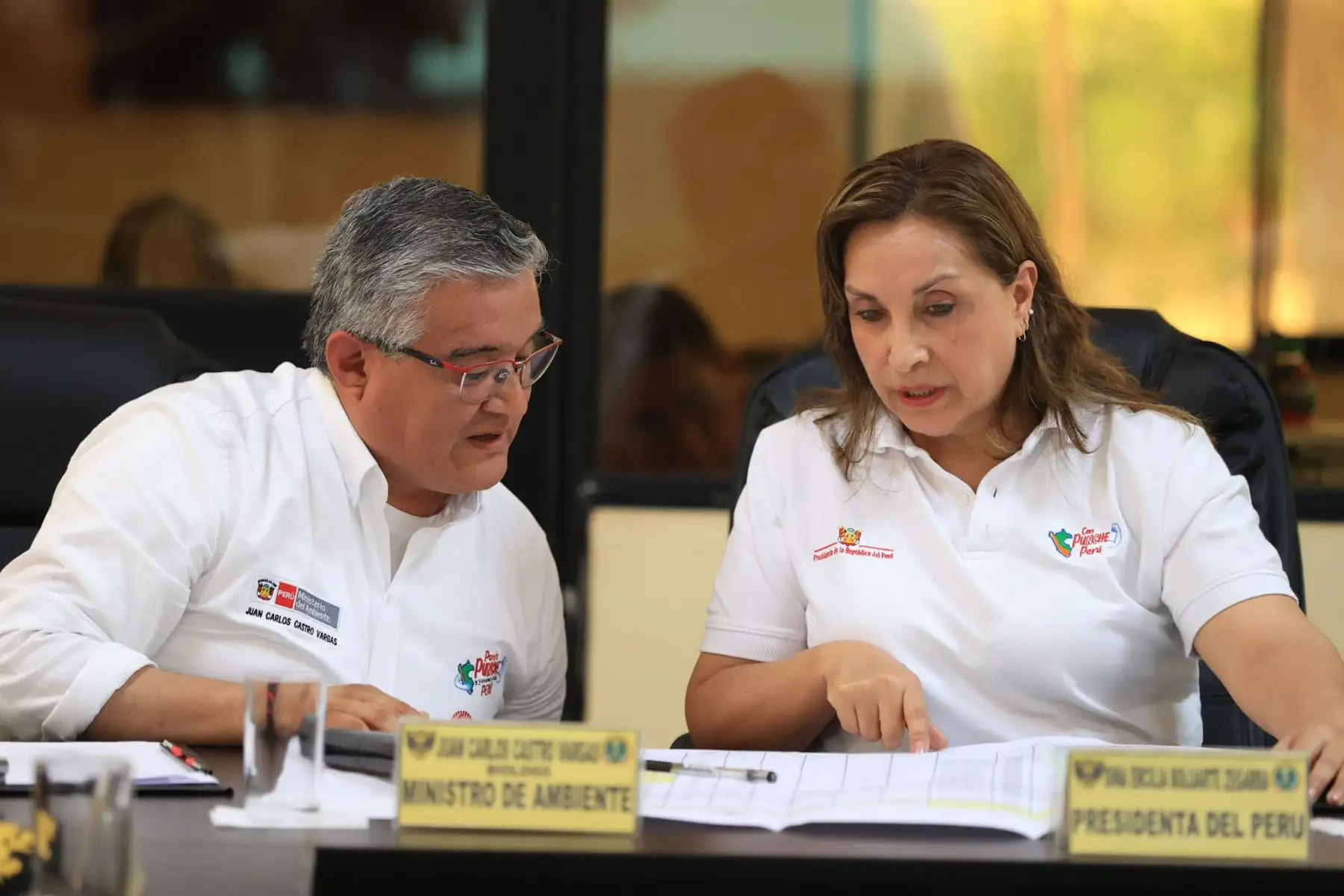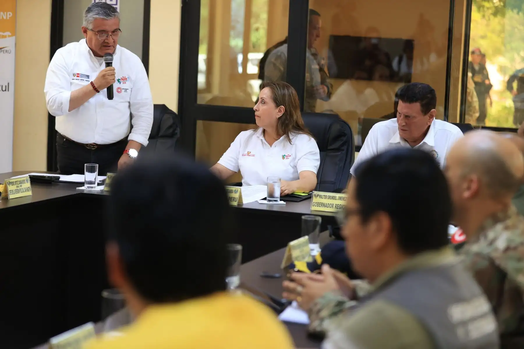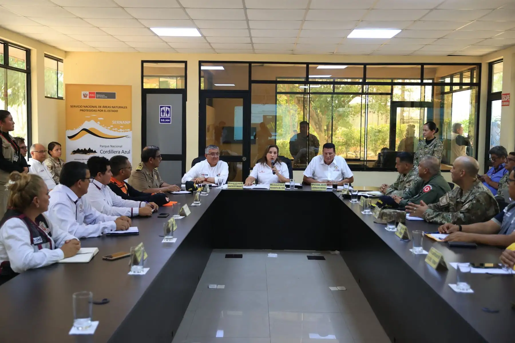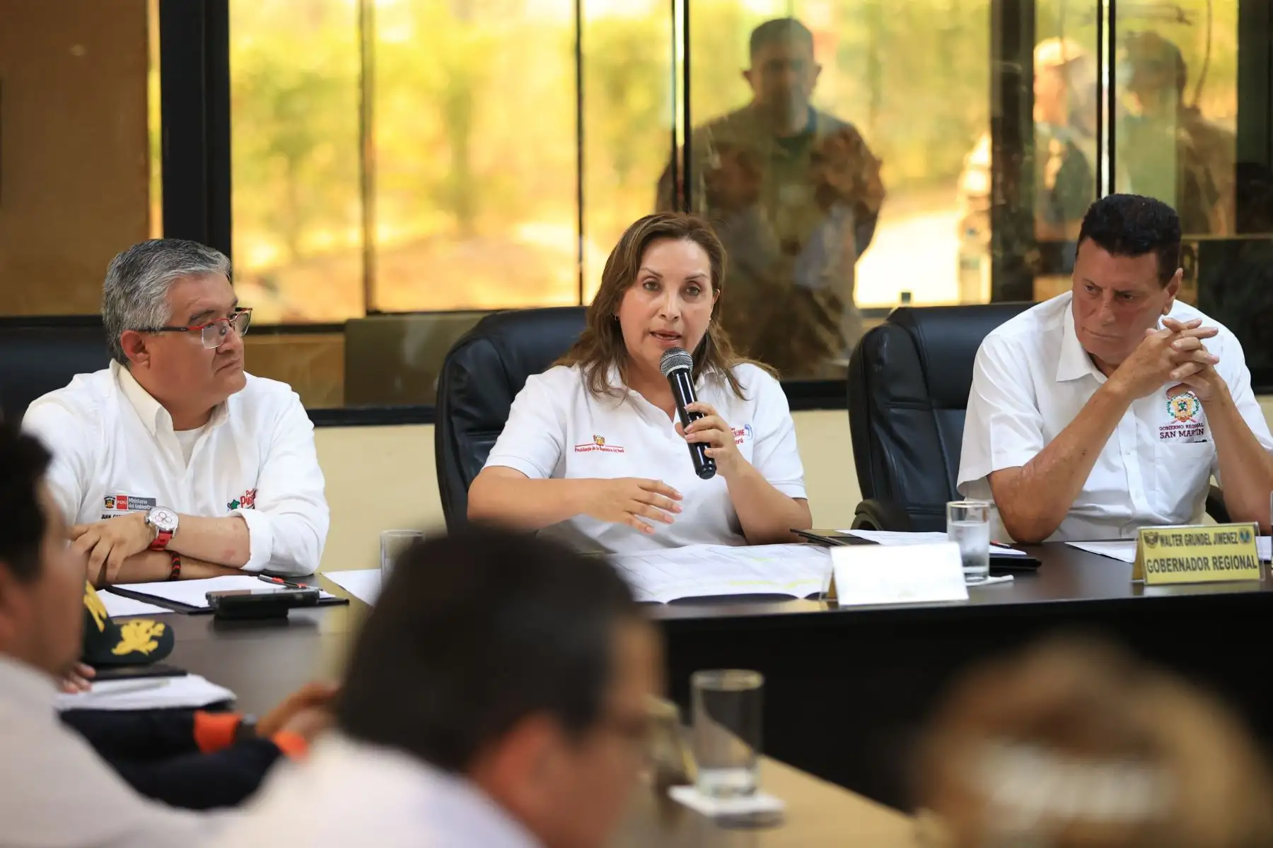 19/09/2024 En el Centro de Operaciones de Emergencia Regional San Martín, la presidenta de la república, Dina Boluarte, junto al ministro del Ambiente, gobernador regional de San Martín e INDECI, evalúa las medidas para mitigar los 9 focos que aún se mantienen activos. En la región se han extinguido más del 70 % de siniestros gracias a las intervenciones coordinadas por el Gobierno. Foto: ANDINA/Prensa Presidencia
