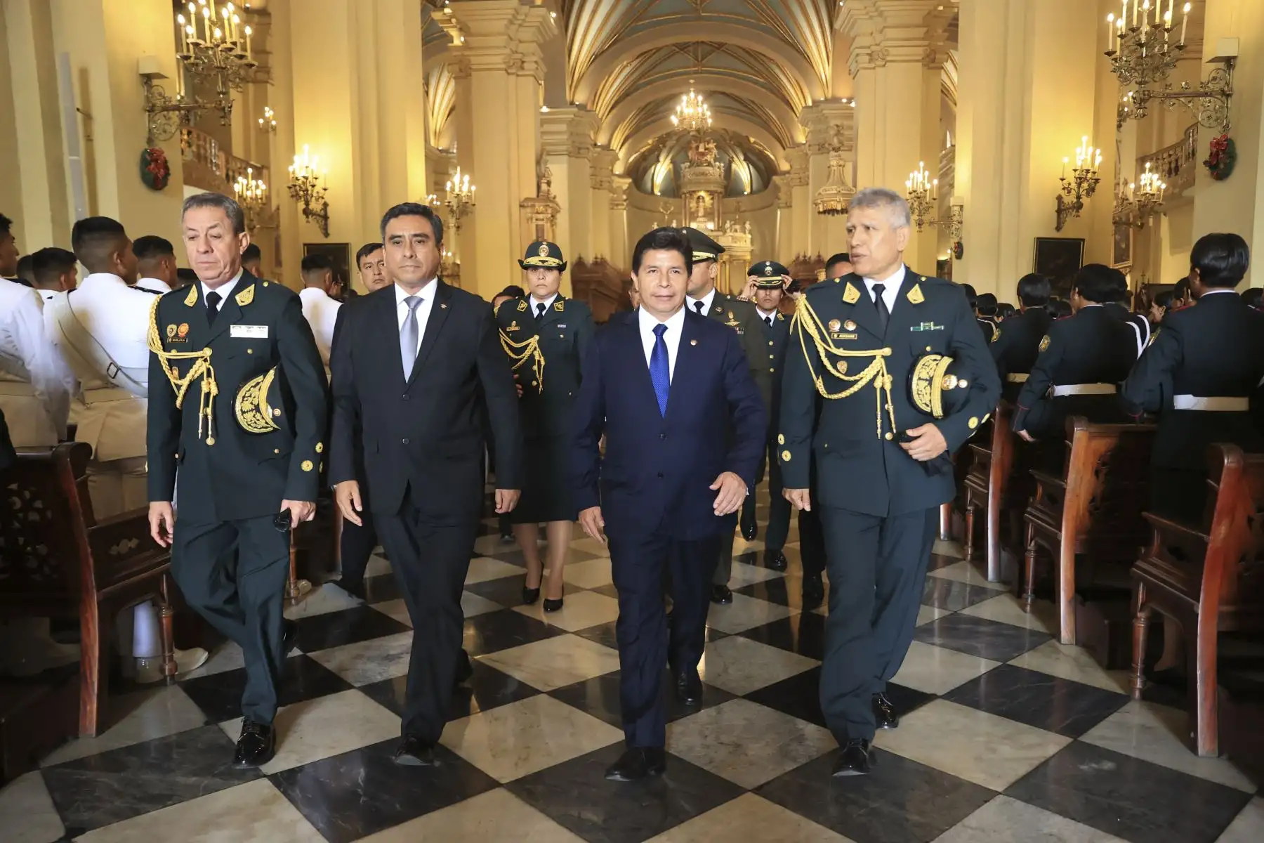 05/12/2022 El presidente Pedro Castillo, acompañado por el Ministro de Interior, Willy Huerta y las altas autoridades Policiales, participaron de la misa en el marco de las actividades por el 34.° aniversario de creación institucional de la Policía Nacional del Perú. El acto se llevó a cabo en la Catedral de Lima. Foto: ANDINA/ Presidencia Perú